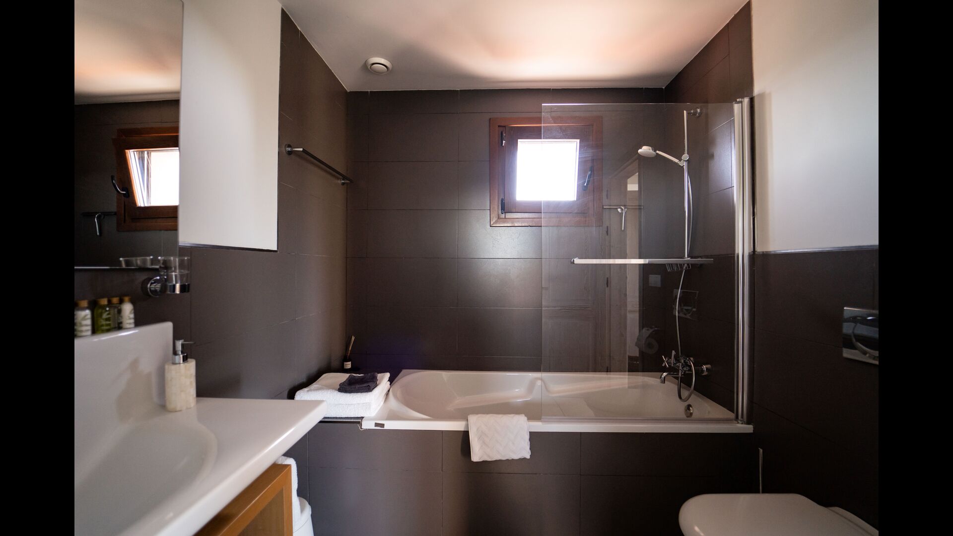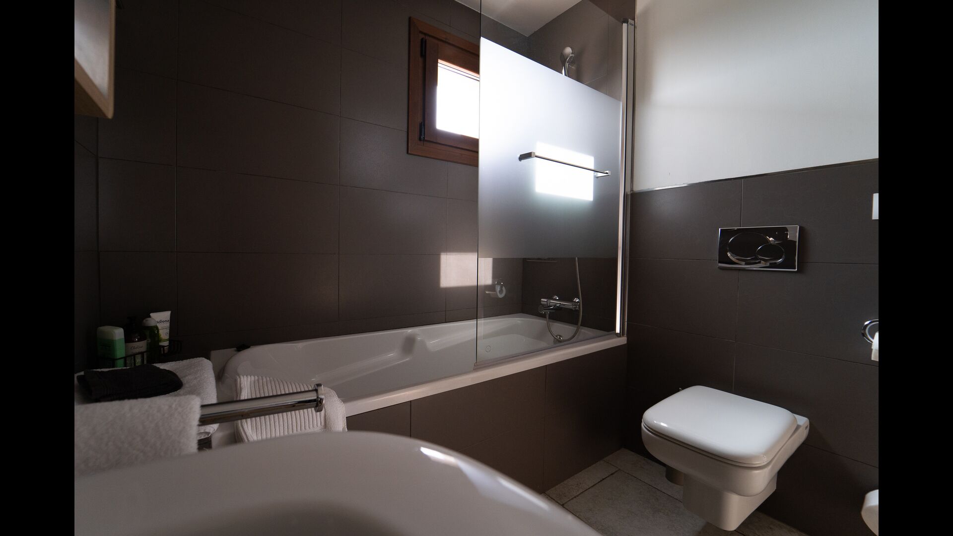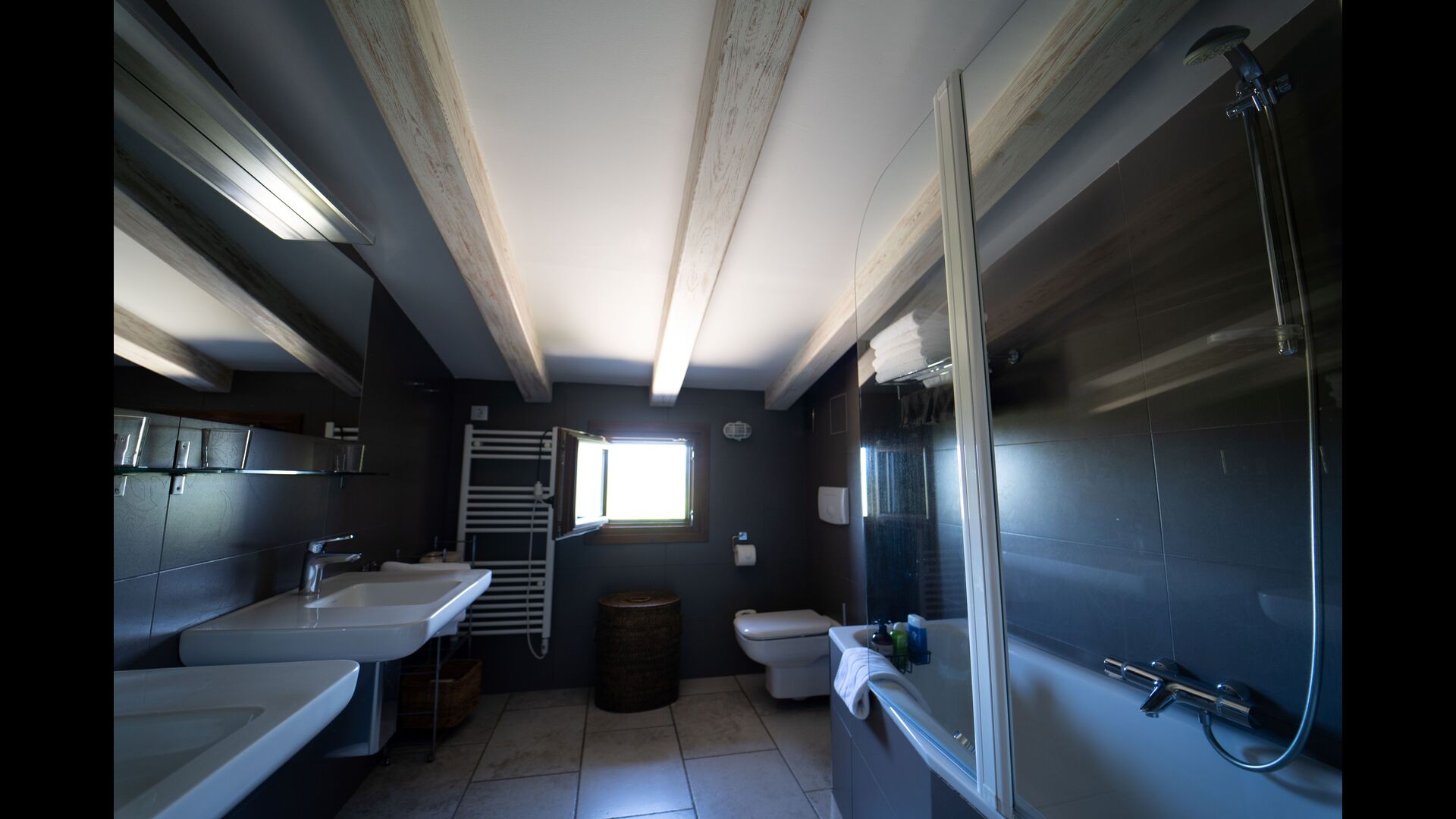 Comparten baño equipado con bañera, wc, dos lavabos, wc, secador de pelo, espejo de aumento y artículos de aseo gratuitos. Accesible por escaleras.