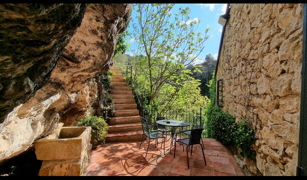 La casa tiene varios niveles y la mayoría de las habitaciones dan a la cascada. Debajo de la planta principal dedicada al comedor, cocina y rincón de sofás, se encuentran dos dormitorios y un baño. Directamente desde la cocina, tiene acceso a la acogedora y soleada "terraza matutina", con una hermosa vista a la cascada.