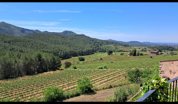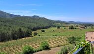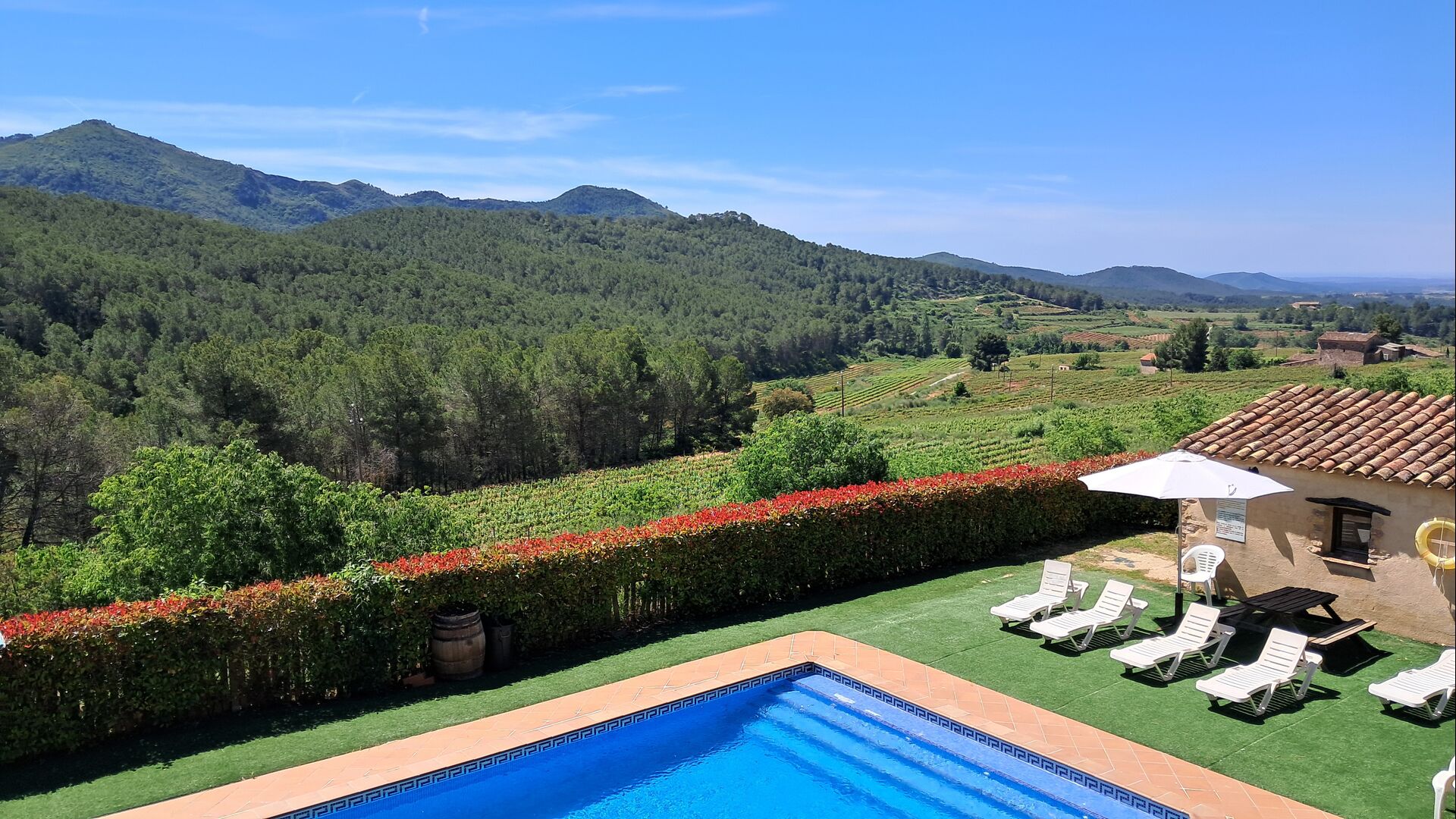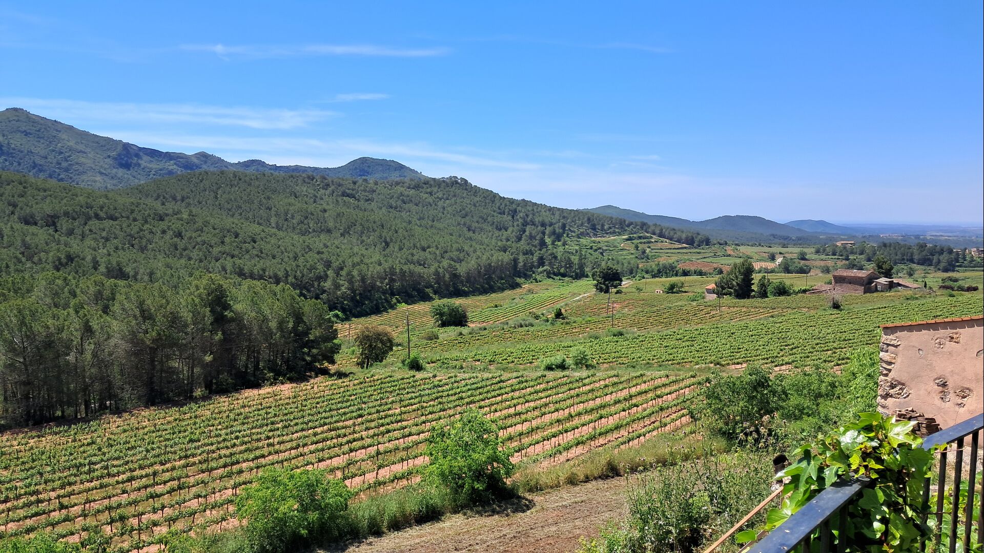 Después de algunos kilómetros en el camino tranquilo a través del paisaje de estilo toscano con viñedos hasta donde alcanza la vista, Can Puignoll emerge en una pequeña colina en la cima de una carretera lateral.
