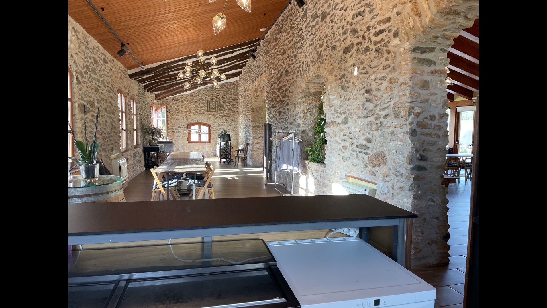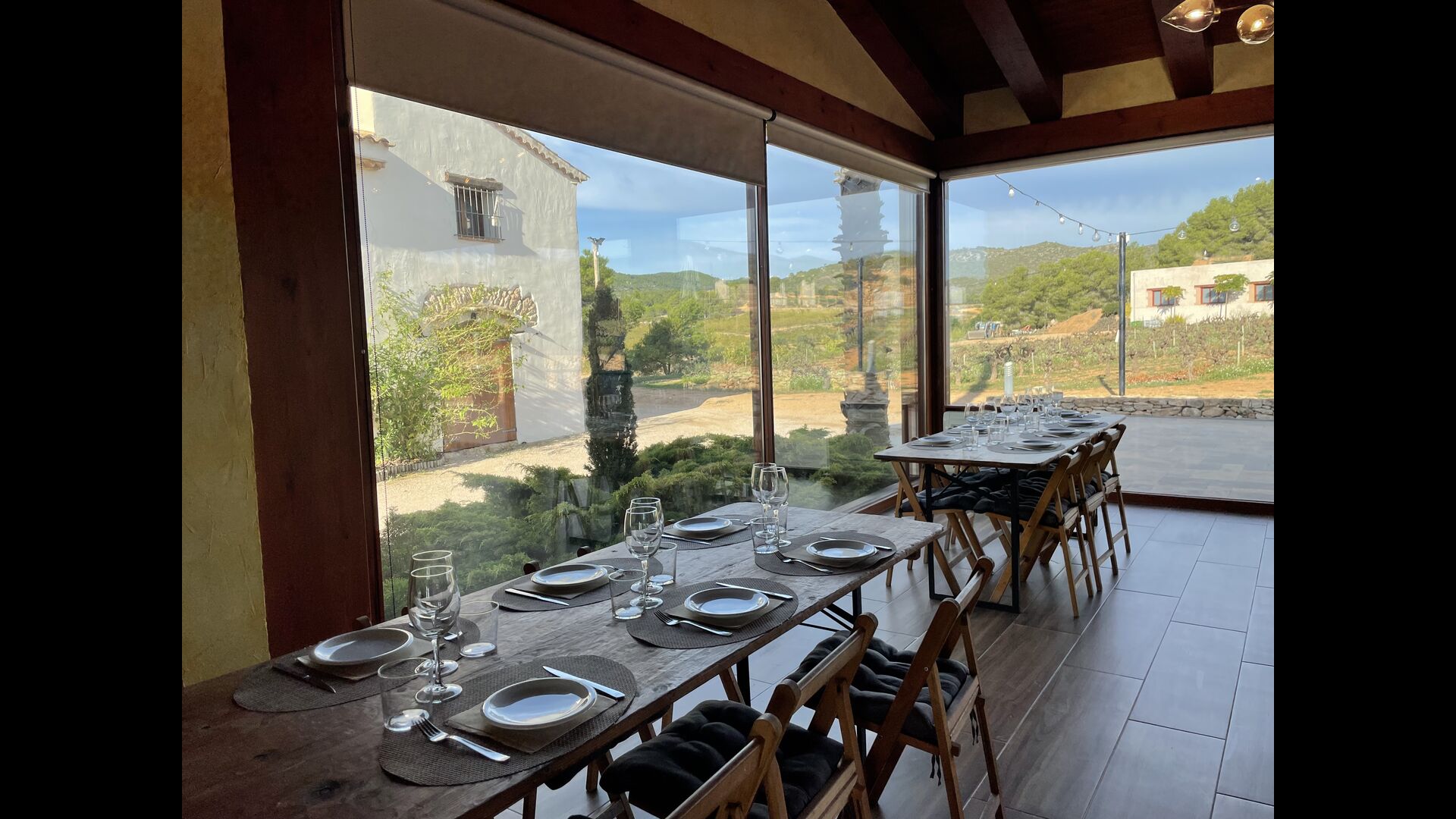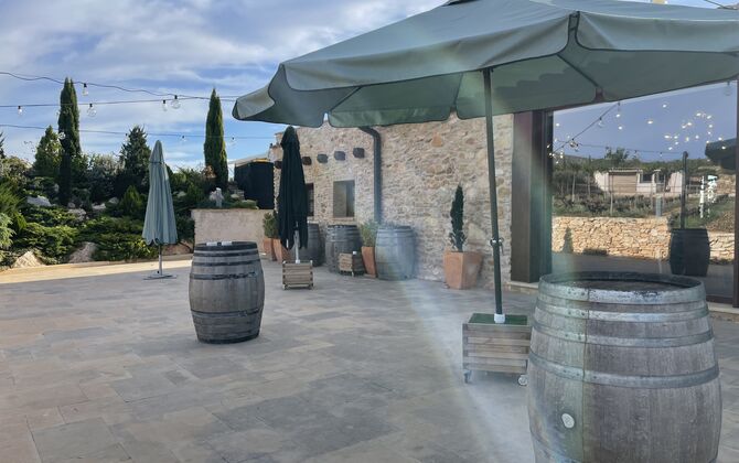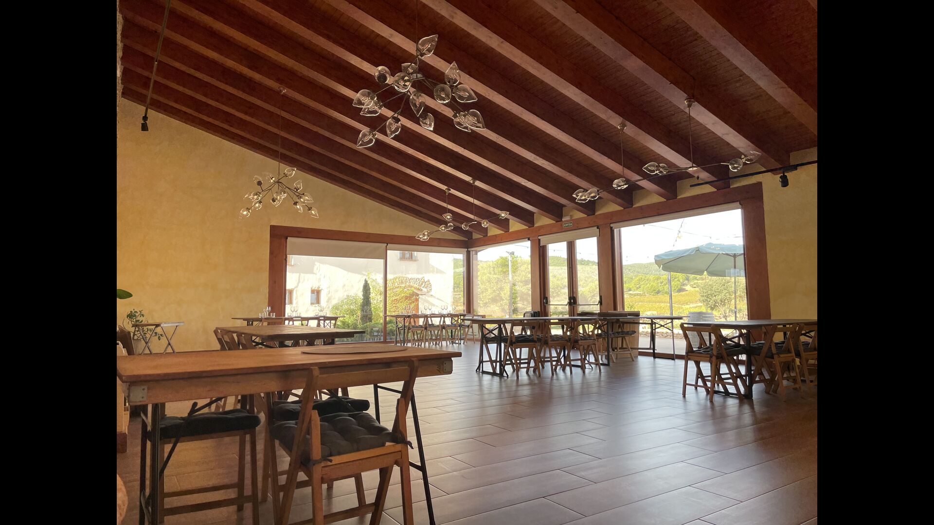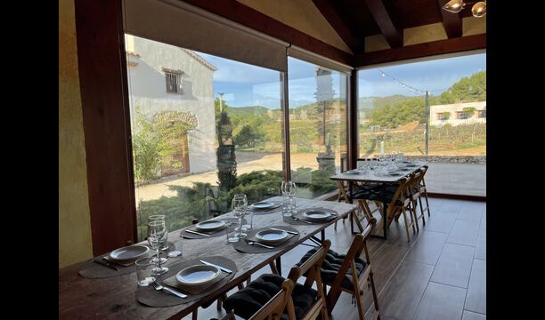 Está situado justo enfrente de los viñedos de Cristina y Pere y, a menudo,el evento se traslada al exterior en la terraza o incluso en los viñedos. En el interior, las grandes ventanas panorámicas proporcionan la alfombra perfecta para su celebración, con vistas a los viñedos y la puesta de sol.