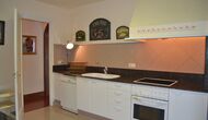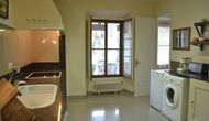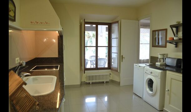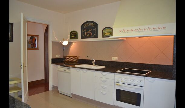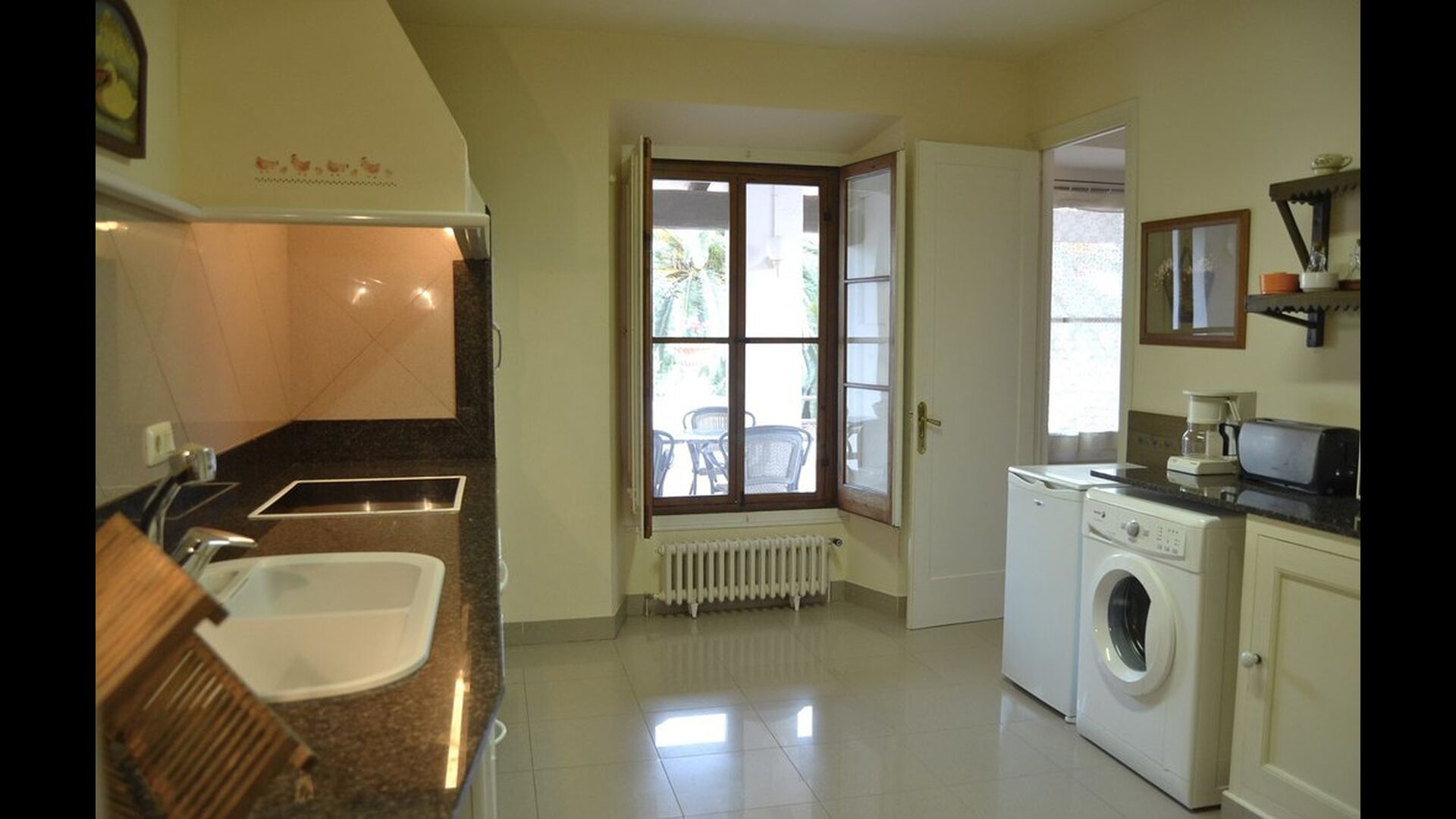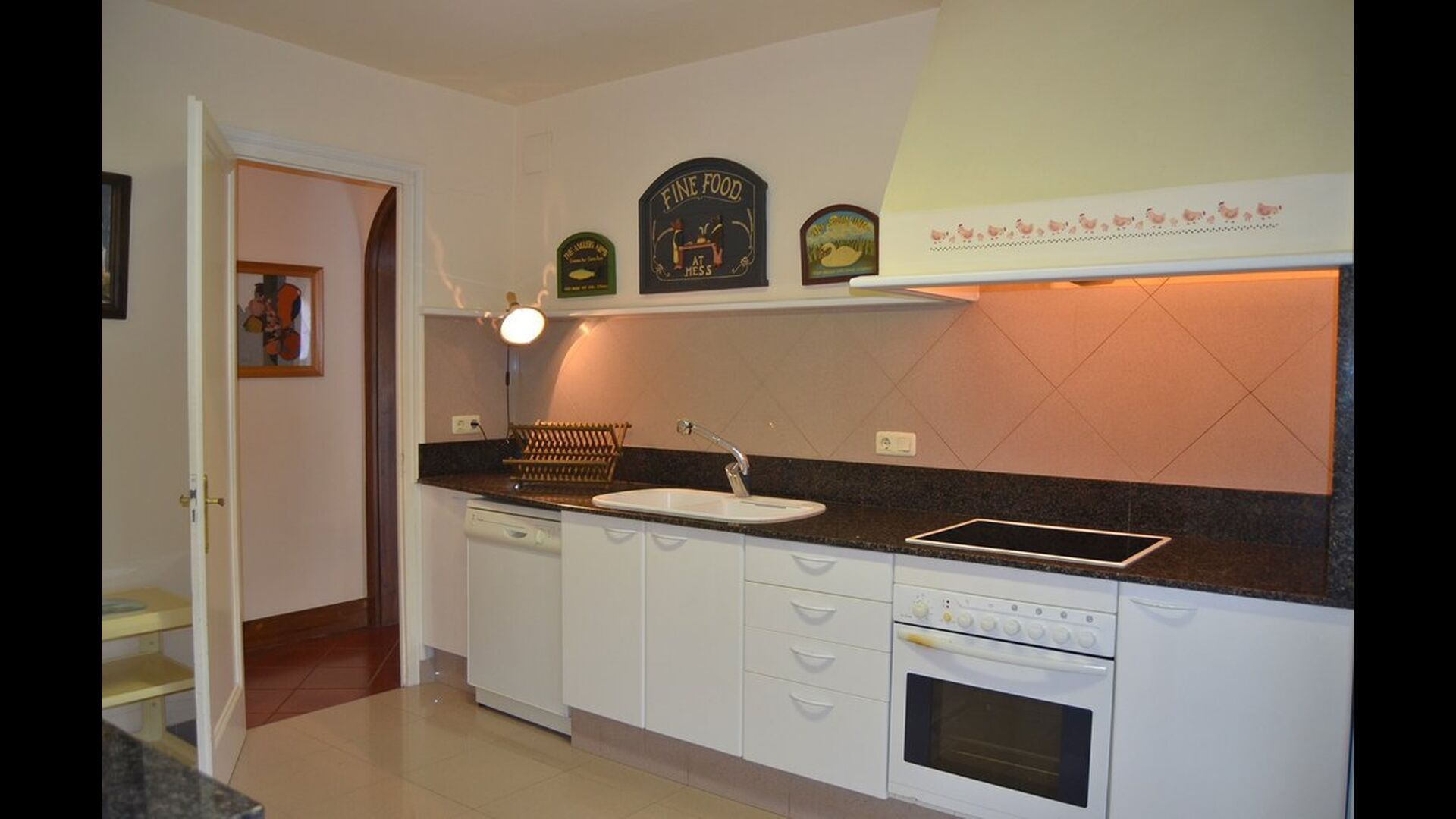 También en este piso, hay una cocina bien equipada con estufa, placas de cerámica, lavavajillas, lavadora, cafetera, tostadora, microondas, congelador y utensilios de cocina.