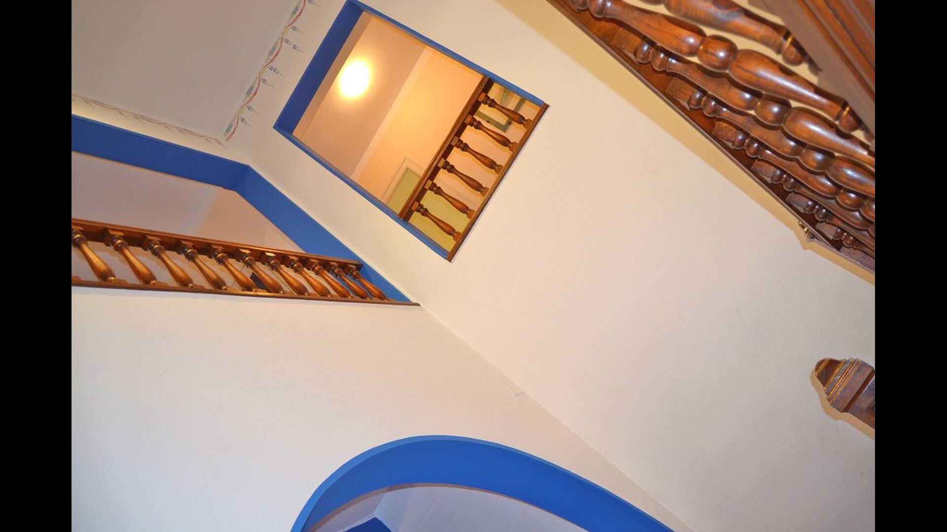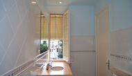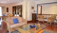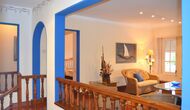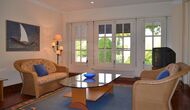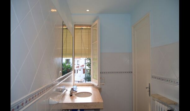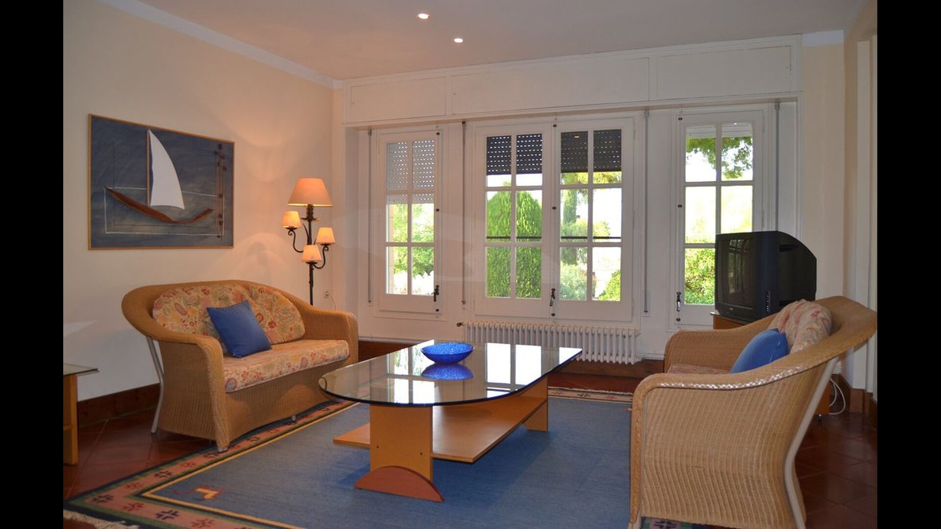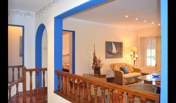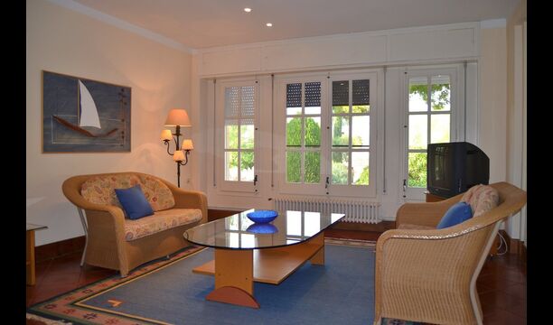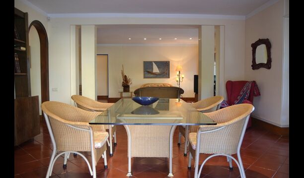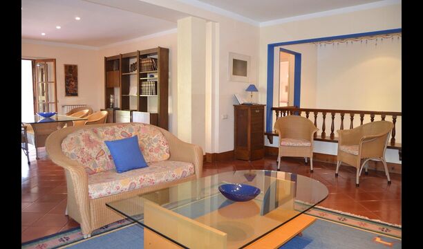 El resto del piso es un área común muy grande decorada en estilo marítimo con una sala de estar con TV y DVD y un área de comedor con una gran mesa de comedor. Desde aquí, puede acceder a la gran terraza del primer piso con una mesa para comer al aire libre y una hermosa vista. Como el borde no es tan alto, no recomendamos esta casa a familias con niños más pequeños.
