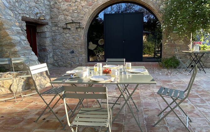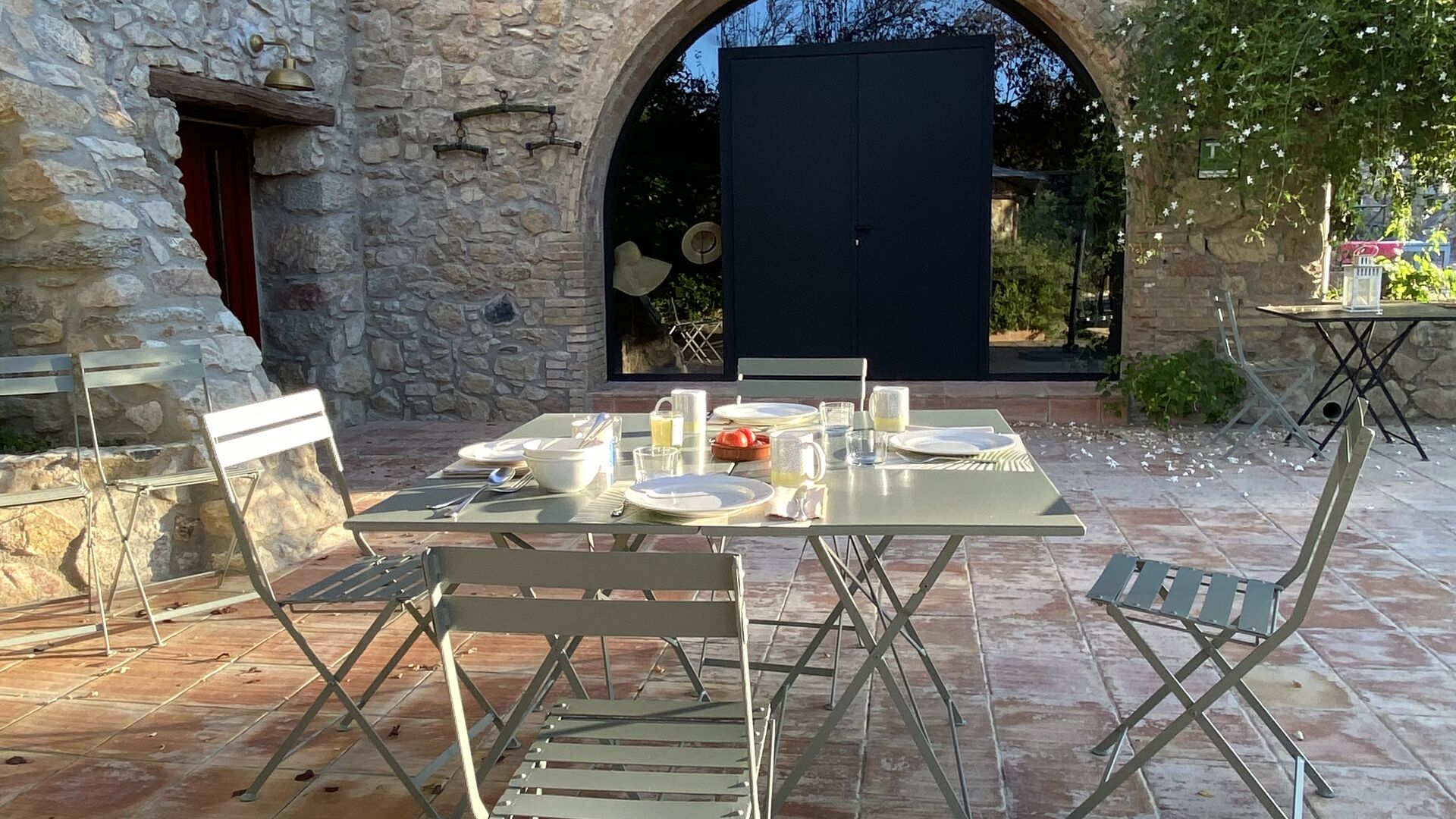 Frente a la puerta de entrada de la casa, en el jardín, hay una espacio de uso exclusivo con mesa y sillas -ideal para comidas al aire libre-, sombrilla y tumbonas; y a escasos metros, en amplísimos espacios compartidos, más de un porche, un solarium con tumbonas, terrazas</ strong>, dos barbacoas móviles y dos fijas, la piscina y el jacuzzi. Es muy fácil encontrar la privacidad y comodidad que deseas. El Mas puede ofrecer servicio de desayuno y cocina.