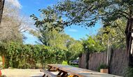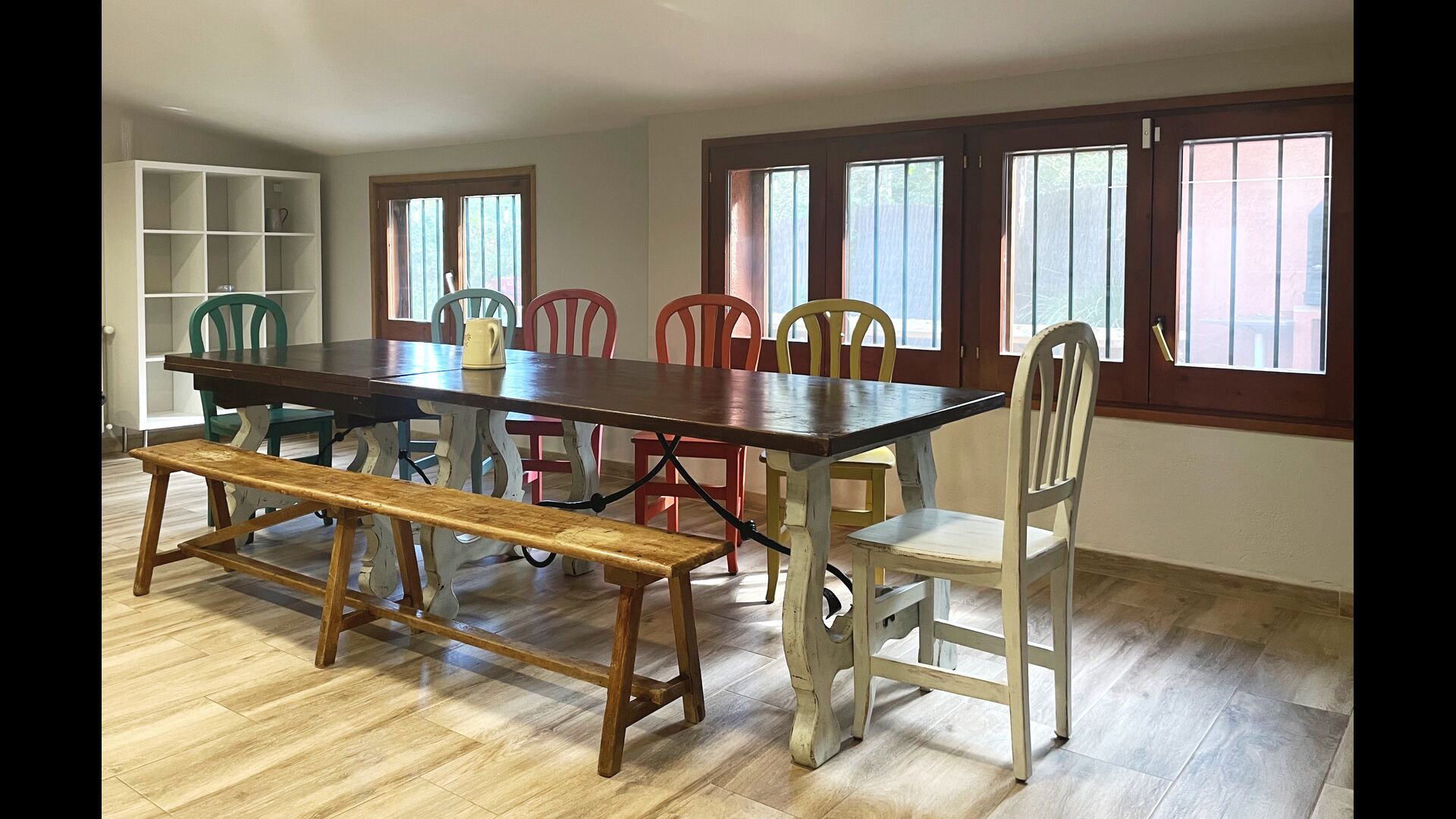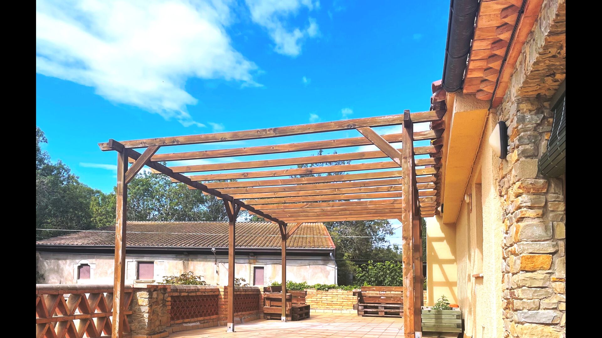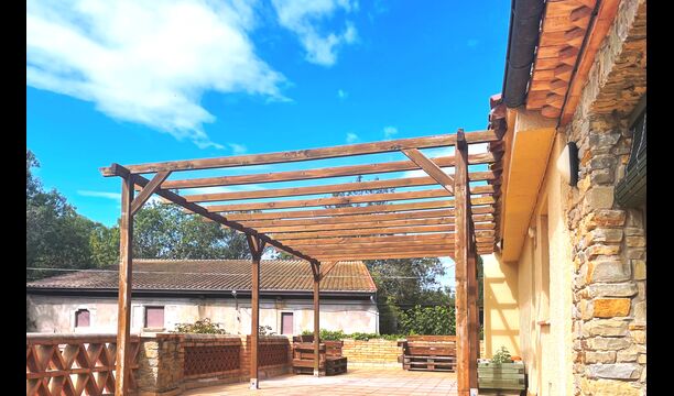 La terraza está situada de manera que puedas vigilar fácilmente la piscina y el resto del jardín, y también está cerca de la barbacoa que está situado en el patio. El patio es ideal para sus comidas, ya que también hay una mesa grande y luego se conecta directamente a la cocina.