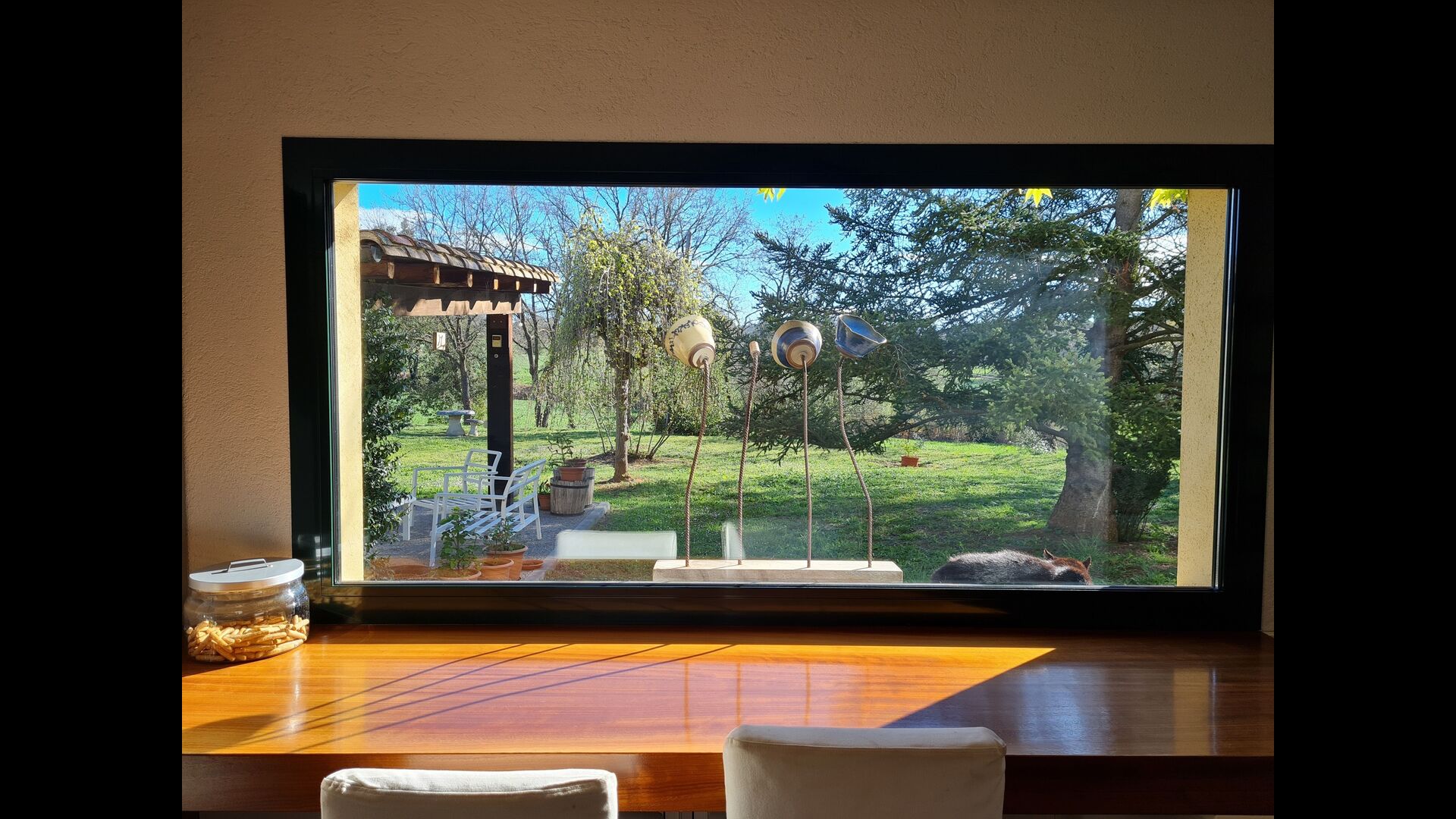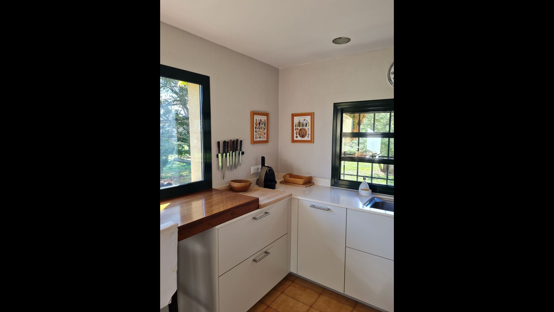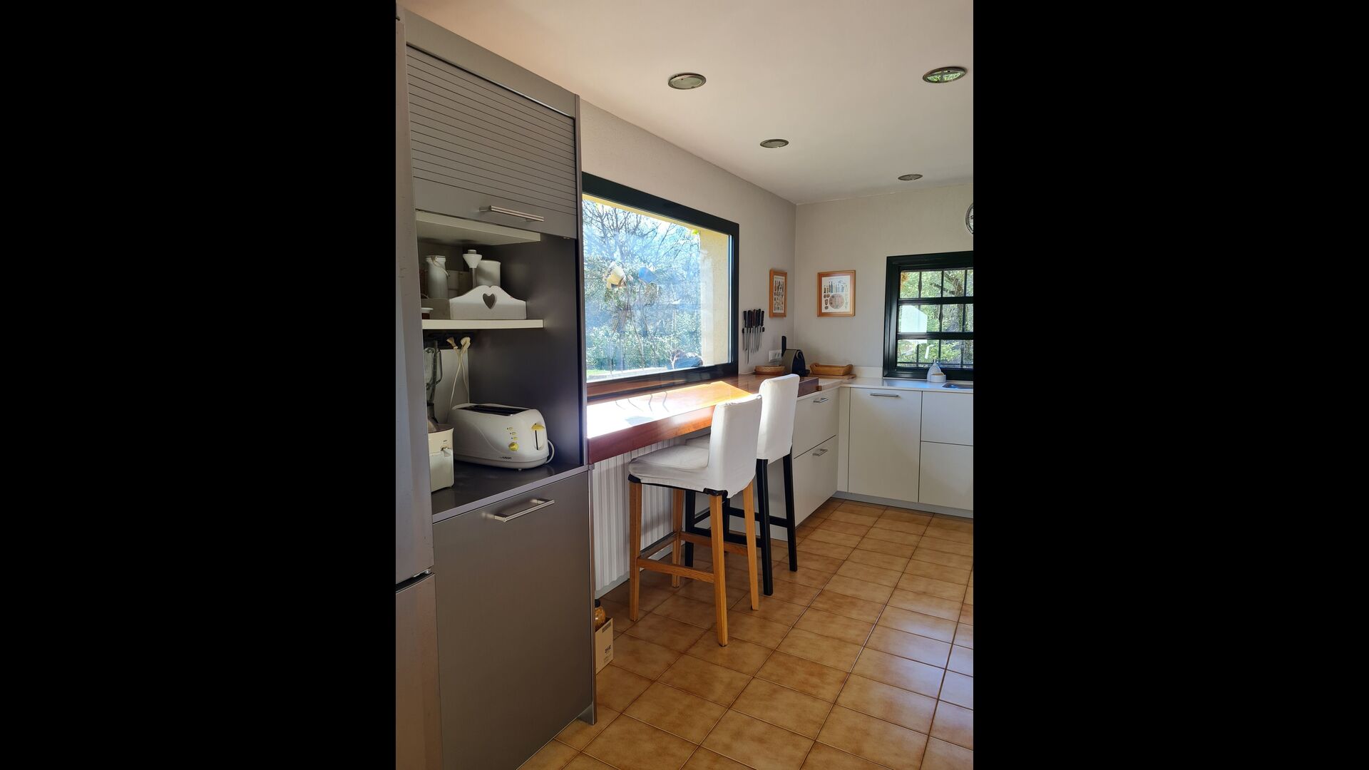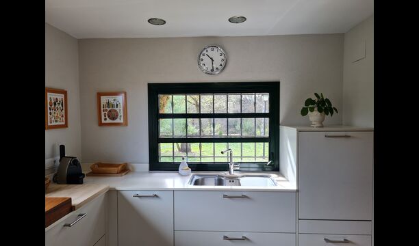 La casa cuenta con un amplio comedor, ideal para reuniones familiares, y una cocina totalmente equipada con grandes ventanales que inundan el espacio de luz natural y calidez.