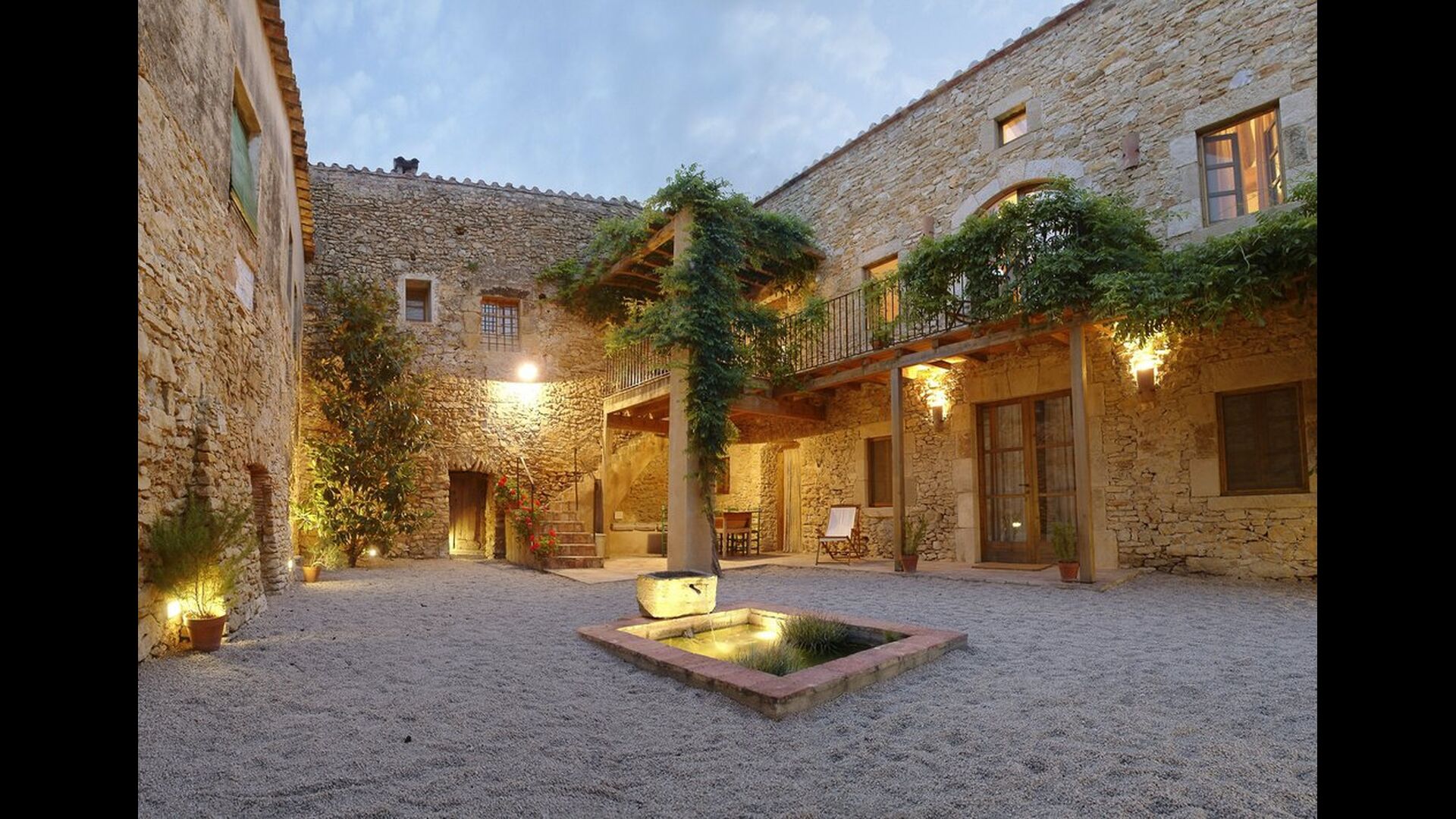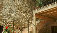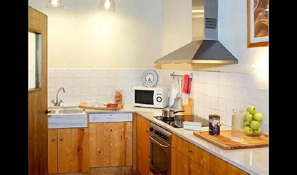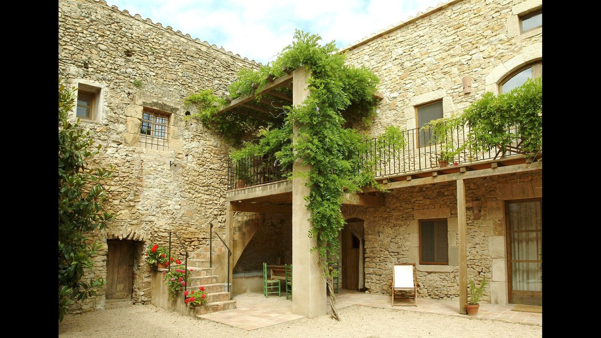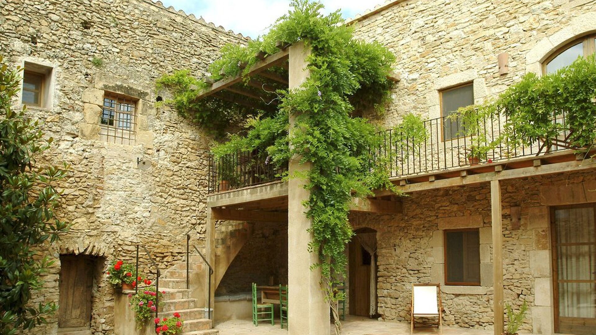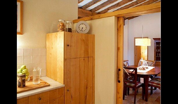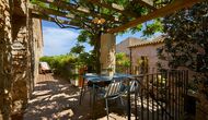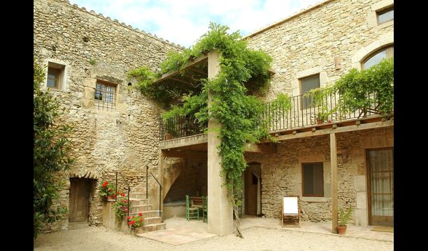 Este apartamento del primer piso se encuentra en el lado superior derecho del gran patio que se encuentra después de la gran puerta de madera. El patio y las casas están construidas en piedra, lo que le da un ambiente rústico y auténtico. Este apartamento tiene un acogedor patio cubierto en el patio, donde es obvio disfrutar de las comidas caseras durante las cálidas noches catalanas. Durante el día, también es un lugar perfecto para relajarse, ya que hay una sombra refrescante.
