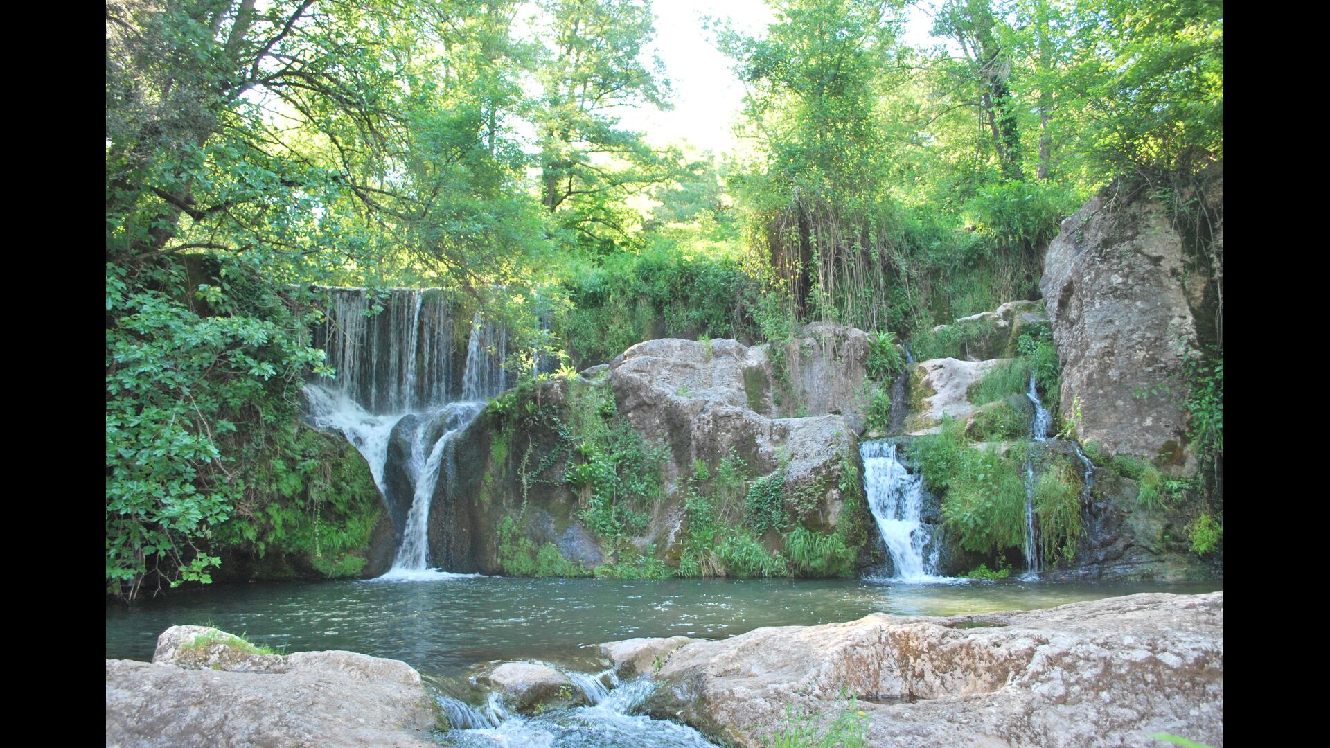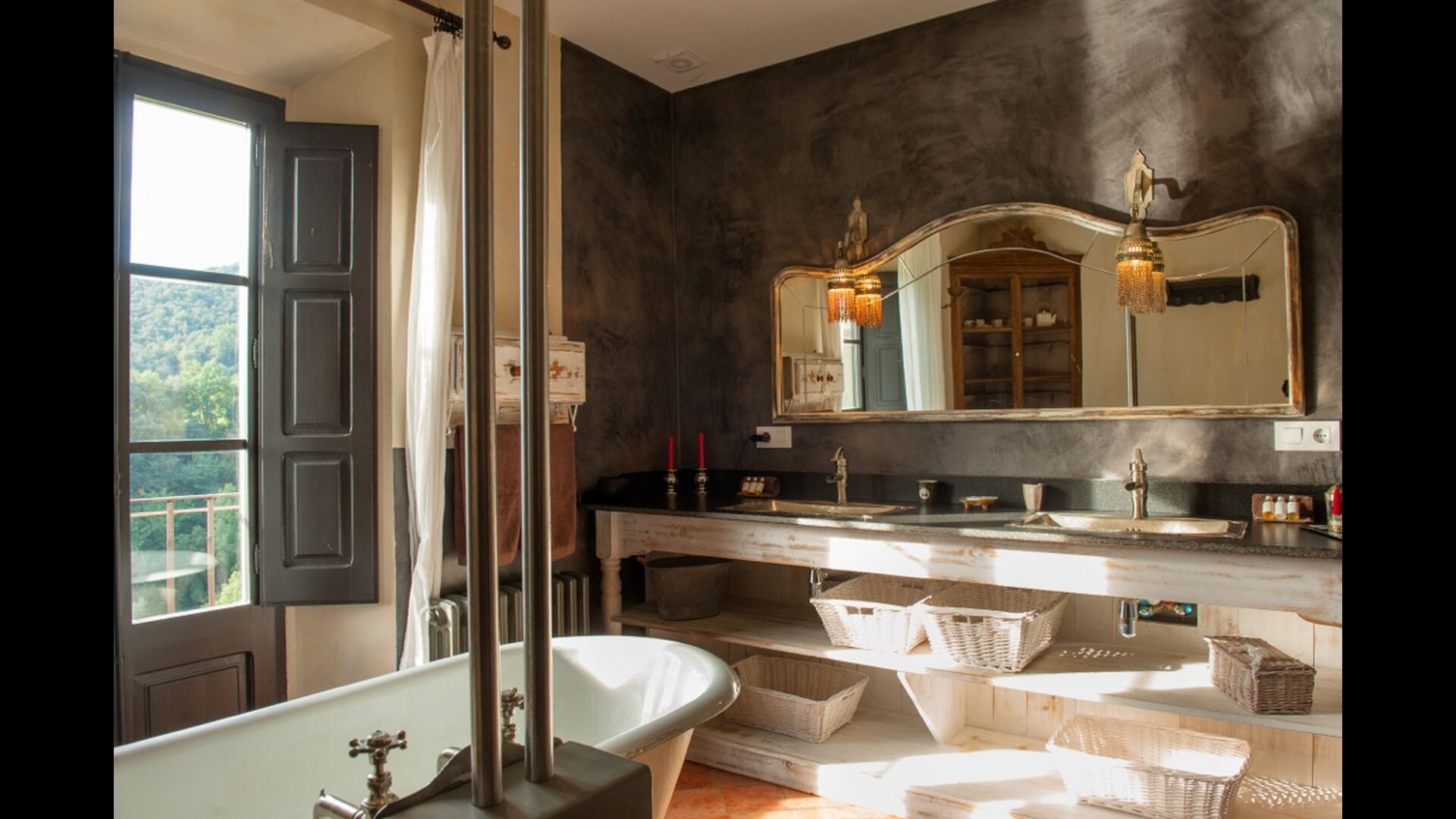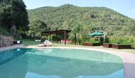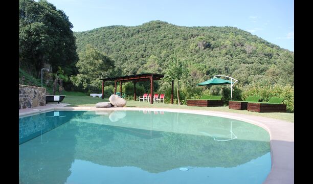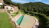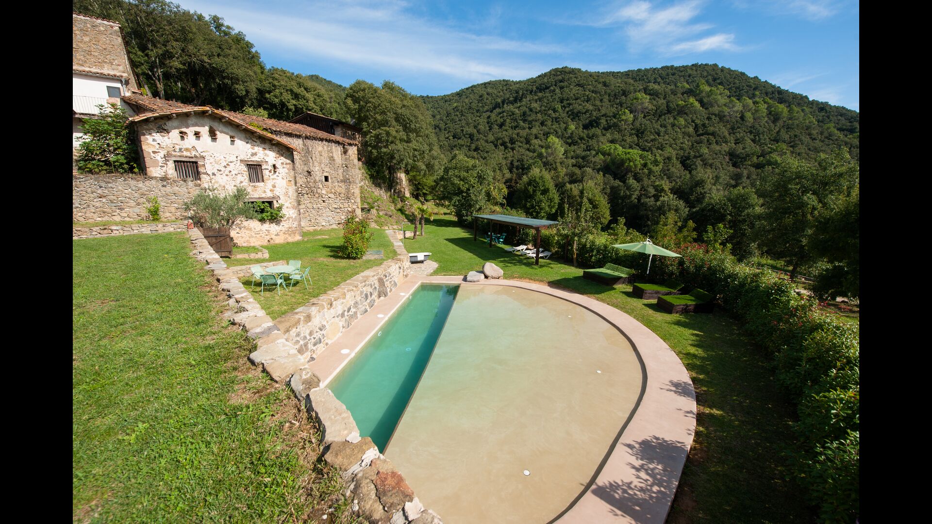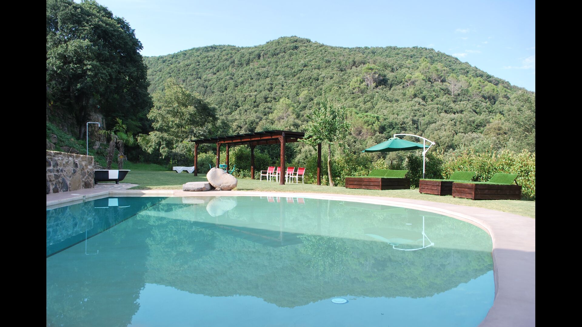 En el exterior encontraréis un porche, jardines, piscina, barbacoa y la sombra de unos árboles centenários. La piscina, como prácticamente todo ha sido diseñada por los propietarios y es perfecta para los niños ya que simula una pequeña playa. Y a sólo tres minutos andando desde la casa hay un rio con una cascada natural donde os podréis zambullir.