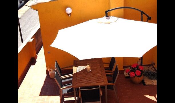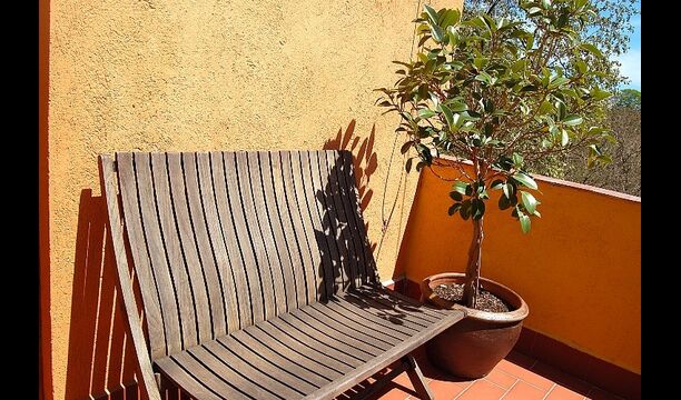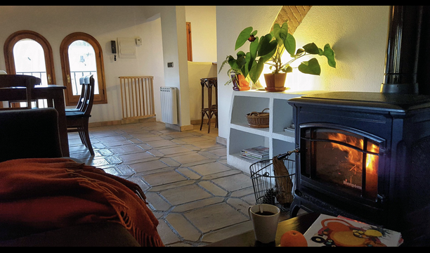 El ático tiene dos habitaciones dobles, una de ellas con baño y un baño independiente con bañera y espacio para cambiar a los bebés. El salón es una amplia zona que combina comedor y sala de estar, con una chimenea de leña y una cocina completamente equipada. También hay un rincón donde se puede disfrutar de los momentos de relax, con una butaca, estanterías con libros. La cocina da a una terraza privada que comunica este apartamento con el jardín.