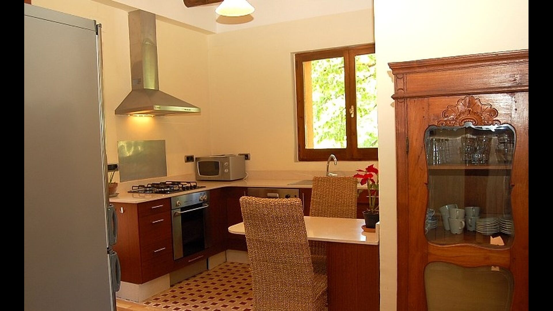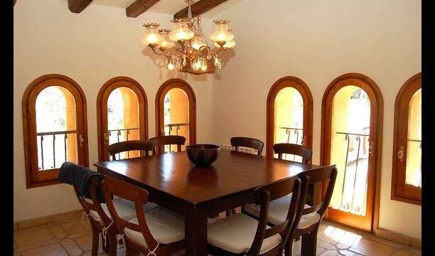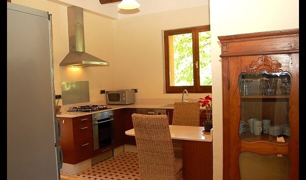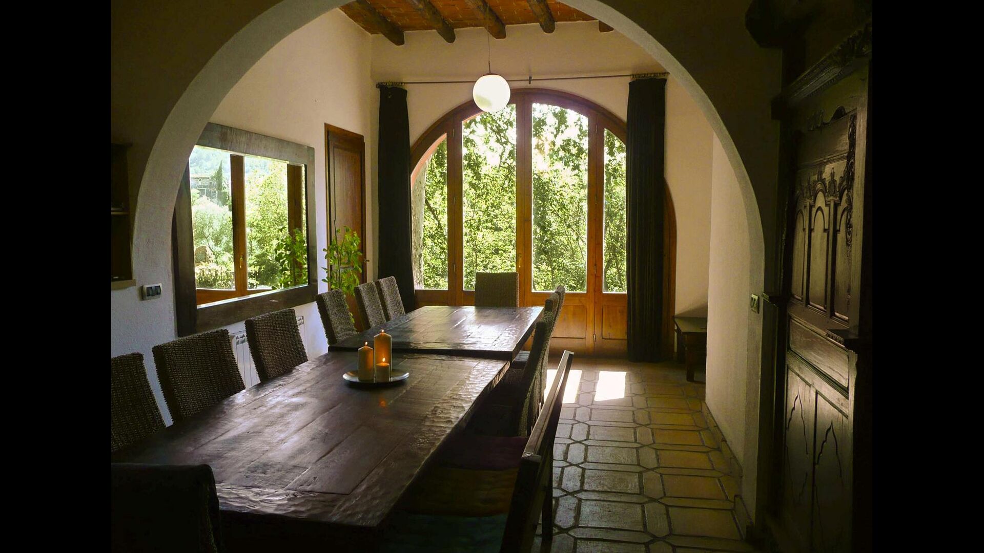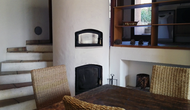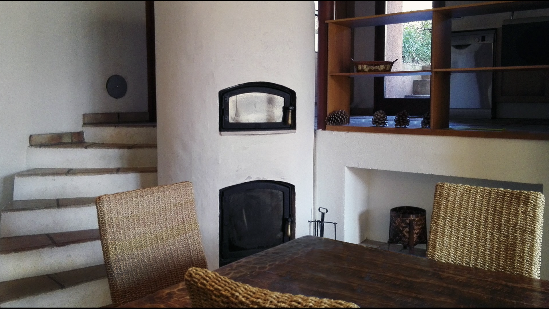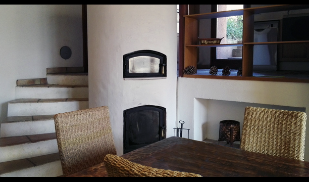 El piso de abajo tiene dos habitaciones dobles, un baño y un gran comedor con capacidad para todos. Esta planta tiene un chimenea de leña con horno incluido (horno masivo). La cocina está abierta y totalmente equipada, tiene salida directa al jardín para poder comer fuera. Una de las habitaciones está inspirada en el lejano oriente, y tiene una puerta corredera preciosa de madera trabajada a mano en Indonesia.