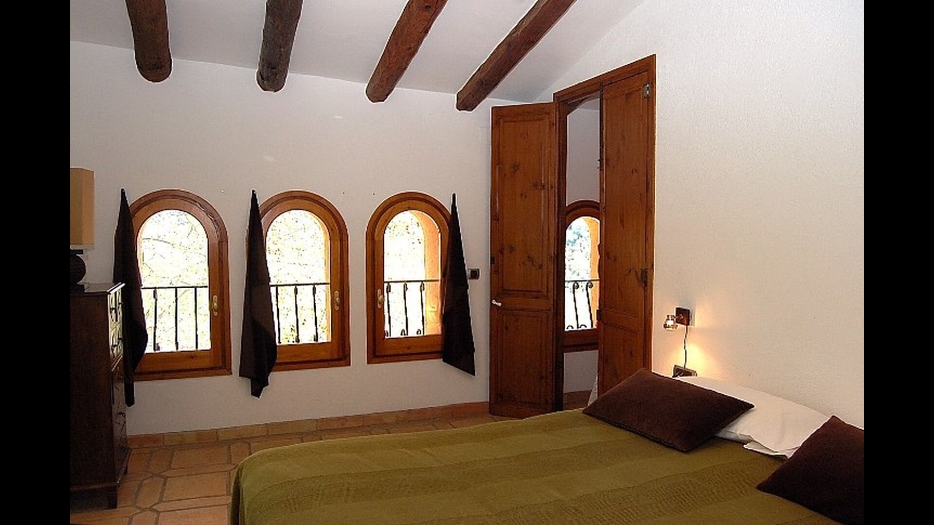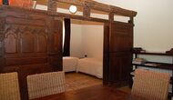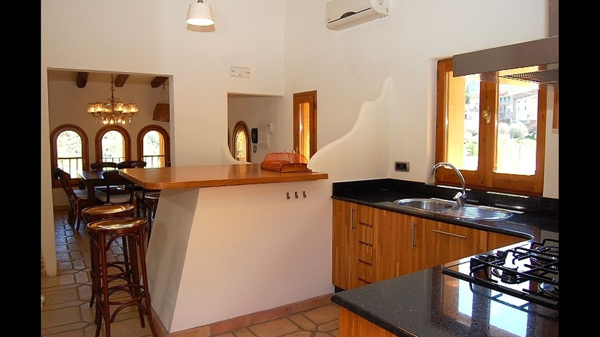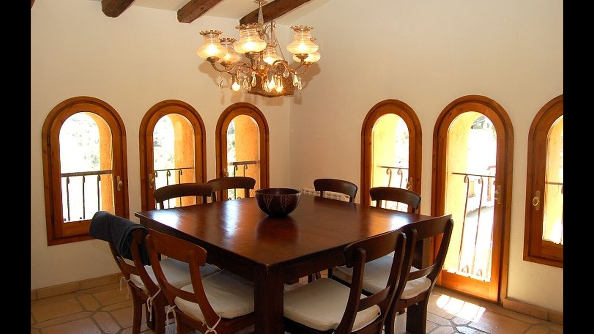 El piso de abajo tiene dos habitaciones dobles, un baño y un gran comedor con capacidad para todos. Esta planta tiene un chimenea de leña con horno incluido (horno masivo). La cocina está abierta y totalmente equipada, tiene salida directa al jardín para poder comer fuera. Una de las habitaciones está inspirada en el lejano oriente, y tiene una puerta corredera preciosa de madera trabajada a mano en Indonesia.