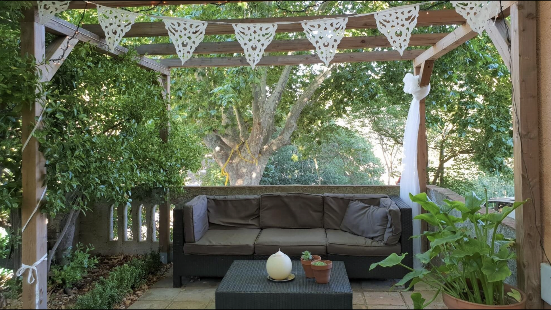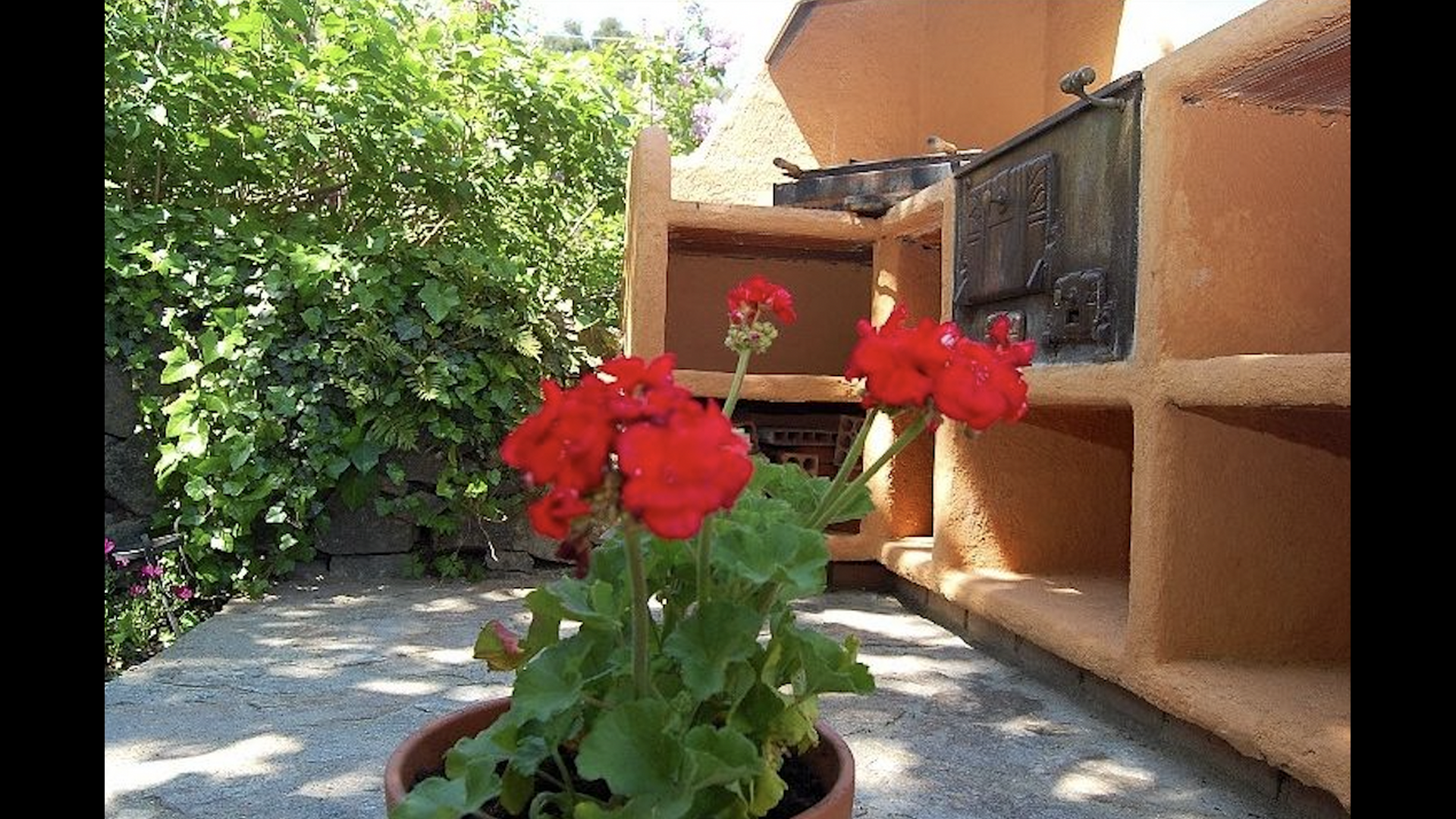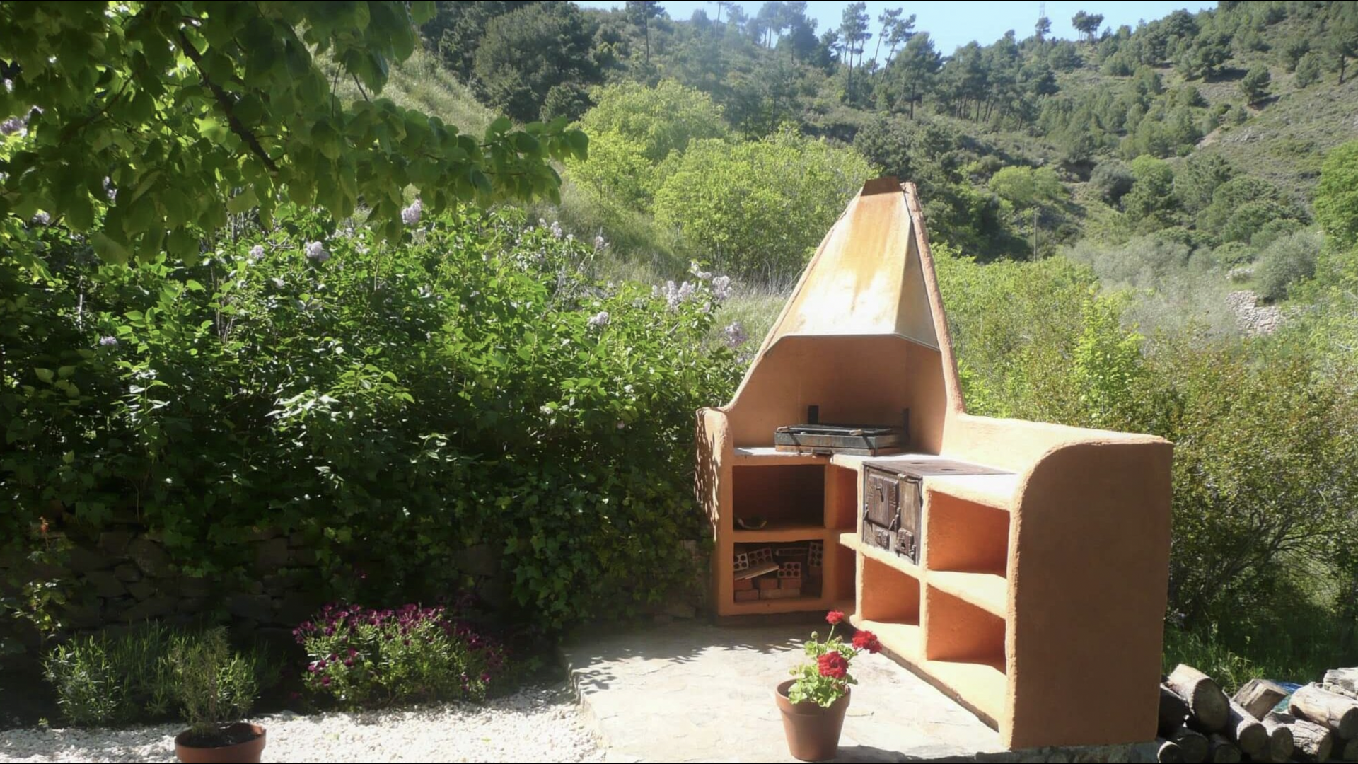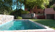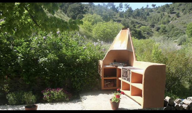El jardín está dividido en dos zonas, la primera, donde hay la terraza con su barbacoa y el equipo para hacer paellas y las mesas donde se puede comer hasta 15 personas juntas. Todo bajo la sombra proporcionada por un enorme tilo. La segunda es la zona de la piscina, al solecito, con las hamacas durante todo el año. Hay una rincón con sofás y una mesa para tomar el aperitivo, mientras que los niños juegan en el tobogán.