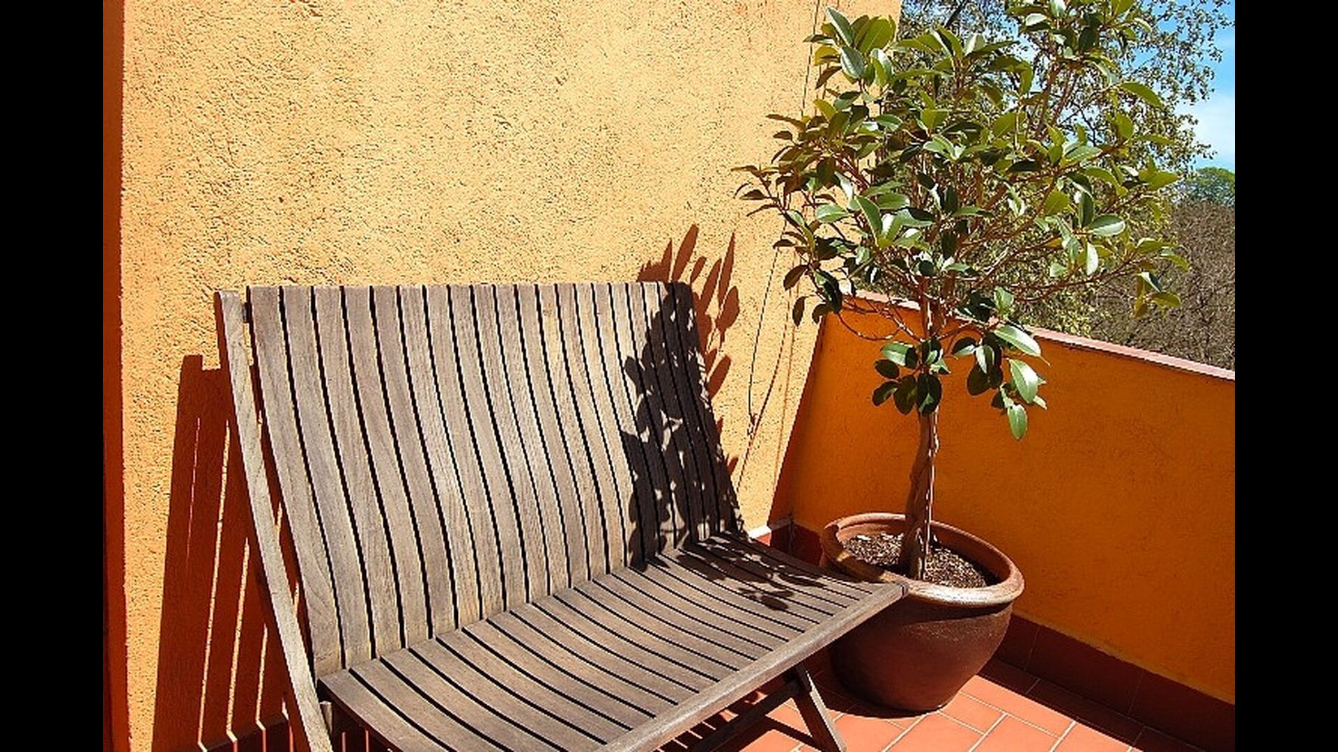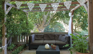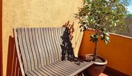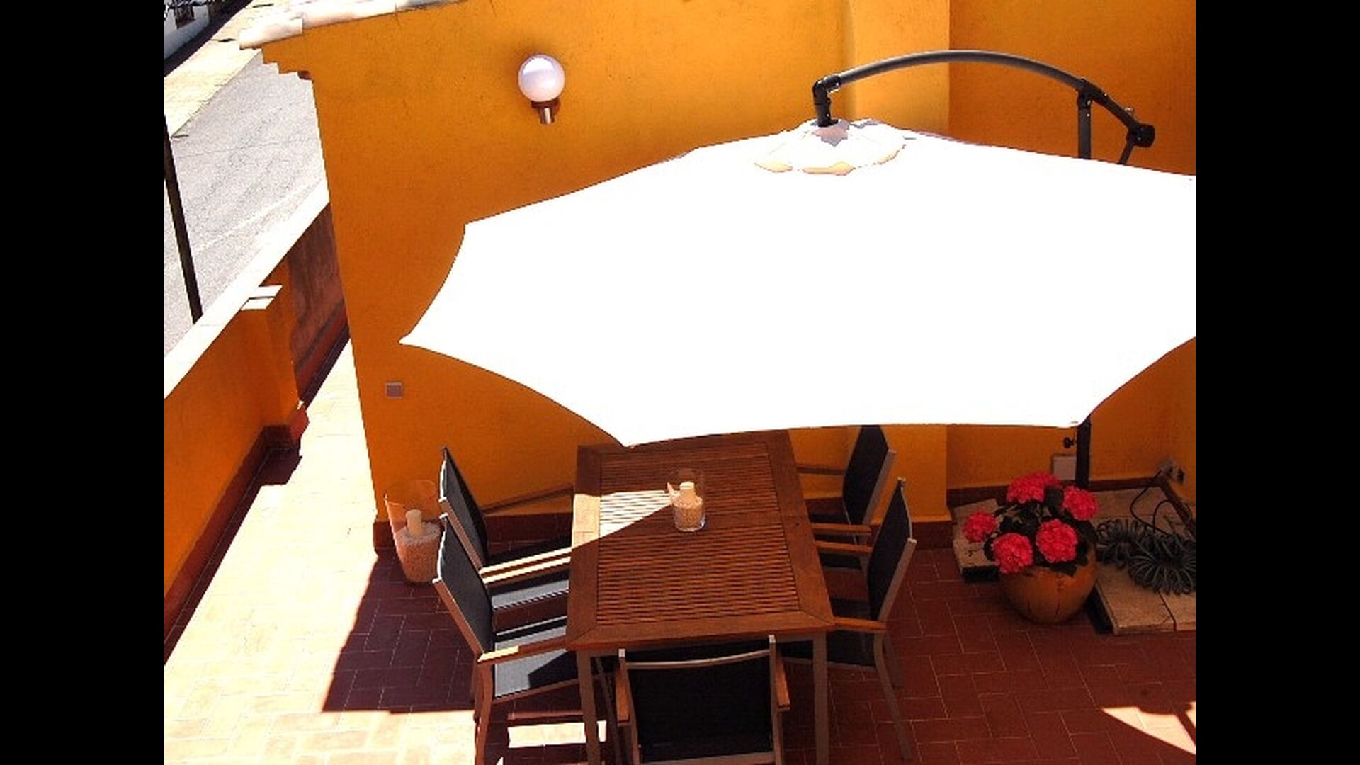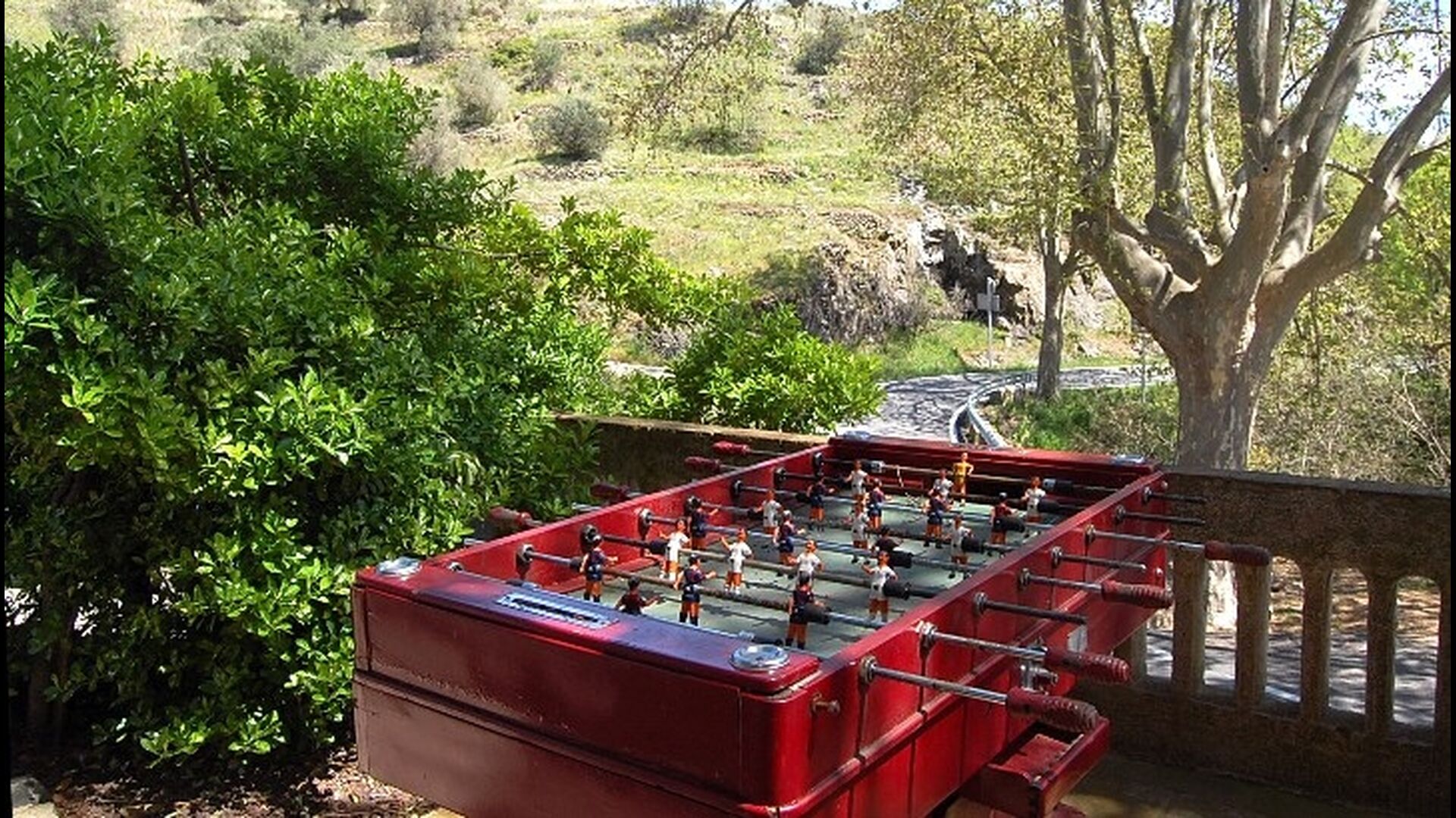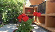 El jardín está dividido en dos zonas, la primera, donde hay la terraza con su barbacoa y el equipo para hacer paellas y las mesas donde se puede comer hasta 15 personas juntas. Todo bajo la sombra proporcionada por un enorme tilo. La segunda es la zona de la piscina, al solecito, con las hamacas durante todo el año. Hay una rincón con sofás y una mesa para tomar el aperitivo, mientras que los niños juegan en el tobogán.