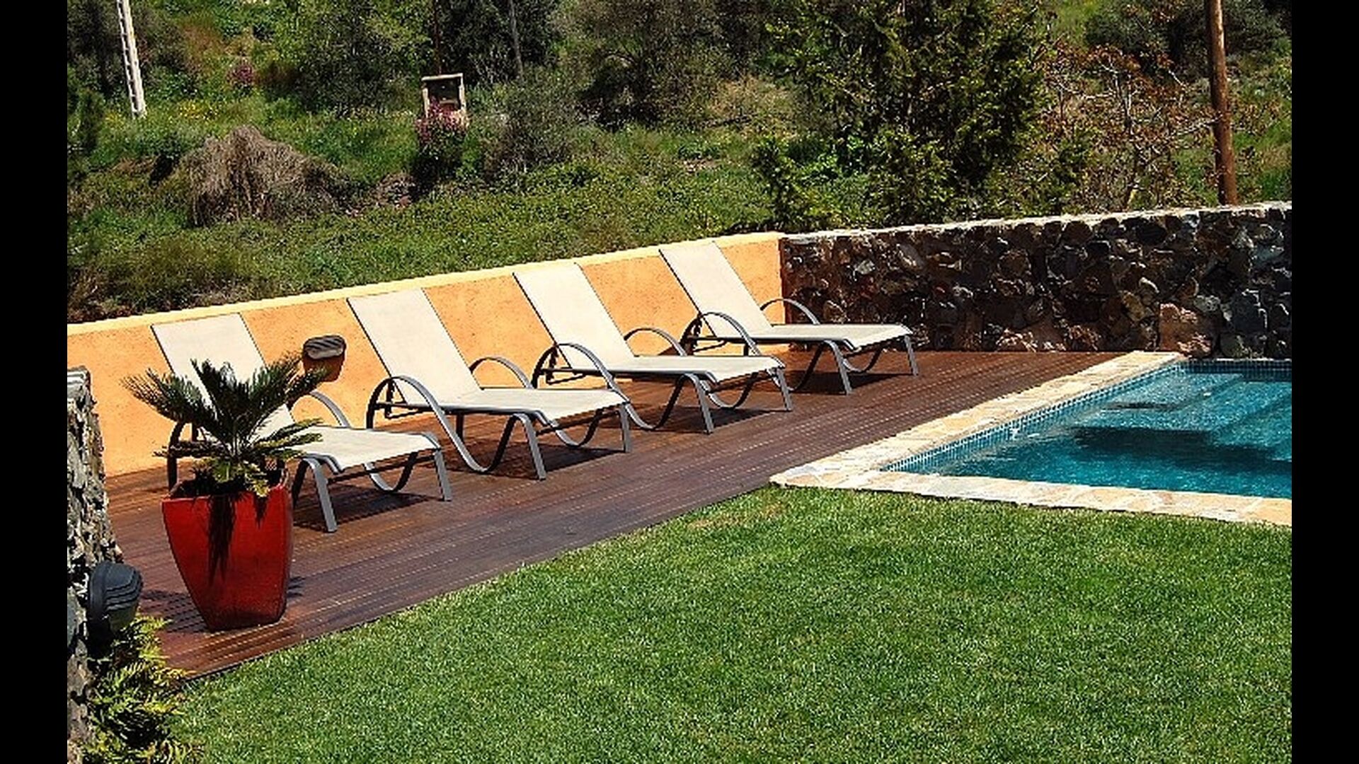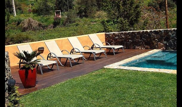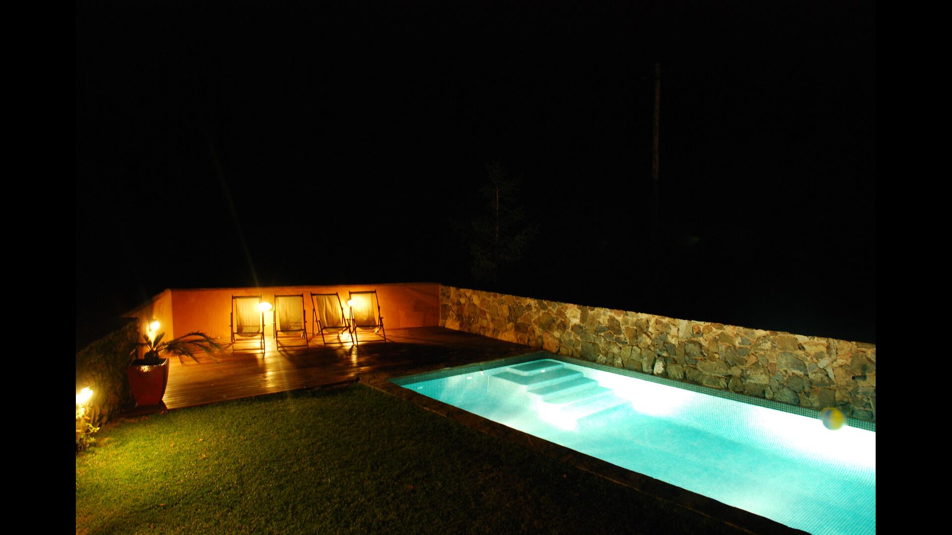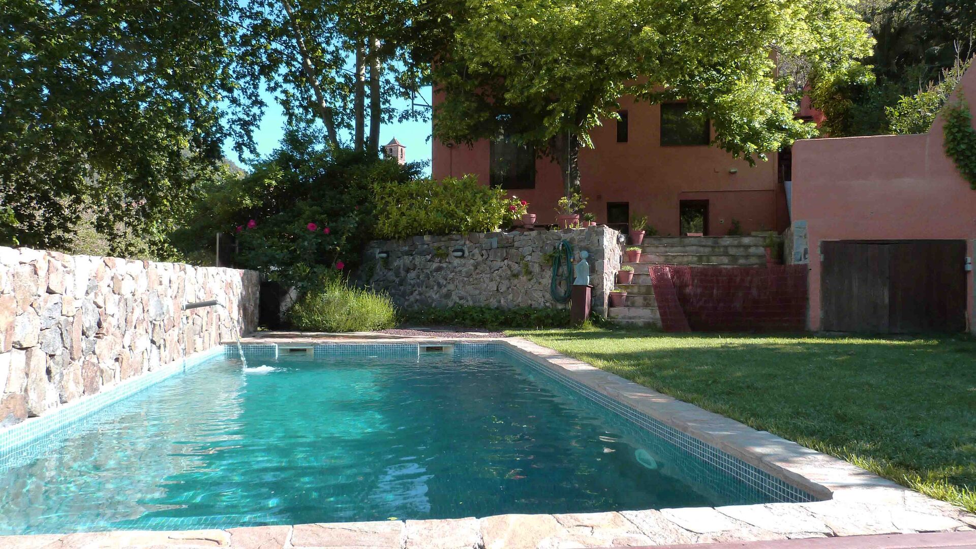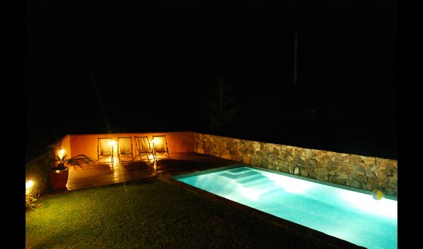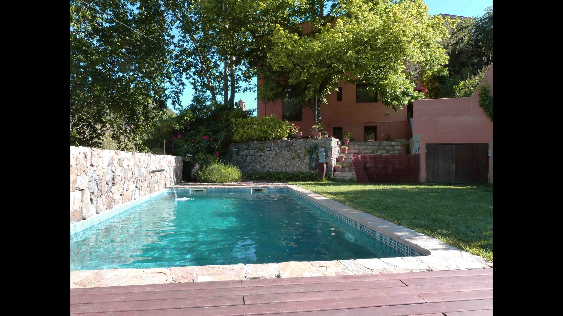 Al ser la primera casa nada más entrar al pueblo, tiene mucha intimidad y el lado del jardín solo da a la montaña. Tanto la zona con la barbacoa, como la piscina iluminada, se pueden disfrutar en las noches de verano. Aparte del jardín, los pisos de arriba tienen su propia terraza, con muebles para poder comer fuera. Entre semana santa y mediados de octubre la piscina se climatiza para alargar la temporada de baño.