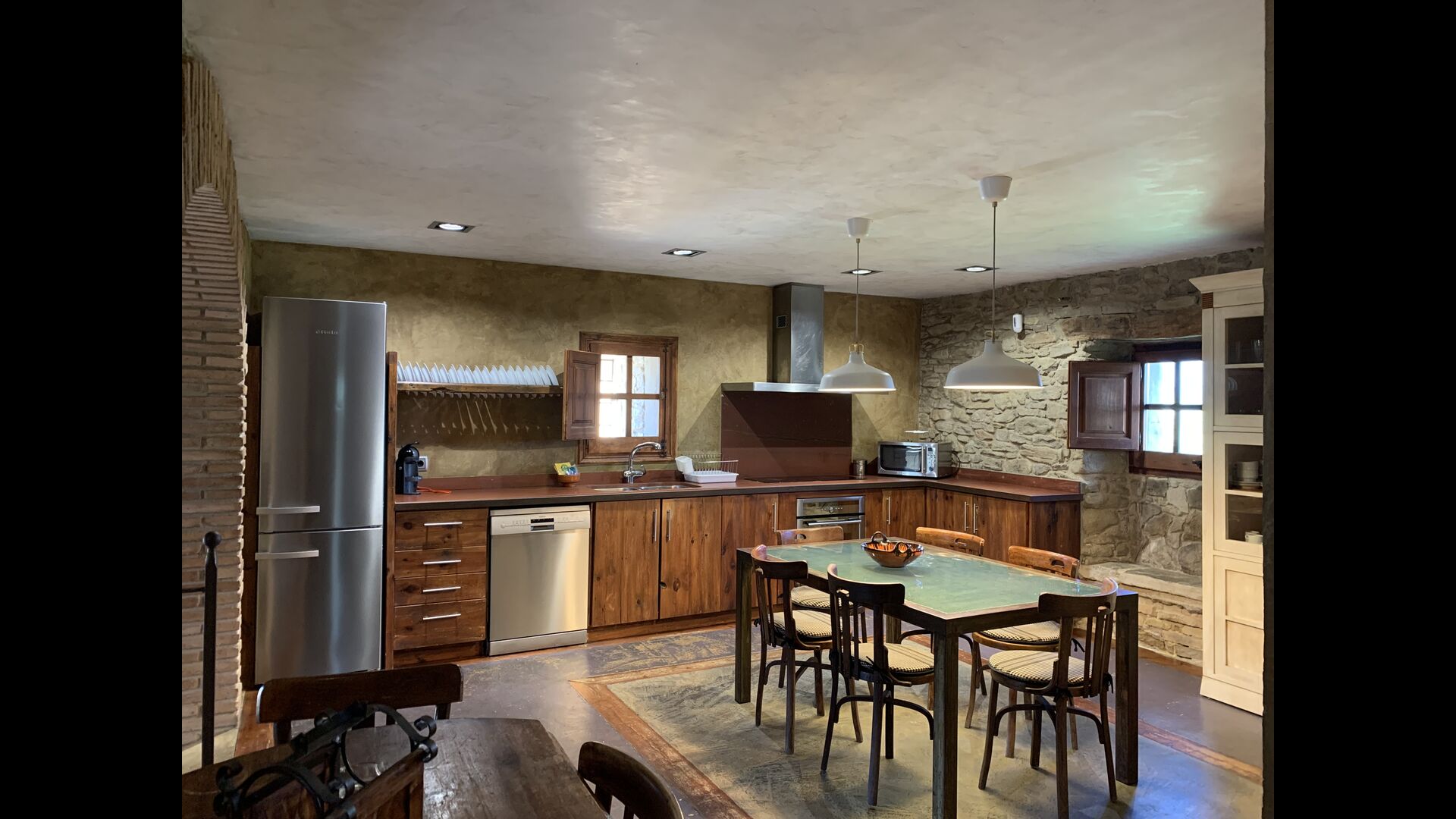 La cocina está equipada con dos refrigeradores, uno con congelador, placas de cerámica, horno, microondas, lavavajillas, prensas de jugo, cafetera, tostadora, licuadora, tostadora y una paellera para 15-20 personas.