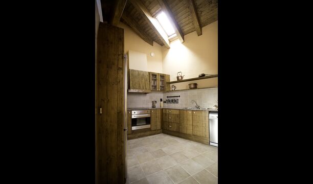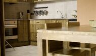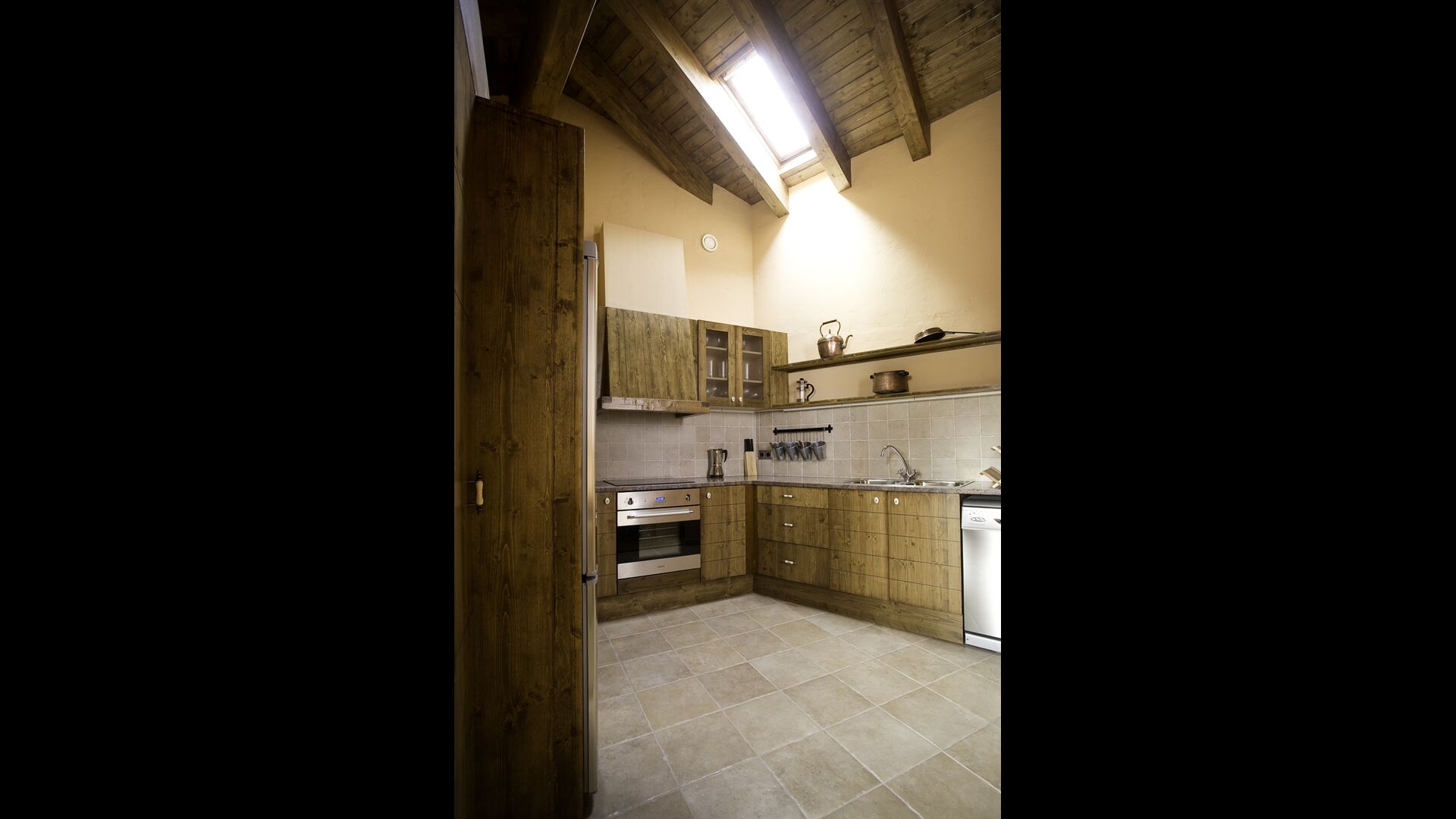 Hay una gran sala común que contiene la sala de estar con sofá esquinero, el comedor con mesa de comedor y la cocina abierta. La cocina está totalmente equipada con horno, vitrocerámica, lavavajillas, Nespresso y vajilla.