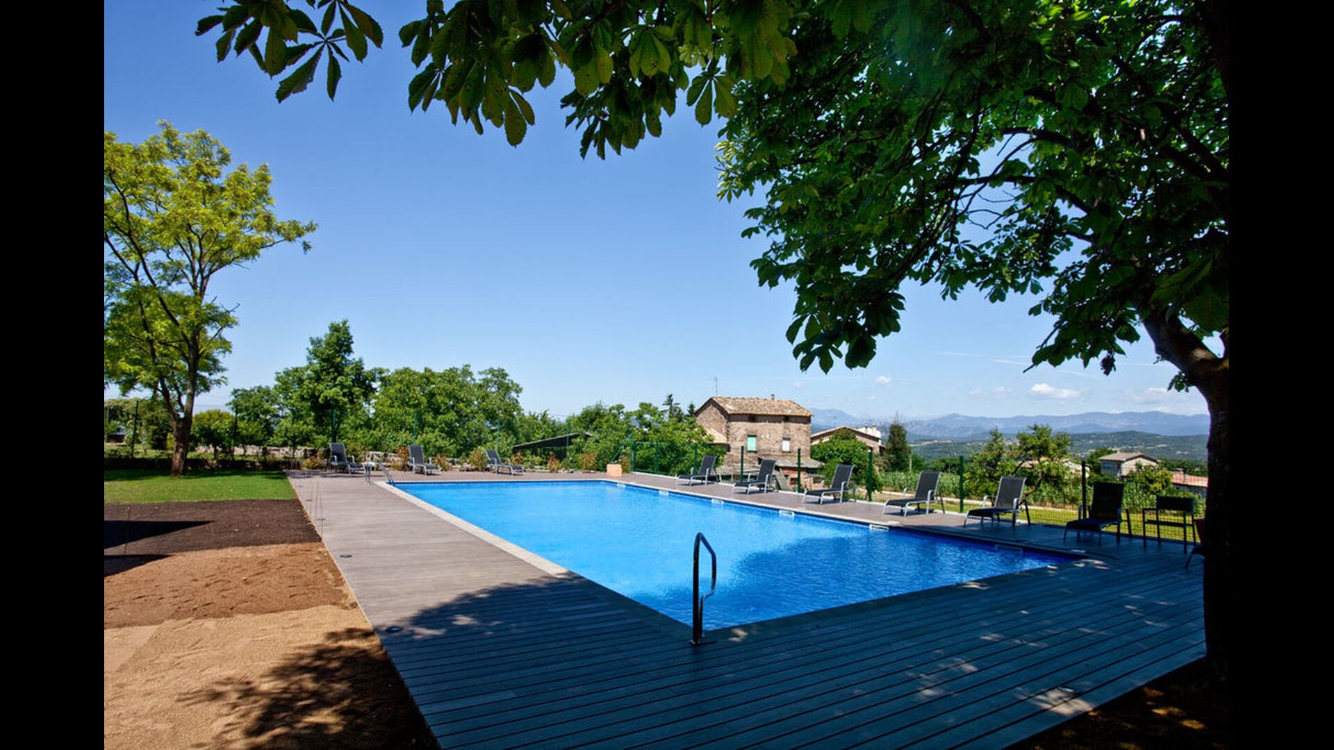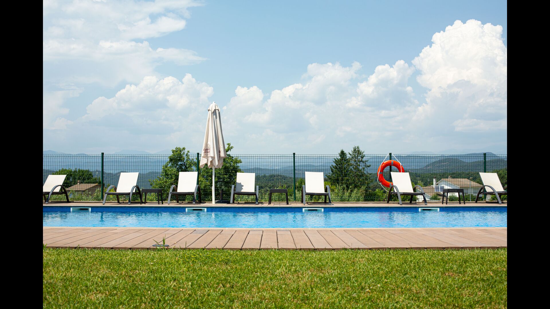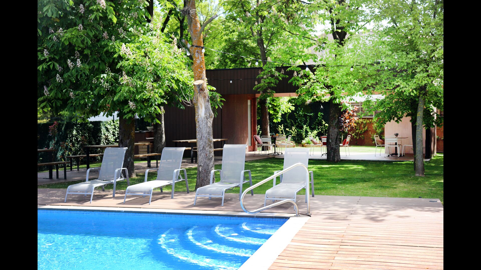 Además, la parte trasera de la casa se convirtió en la fantástica zona de la piscina con la gran piscina (17 x 5 metros), cafetería y cafetería. mesas, aseos y vestuarios, y rincones con sombra y lugares soleados. La vista es impresionante, directamente a los Pirineos.