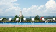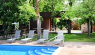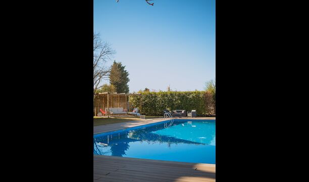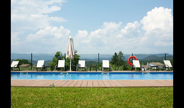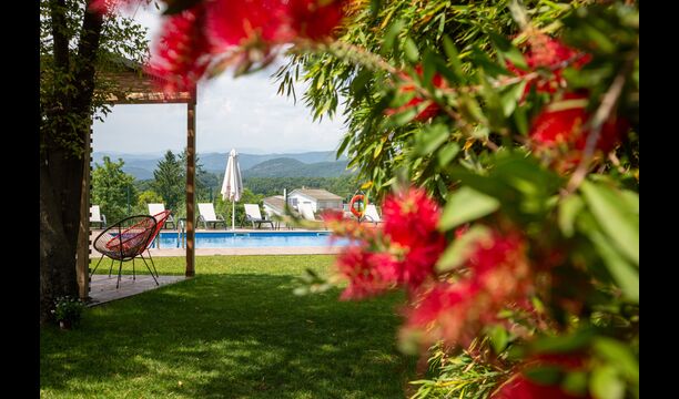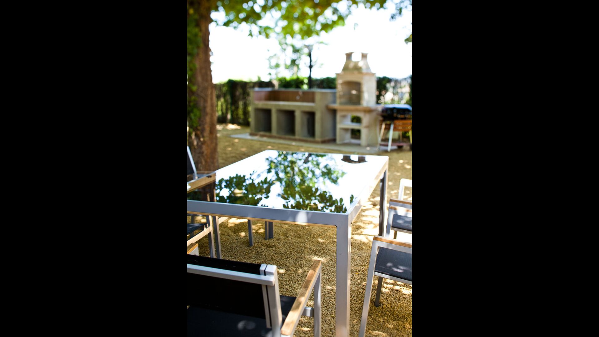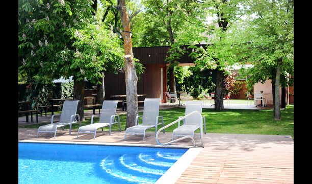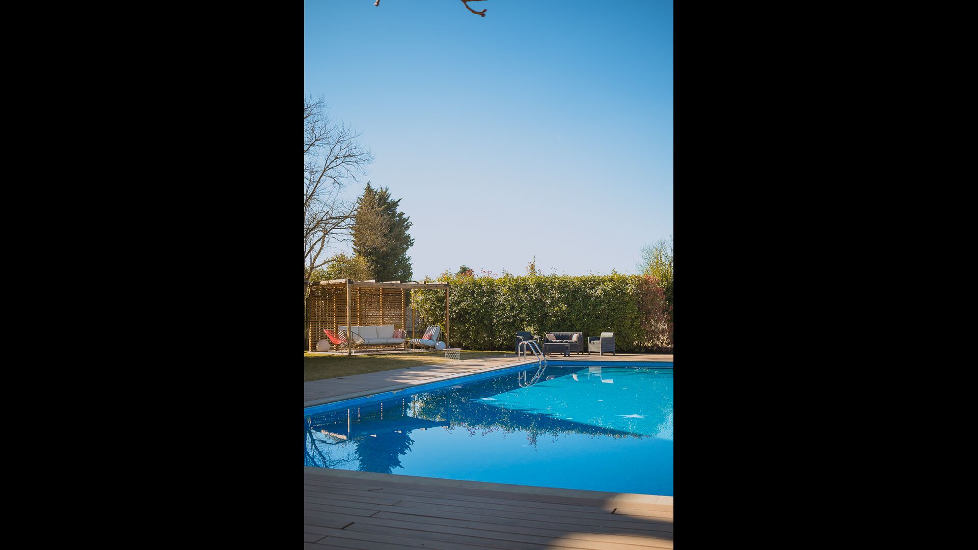 Además, la parte trasera de la casa se convirtió en la fantástica zona de la piscina con la gran piscina (17 x 5 metros), cafetería y cafetería. mesas, aseos y vestuarios, y rincones con sombra y lugares soleados. La vista es impresionante, directamente a los Pirineos.
