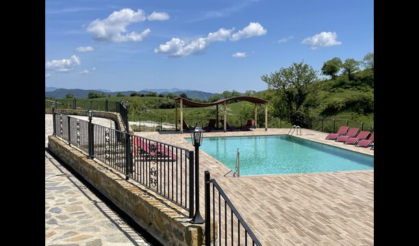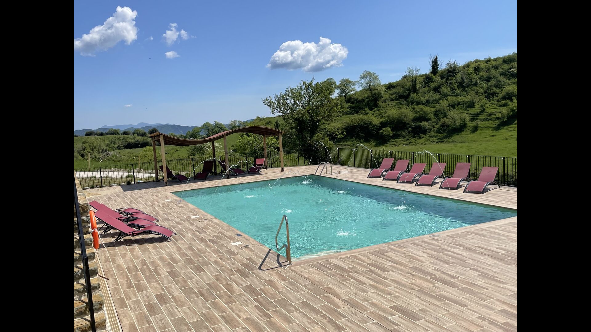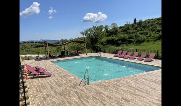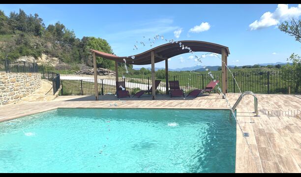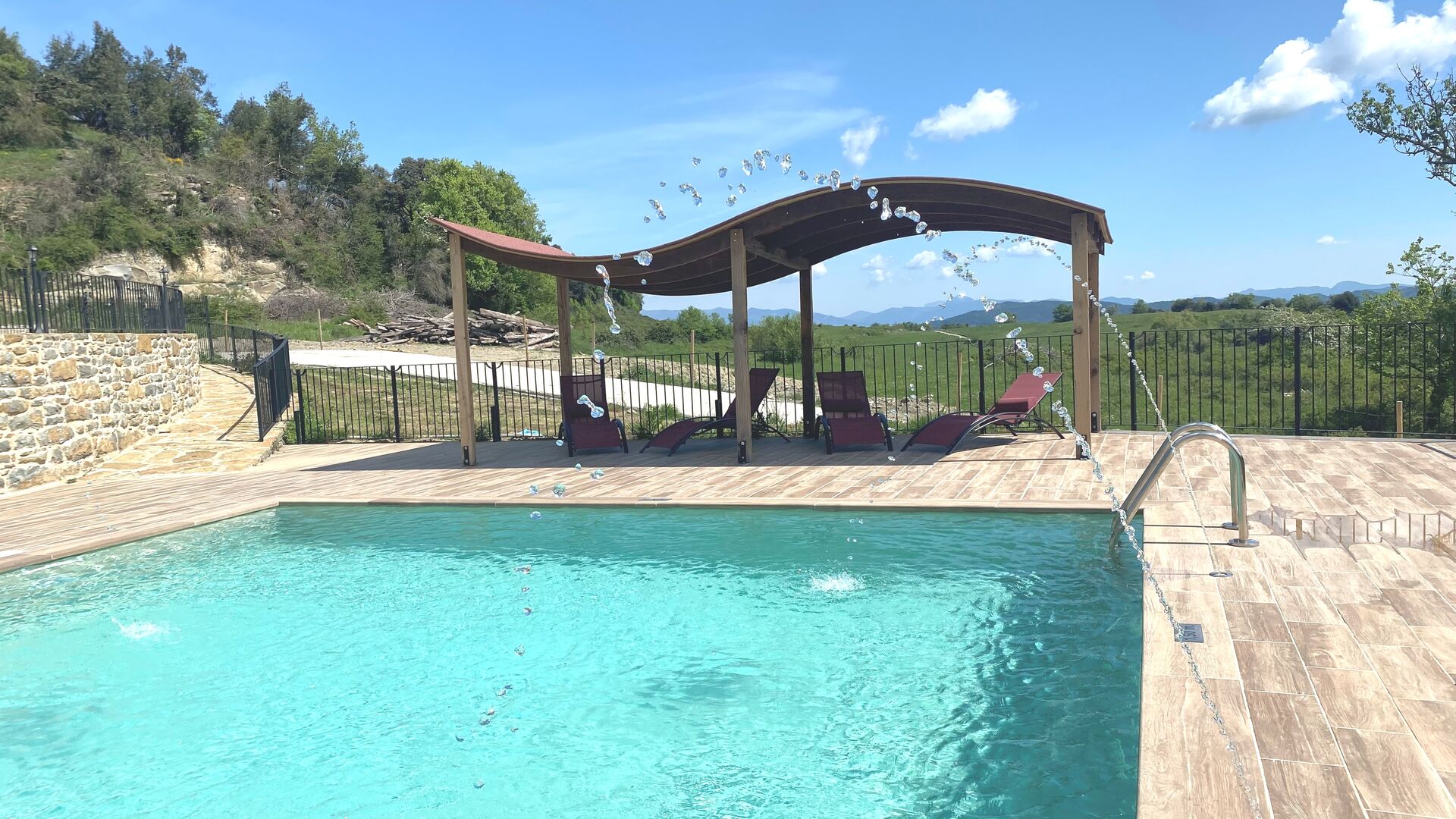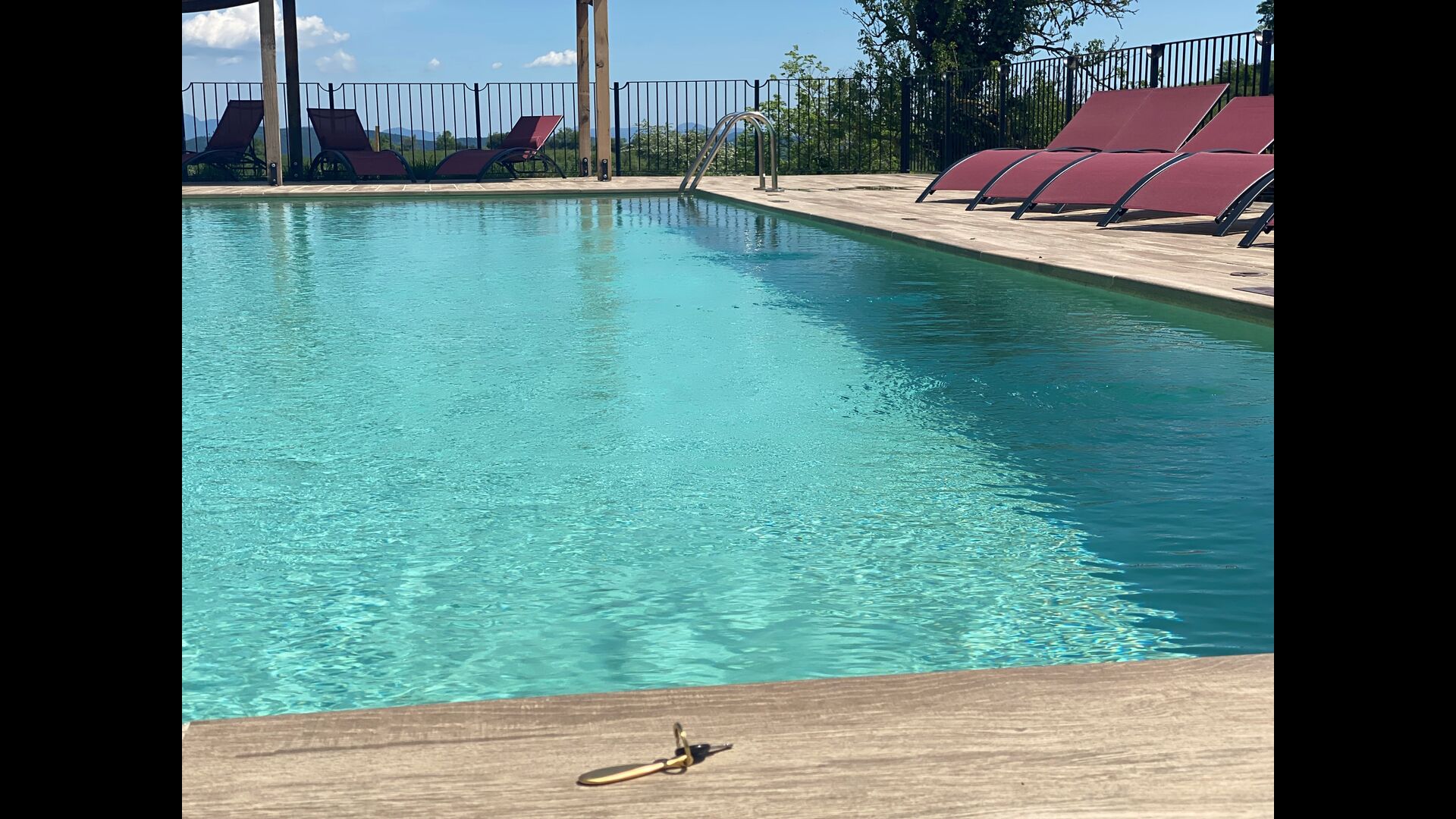 La gran zona de la piscina es el punto natural de relajación. Hay un montón de tumbonas, y si hace demasiado calor, puede darse un baño en la gran piscina de 12 x 7 metros, o puede beneficiarse de la sombra bajo la pérgola al final de la piscina.
