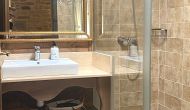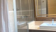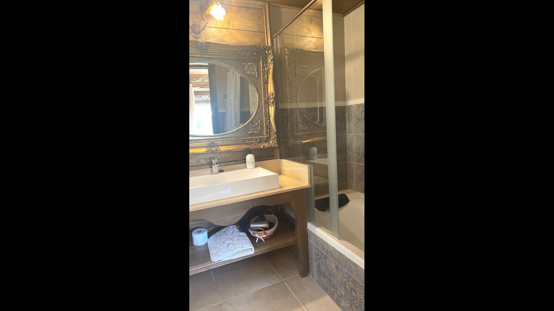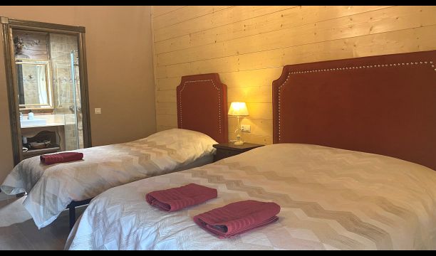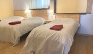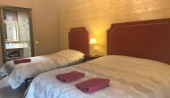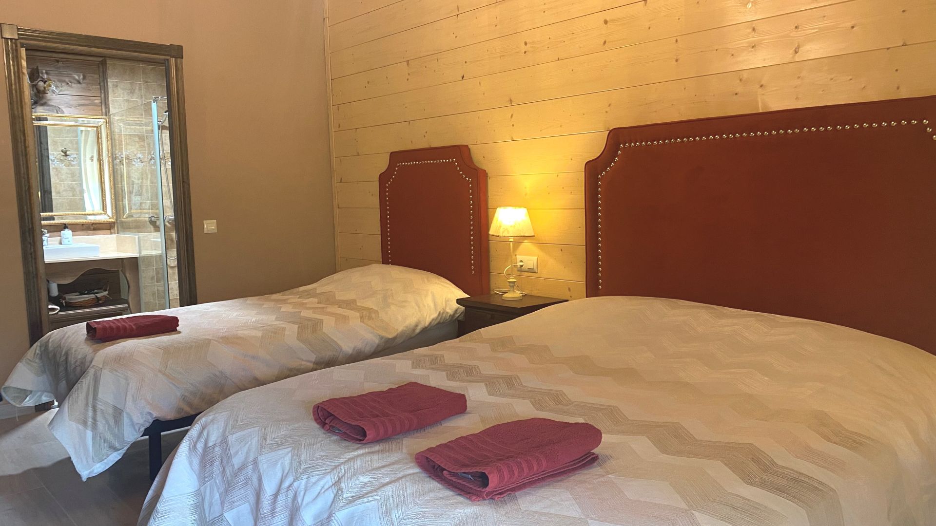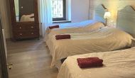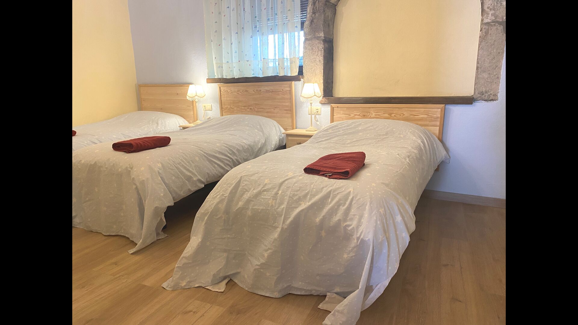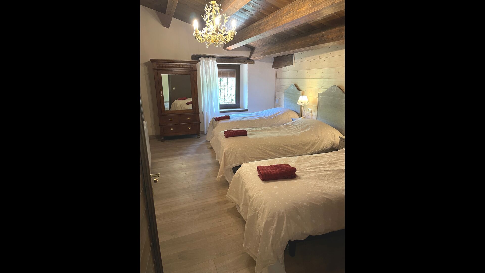 Además, aquí en la primera planta, encuentras 2 habitaciones triples (3 camas individuales) y 1 habitación doble con cama de matrimonio. Todos tienen baños en suite, dos con ducha y uno con bañera. Por último, en la zona común, hay un enorme sofá con capacidad para al menos 15 personas, y un televisor de un tamaño a juego.
