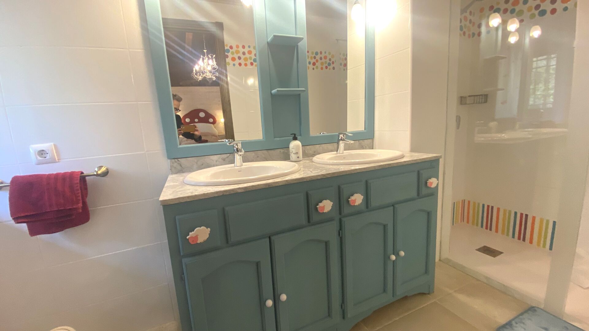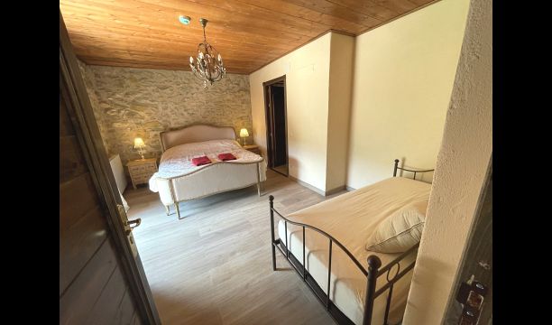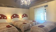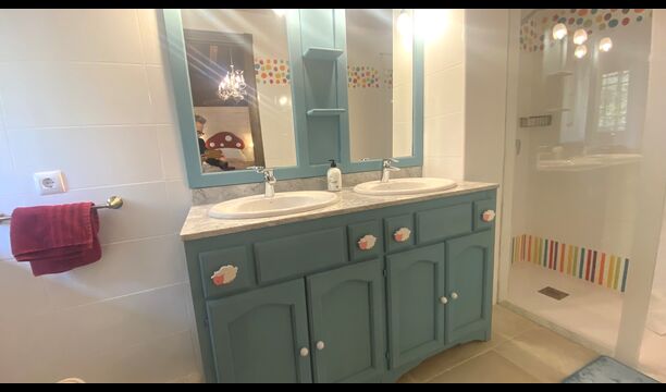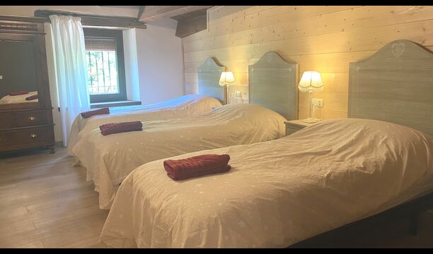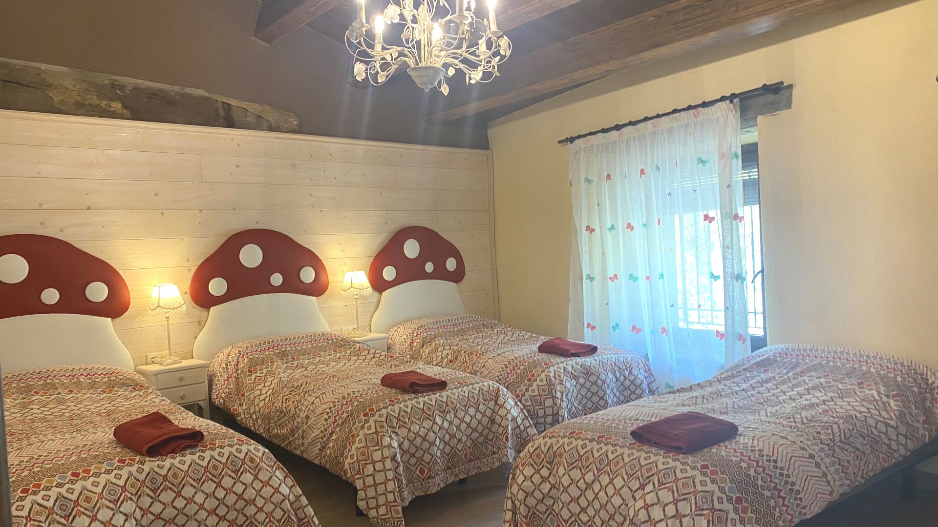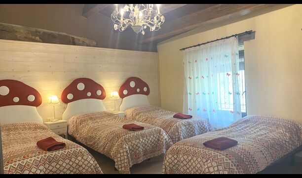 Además de los cinco dormitorios en el primer piso, hay siete dormitorios más en el segundo piso. Al igual que en el primer piso, hay una gran área común con sofá para más de 15 personas y TV. Para los más pequeños, se ha decorado uno de los dormitorios, por lo que da una sensación de “cuento de hadas” y con un baño a juego. Esta habitación tiene cuatro camas. Además, encontrarás 1 triple con 3 camas individuales, 2 triples con cama de matrimonio y cama individual y 3 habitaciones dobles con cama de matrimonio.