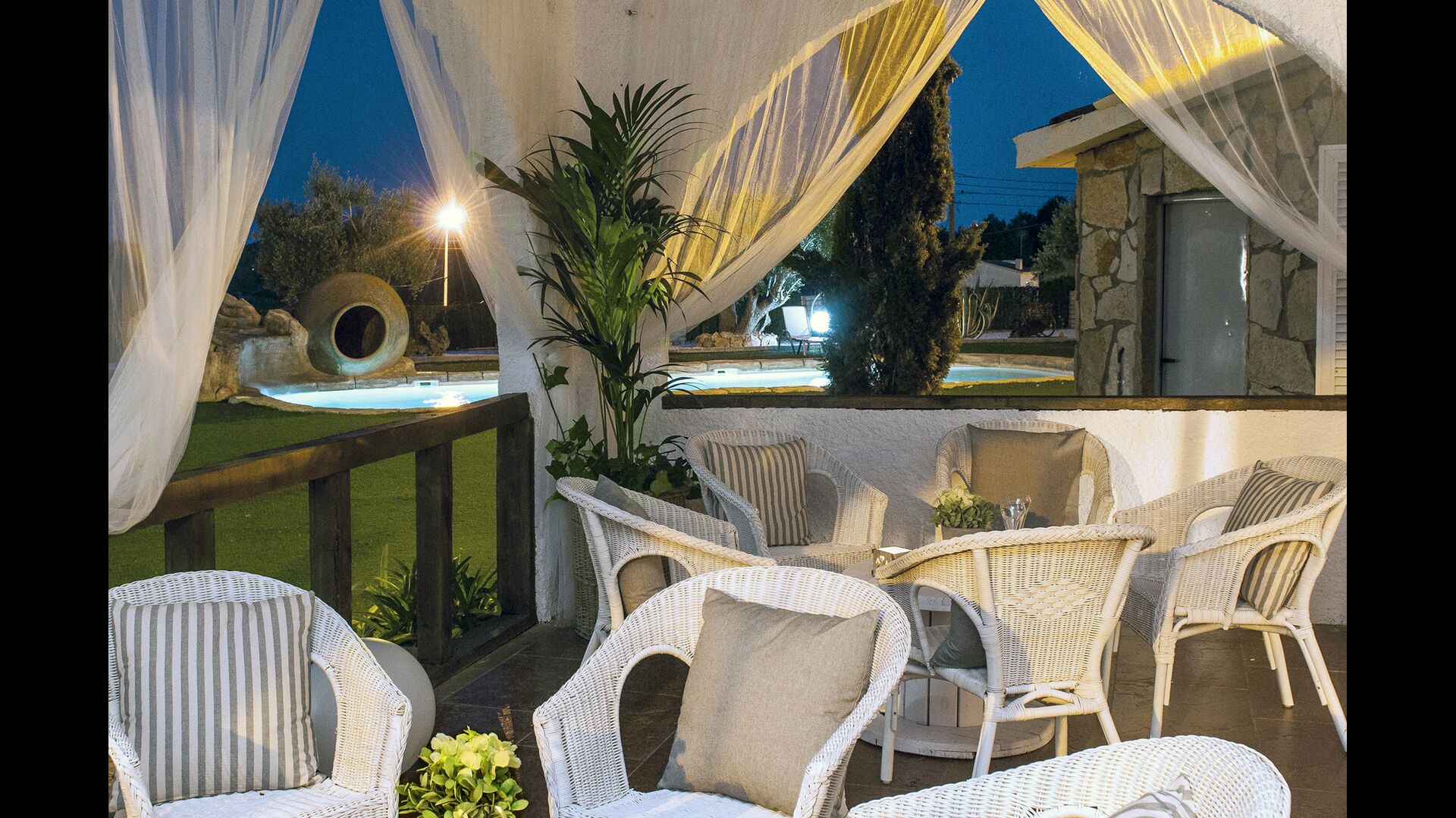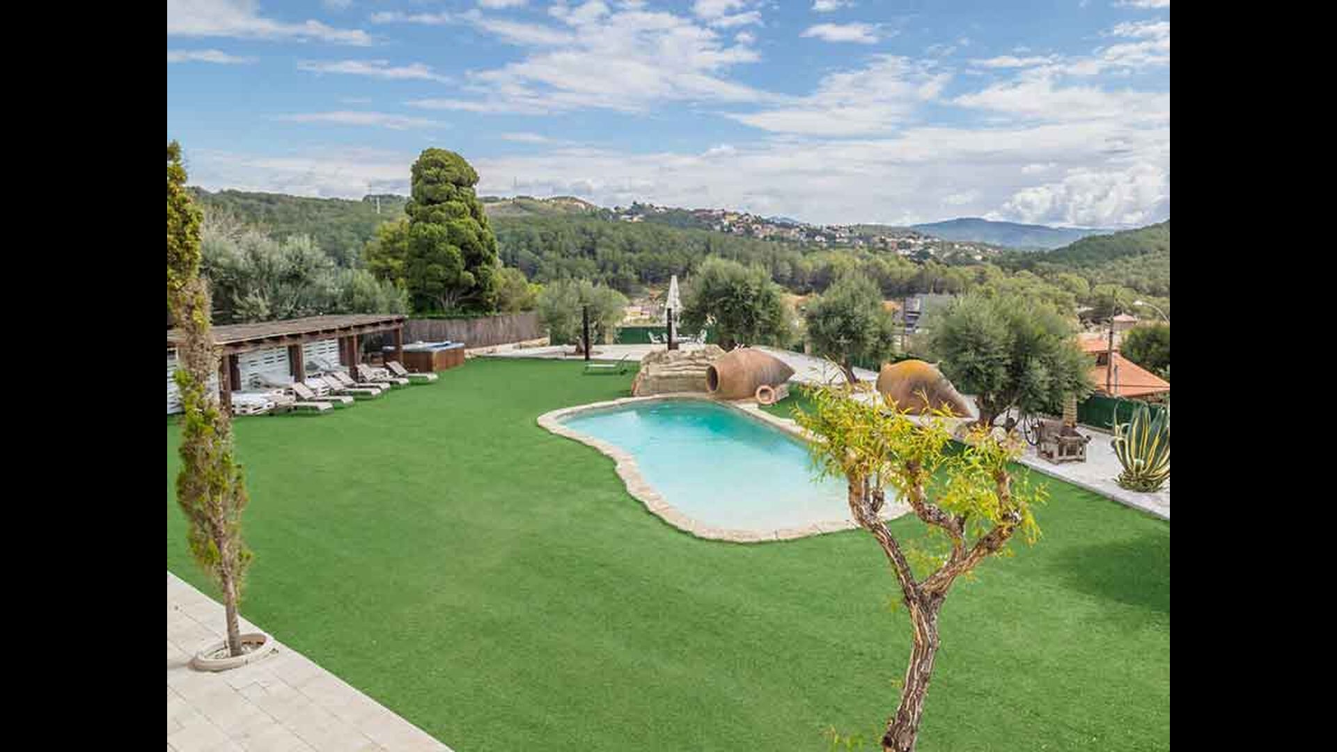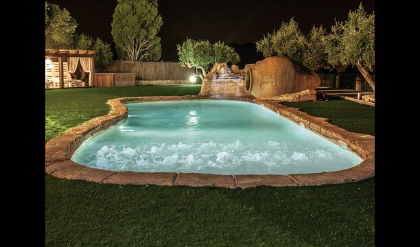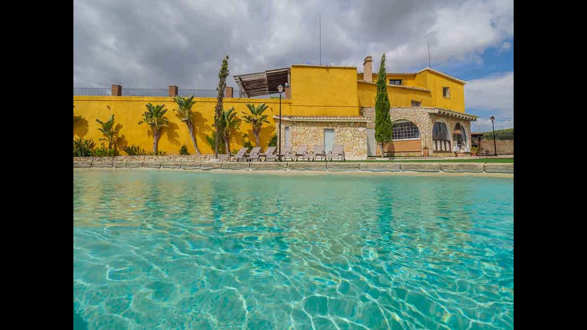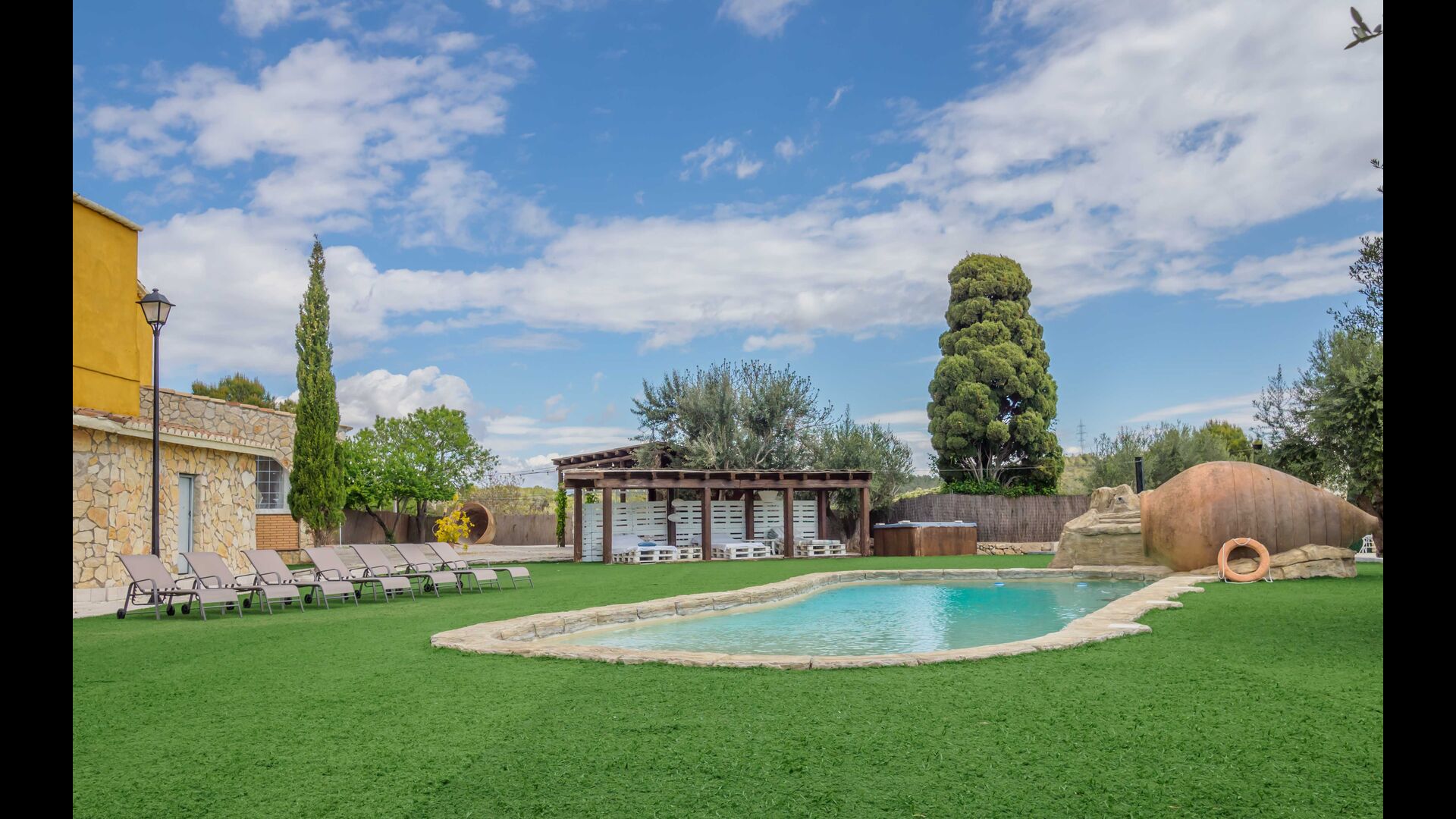 En las zonas exteriores encontrará una diversidad de espacios destacando una gran piscina tipo playa con hidromasaje con una cascada de agua, zona de hamacas chill-out y jacuzzi. Además, dispone de un comedor exterior, una barbacoa y un amplio porche con sillones.
