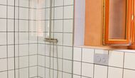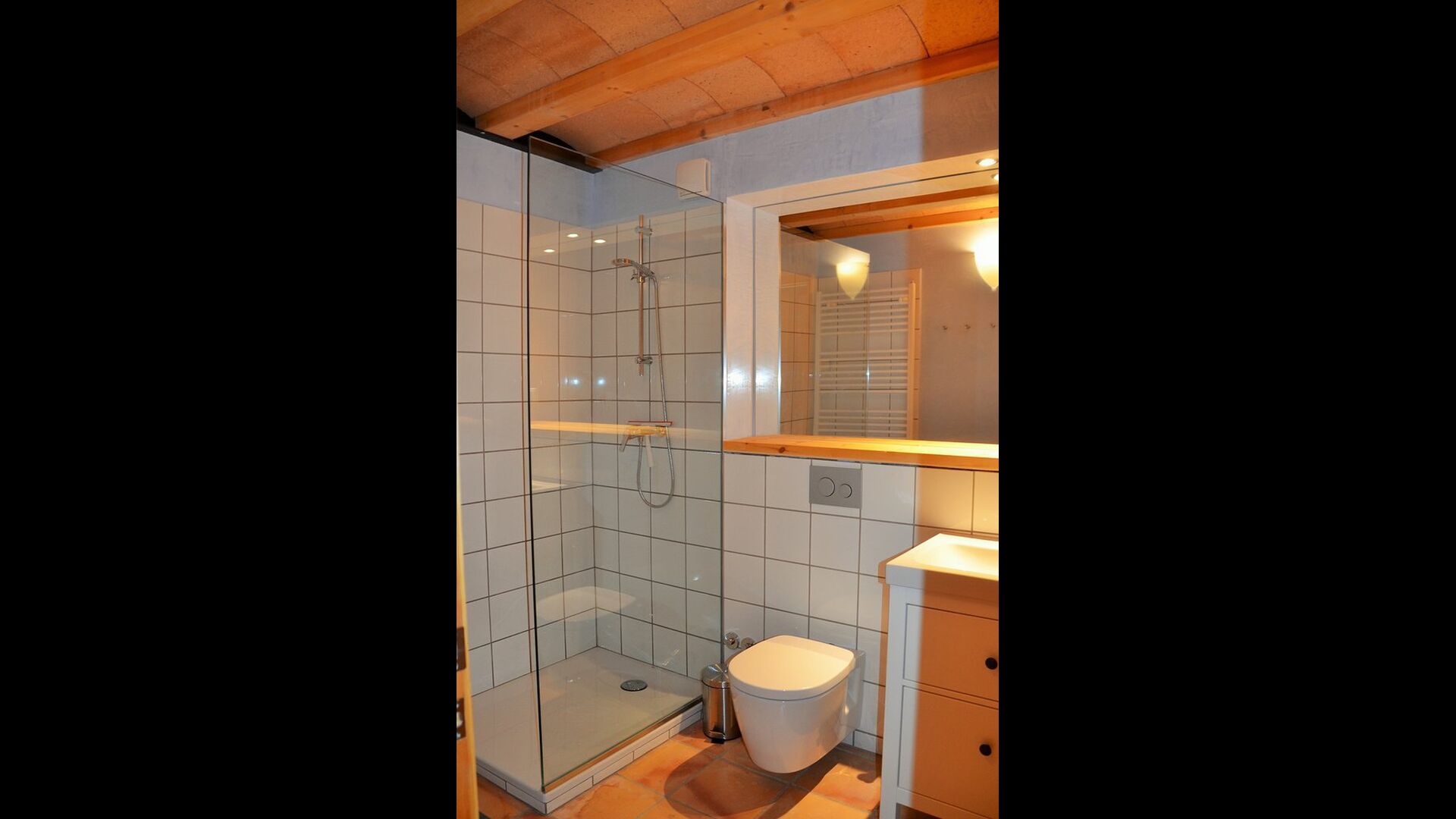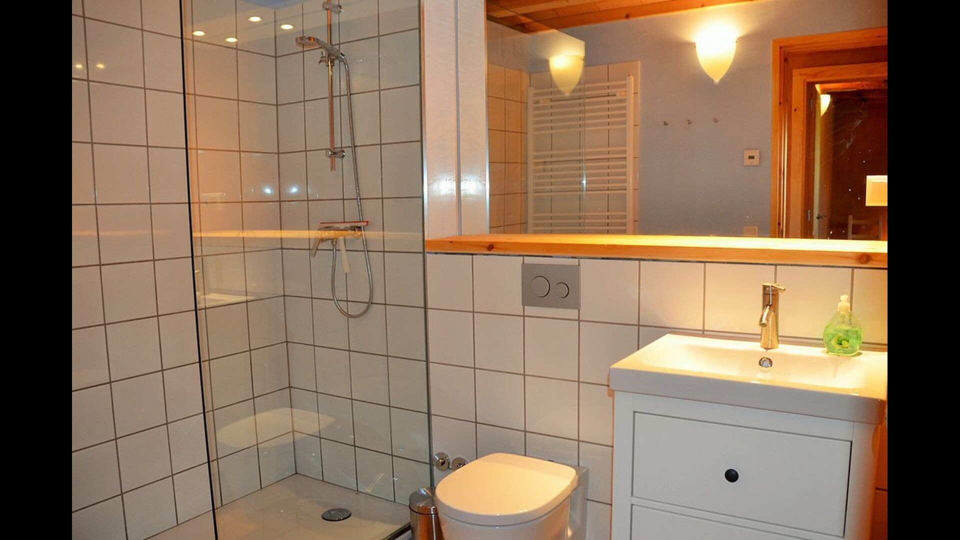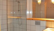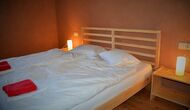 In one end, you find the enormous common room with open, fully equipped kitchen, in one side, sofa corner and TV in the other, and then the entire facade is a panorama window with double doors, with a fantastic view over the landscape and to the mountains with the famous castle on the top. The dining table is places right in front of the double doors, so when open, it works like a covered terrace. To both sides, there are also windows, making the room light and nice to be in. The apartment has two fully equipped bathrooms as well.