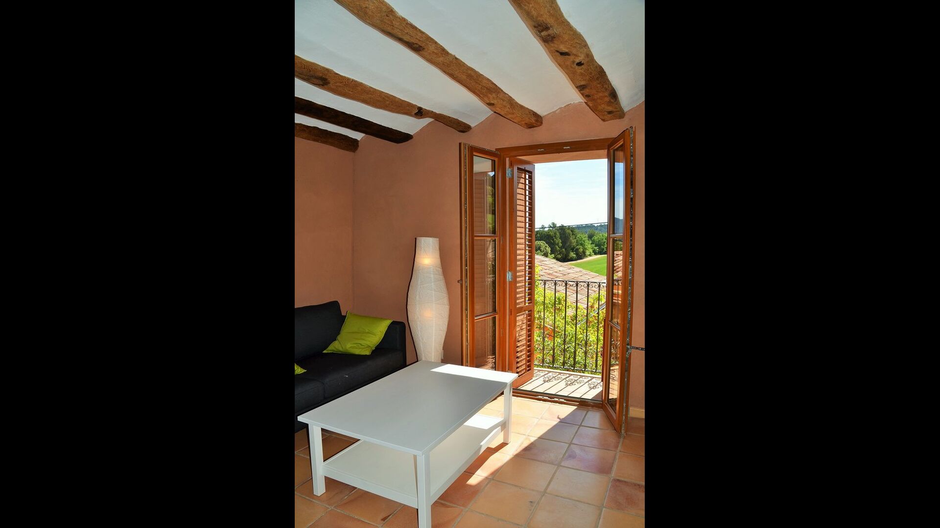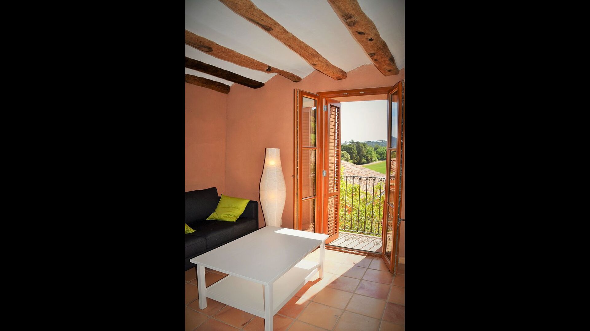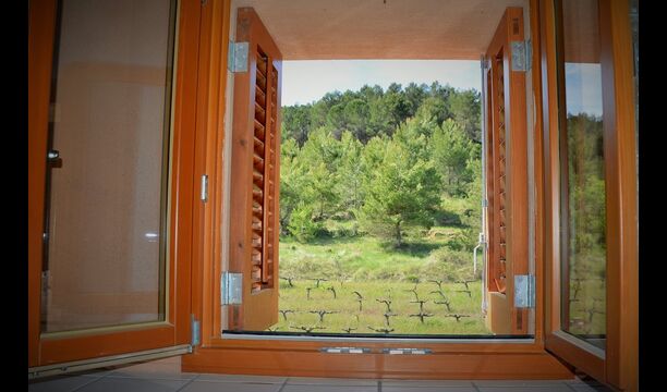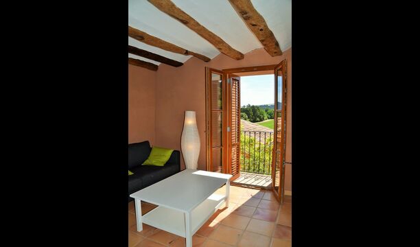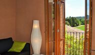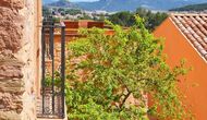 The “Salvie” has a similar layout with two bedrooms, bathroom, a common room with kitchen, dining area and sofa corner and French balcony with view to the courtyard. As the house is situated on a sliding hill, this unit’s terrace is situated directly on the mountain, with view to the vinyards.