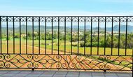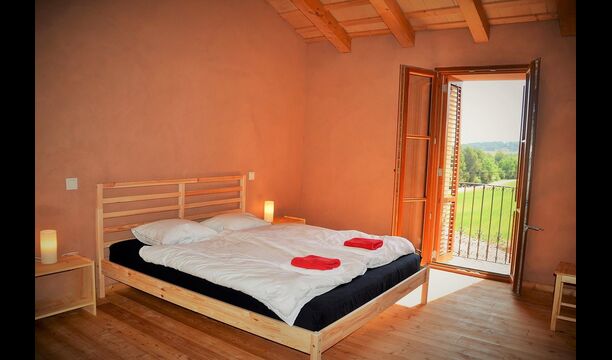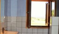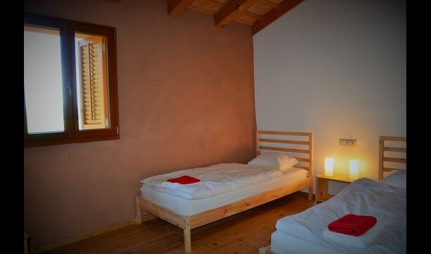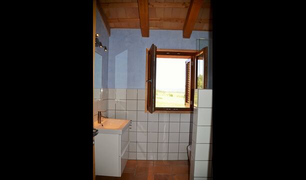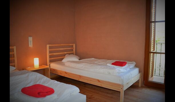 On the first floor, there are two units for 4 persons each. The “Rosemary” has two bedrooms, one with single beds and one with two double beds, all in light “Nordic style” and each with a balcony. There is also a fully equipped bathroom with shower and a common room with kitchen, dining area, sofa corner and a very nice first-floor terrace, view to the valley and to the castle on the top of the hill.