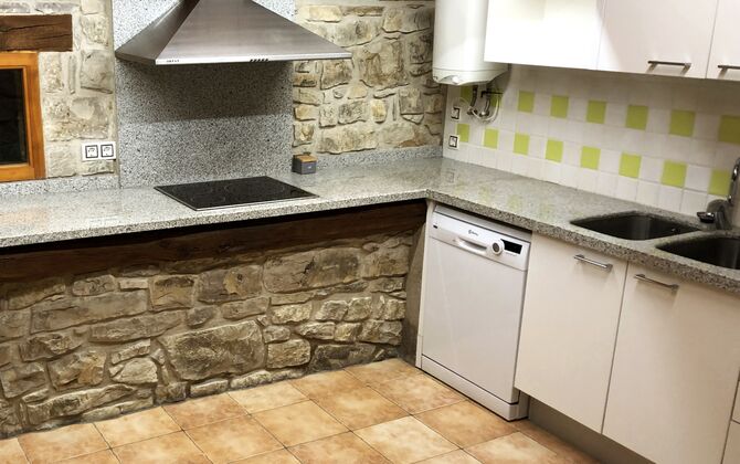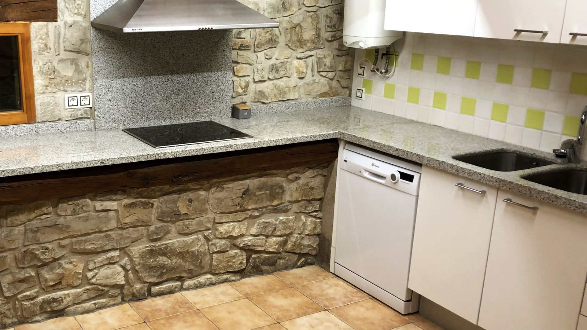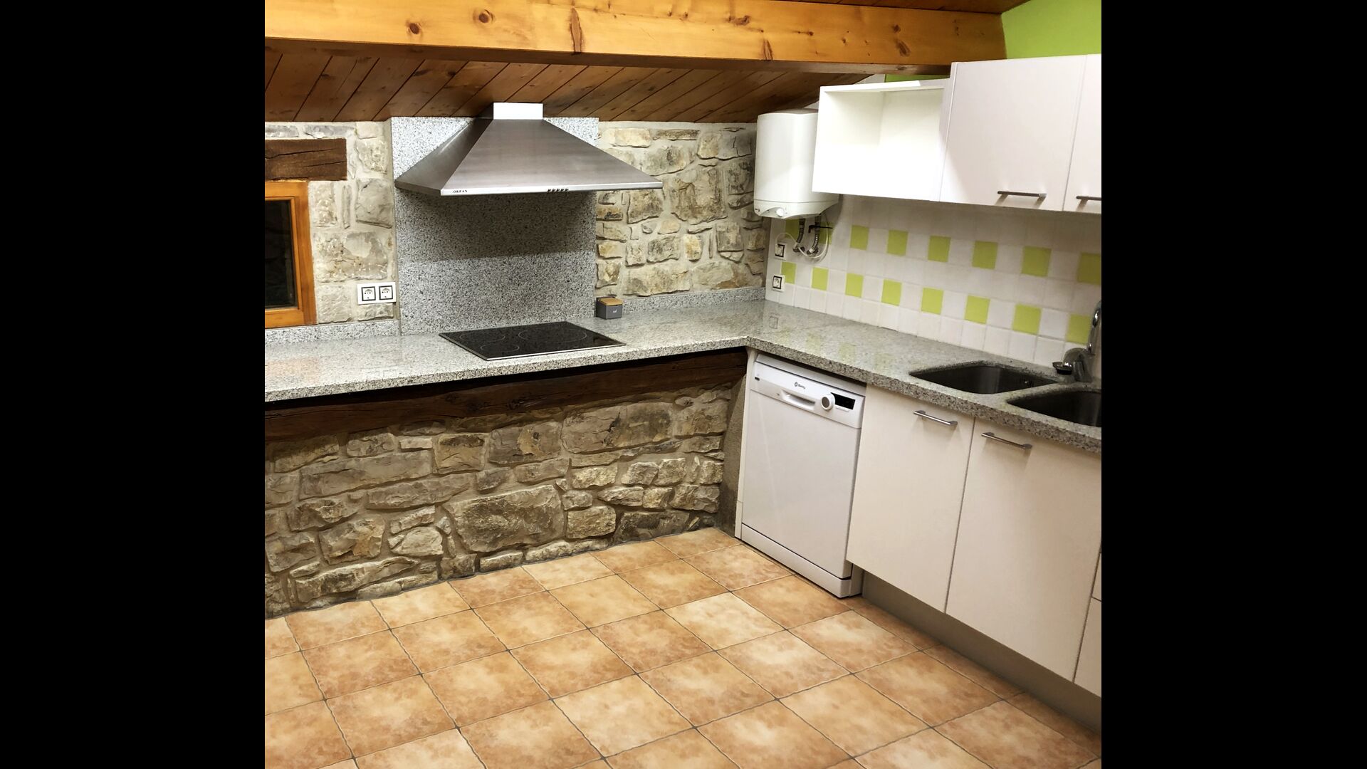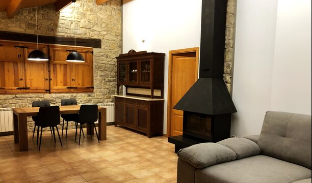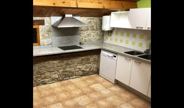 Entrará en la sala común de la casa con mesa de comedor, rincón de sofá y una cocina totalmente equipada con fogones, horno, lavavajillas y utensilios de cocina.