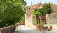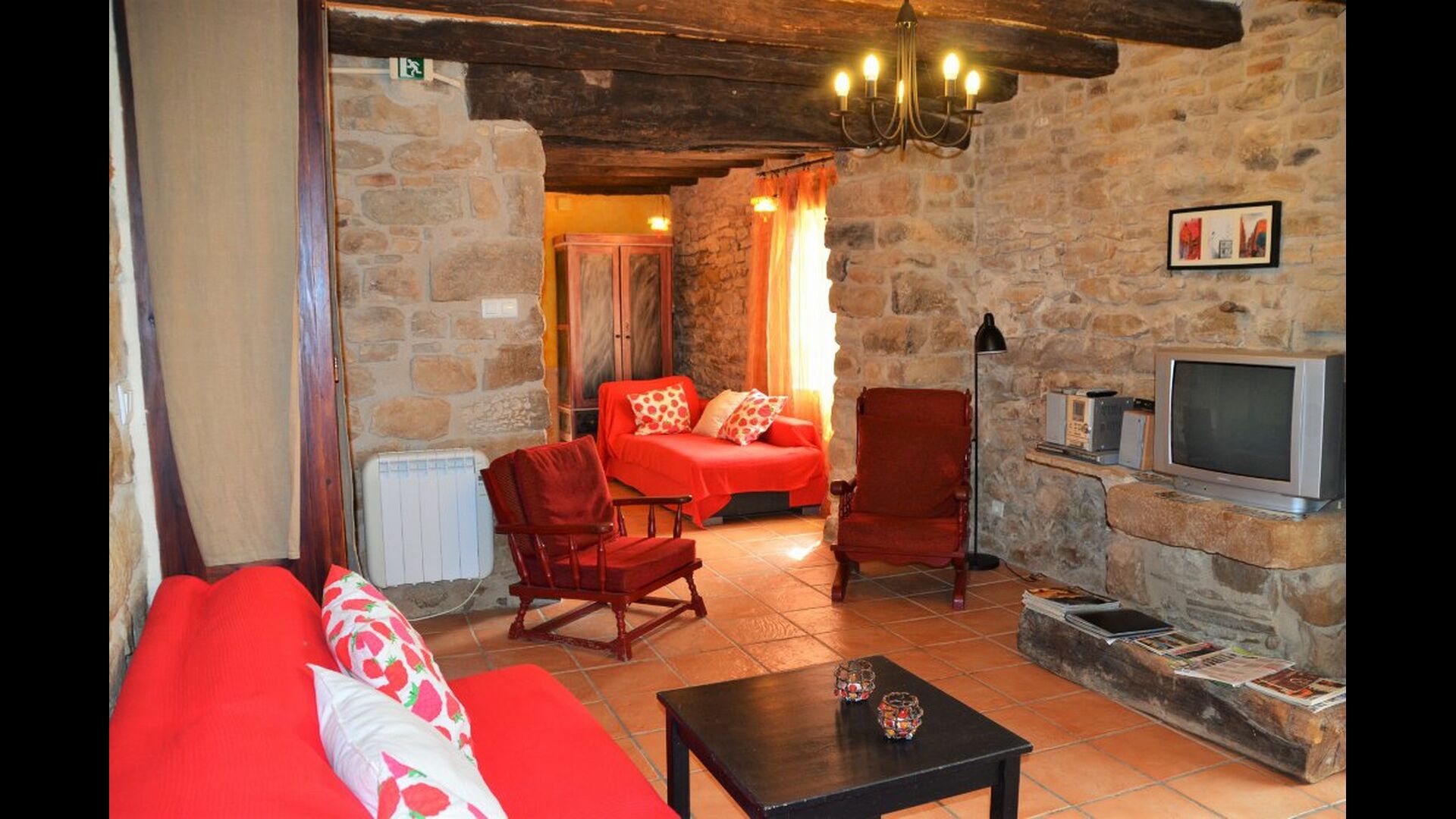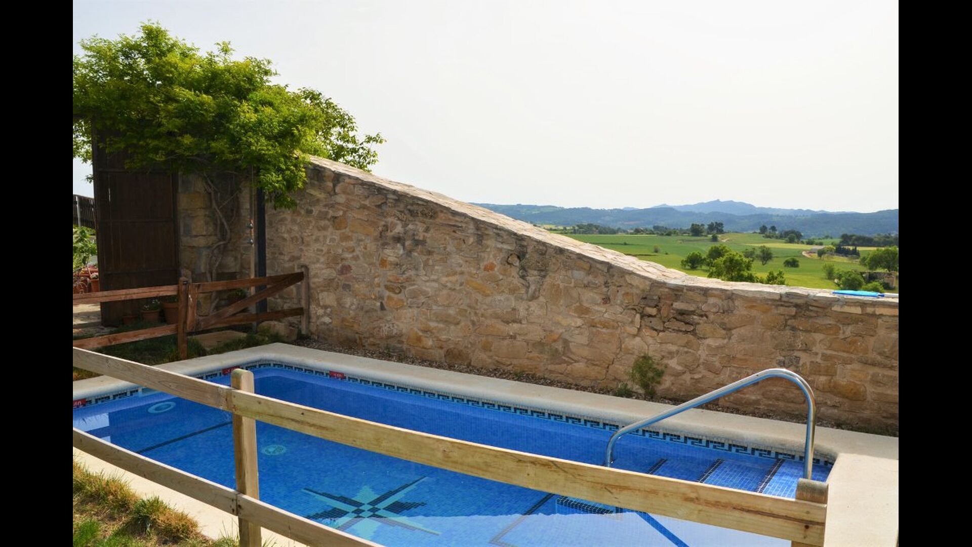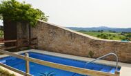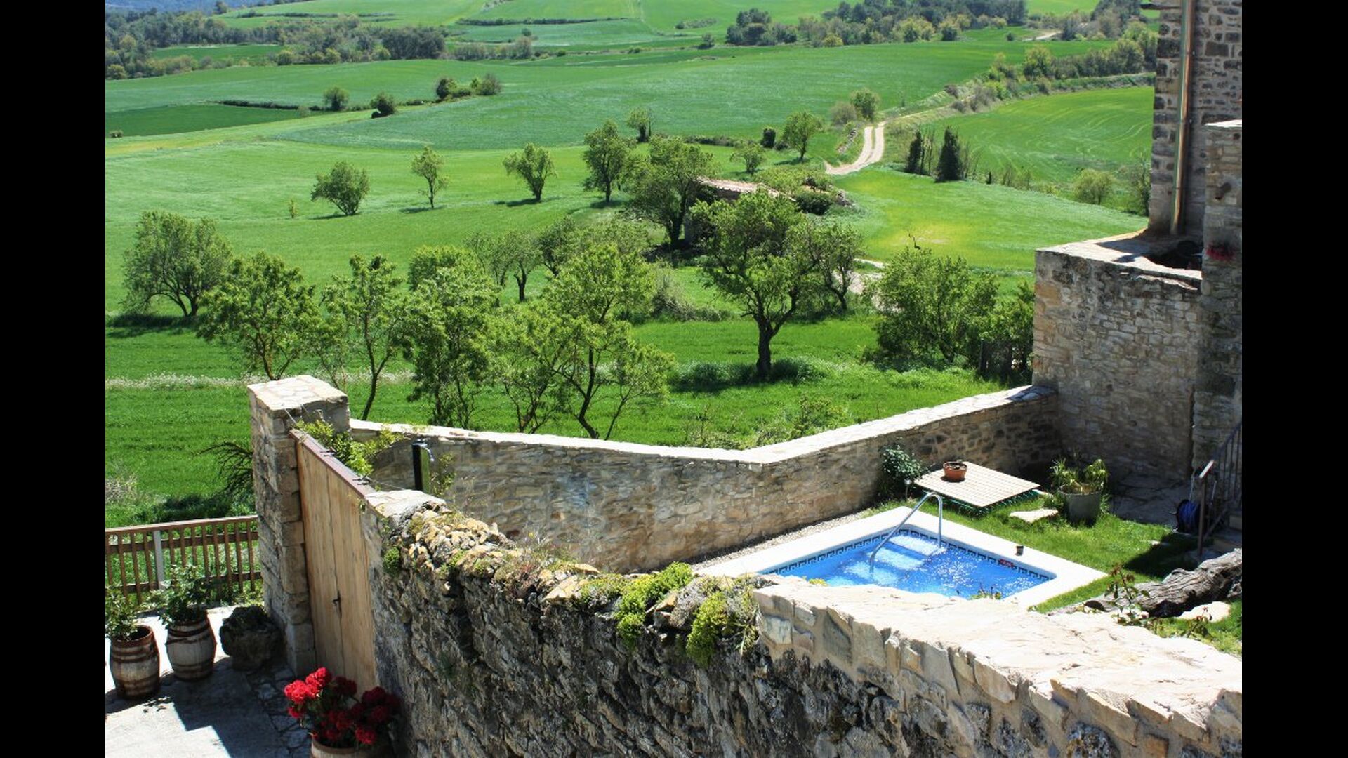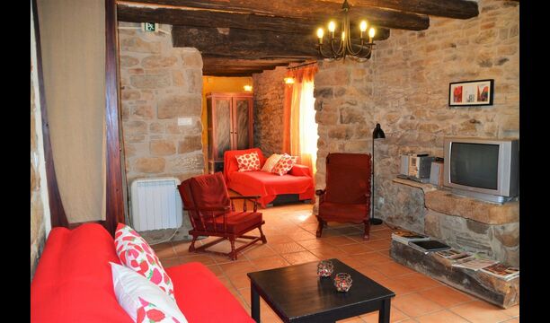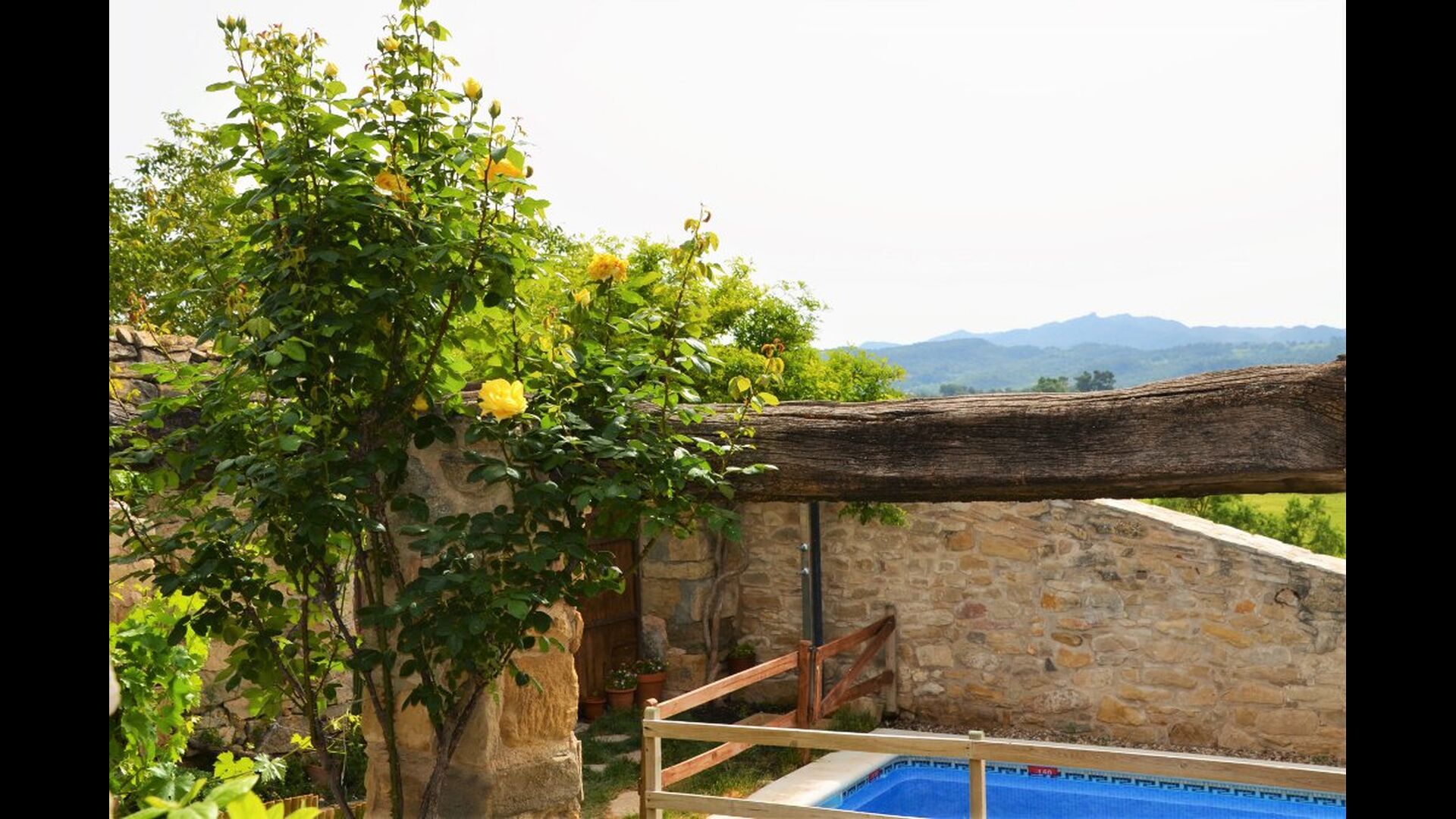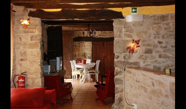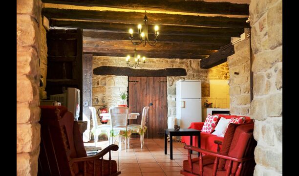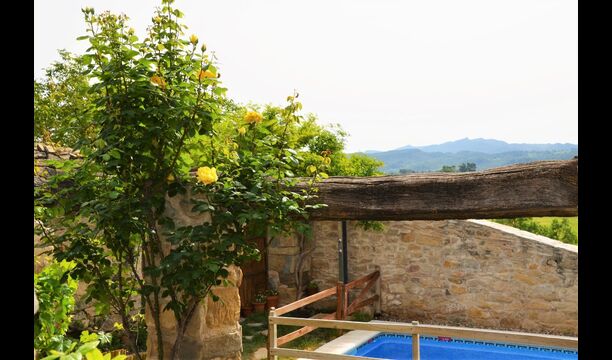 La calle Mayor es el acceso principal, entramos por un recibidor distribuidor con un suelo de piedra de río de canto redondo, aquí encontramos la sala de estar-comedor y una terraza que da a ponente, dos habitaciones con baño, al fondo una cocina con su antigua pica de piedra, y un espacio donde está la entrada de la antigua cisterna y el horno de pan convertido en terracita, ya que lo encontramos totalmente derruido. Desde aquí a través de una puerta con llave bajamos unas escaleras que nos llevan a un jardín envuelto por un muro de piedra, el cual hemos bajado un poco para que se vea desde dentro el paisaje. En este espacio tenemos la piscina, una barbacoa y un porche cubierto, ideal para cenas, lecturas y para el descanso en general.