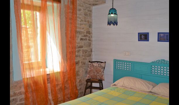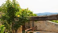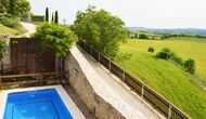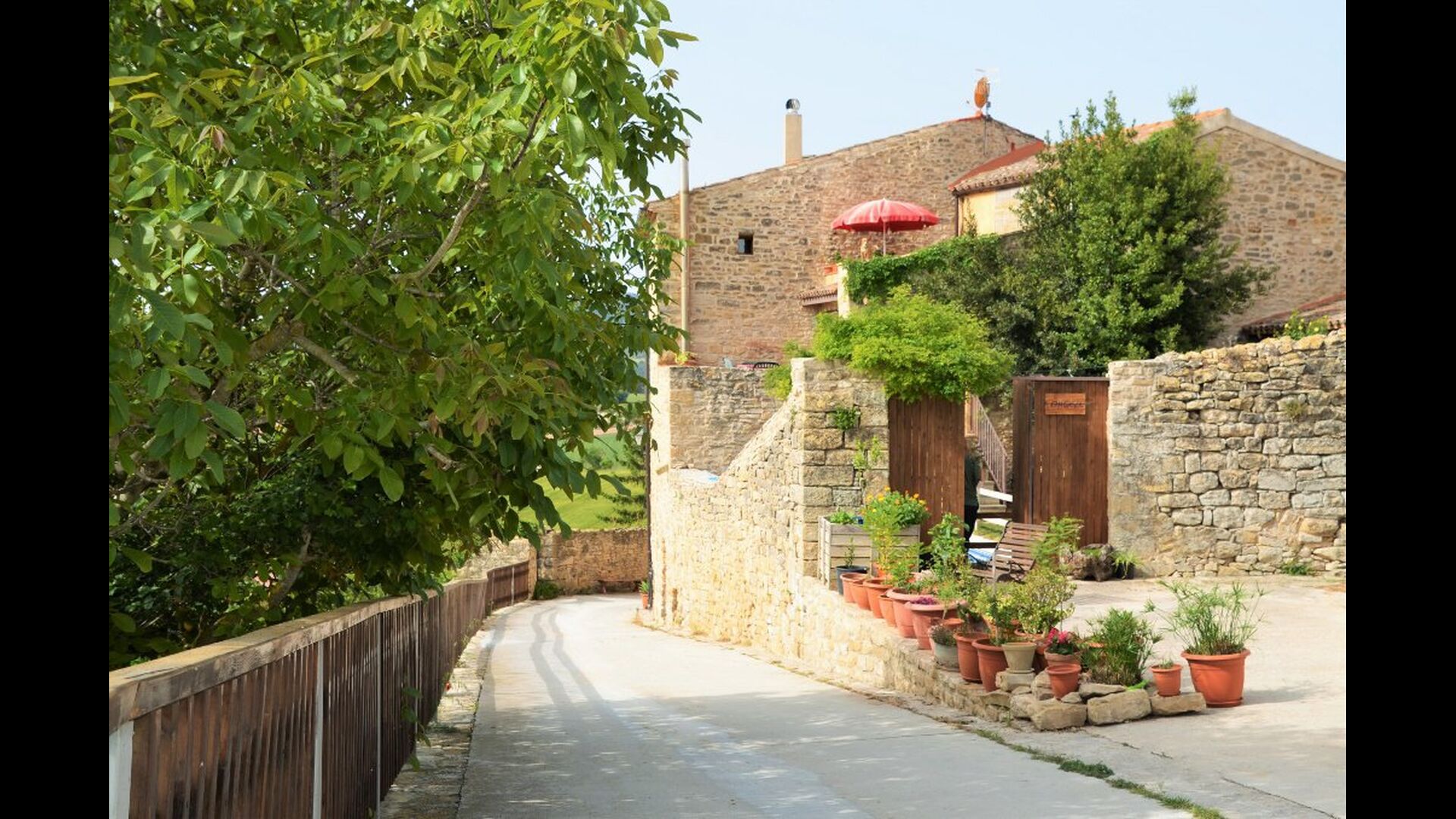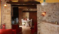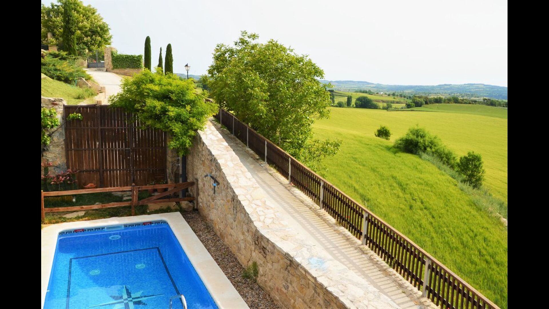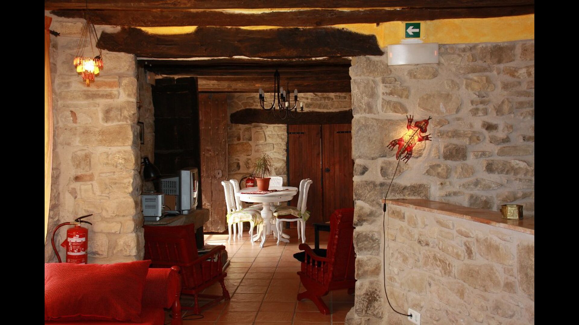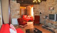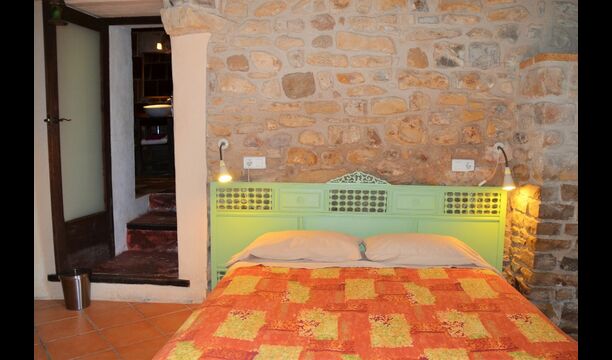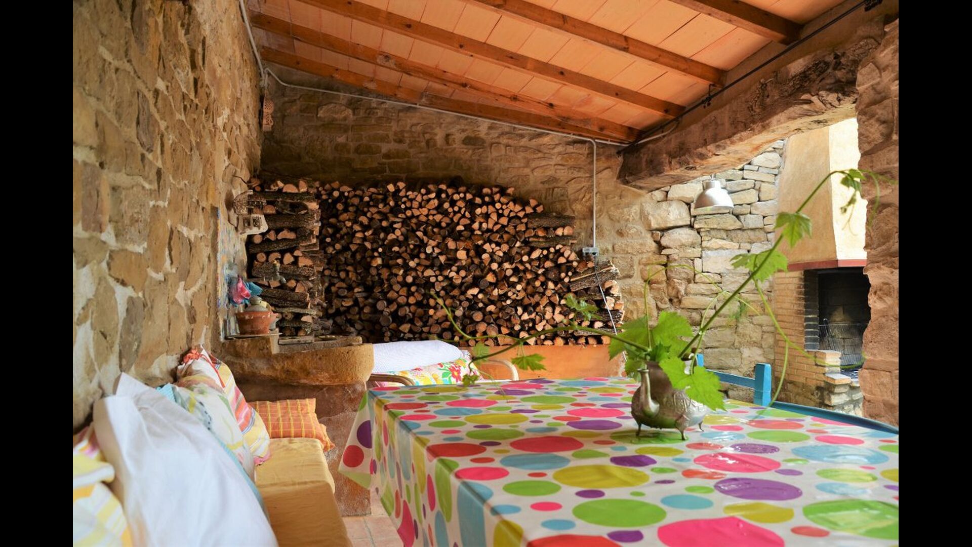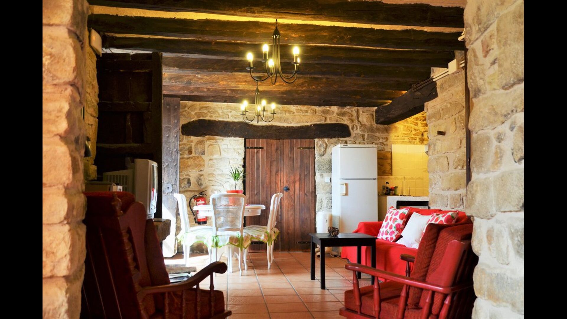 La calle Mayor es el acceso principal, entramos por un recibidor distribuidor con un suelo de piedra de río de canto redondo, aquí encontramos la sala de estar-comedor y una terraza que da a ponente, dos habitaciones con baño, al fondo una cocina con su antigua pica de piedra, y un espacio donde está la entrada de la antigua cisterna y el horno de pan convertido en terracita, ya que lo encontramos totalmente derruido. Desde aquí a través de una puerta con llave bajamos unas escaleras que nos llevan a un jardín envuelto por un muro de piedra, el cual hemos bajado un poco para que se vea desde dentro el paisaje. En este espacio tenemos la piscina, una barbacoa y un porche cubierto, ideal para cenas, lecturas y para el descanso en general.
