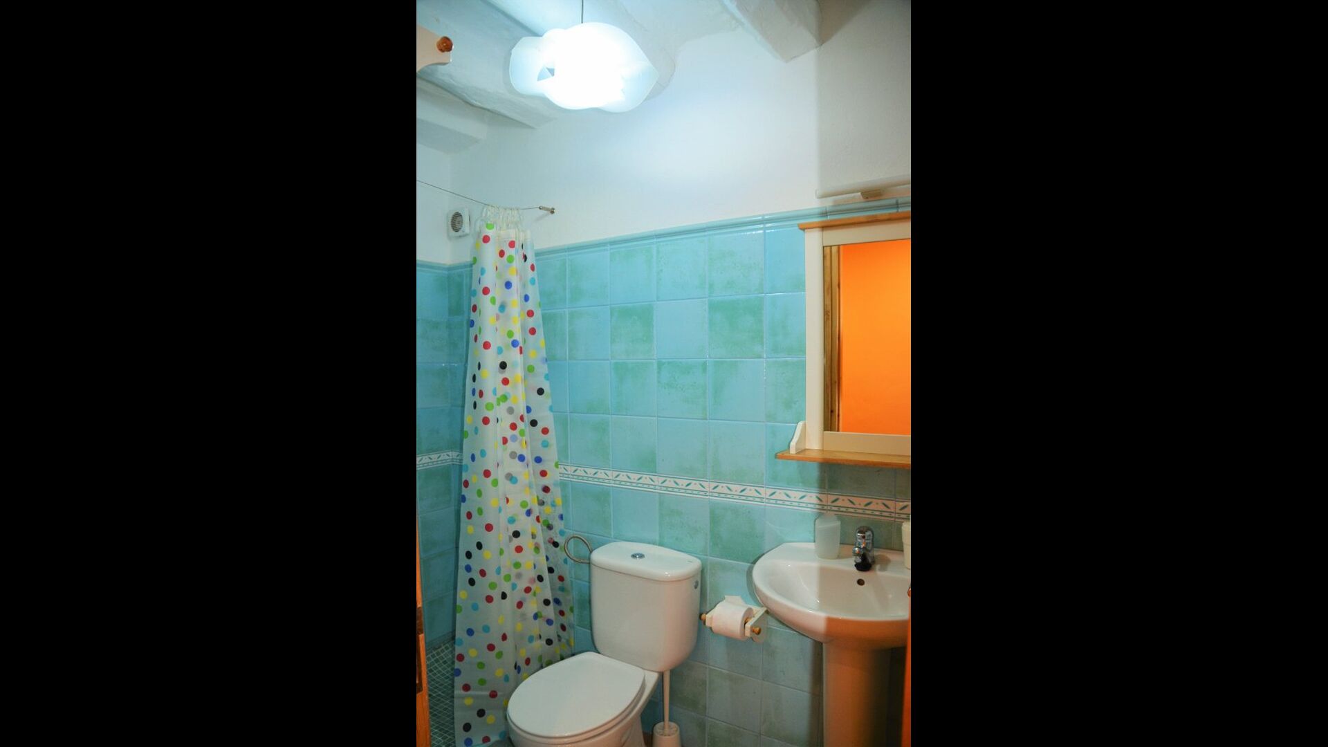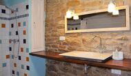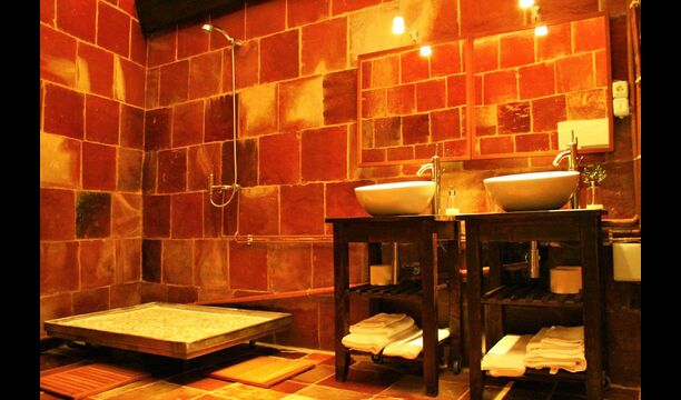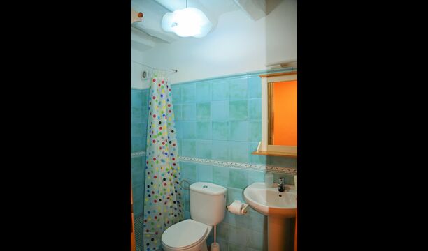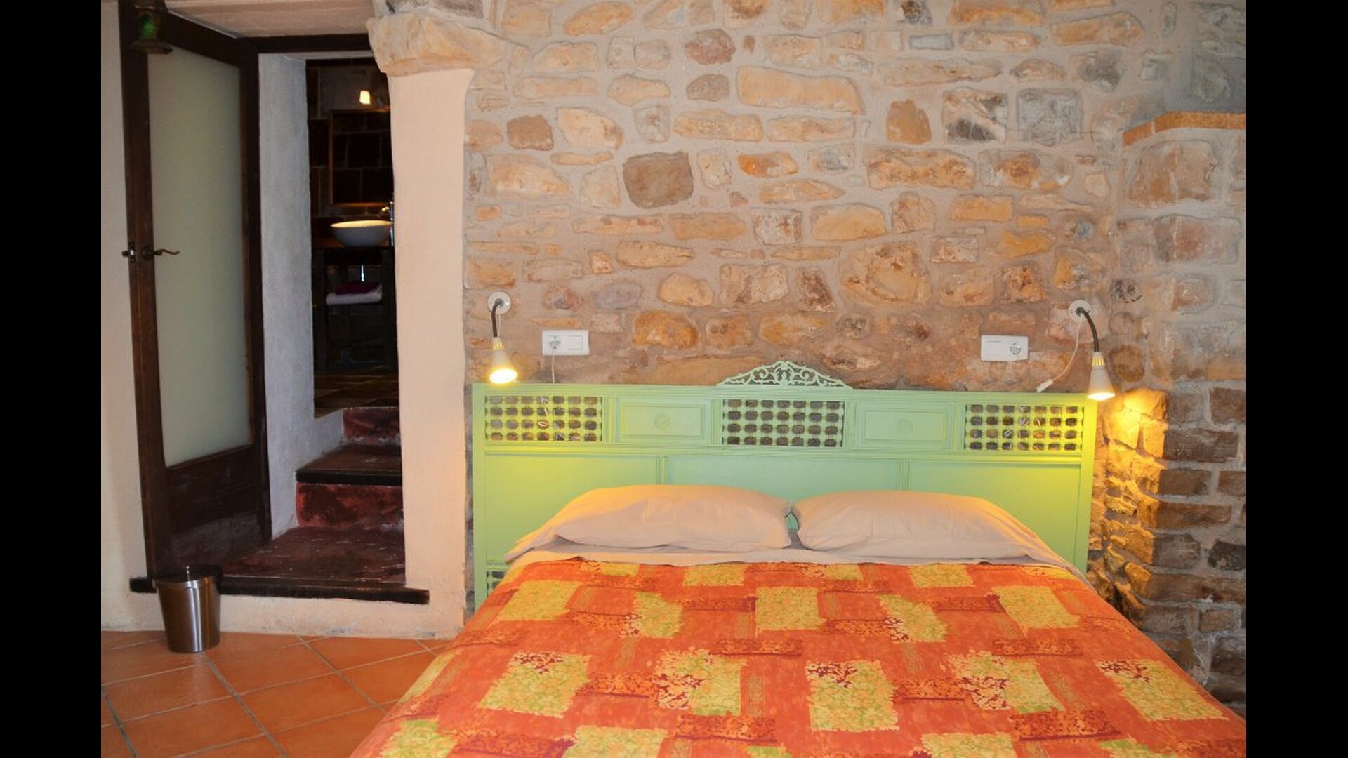 Para encontrar las demás habitaciones hemos de volver al recibidor, de donde sale una escalera de piedra que baja hacia abajo y encontramos a izquierda y derecha las habitaciones restantes, dos de ellas tienen baño dentro y las otras dos comparten uno.