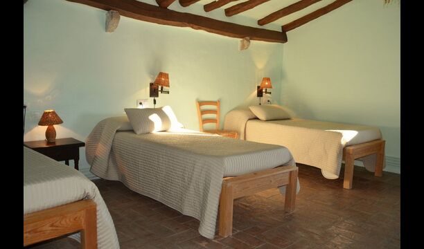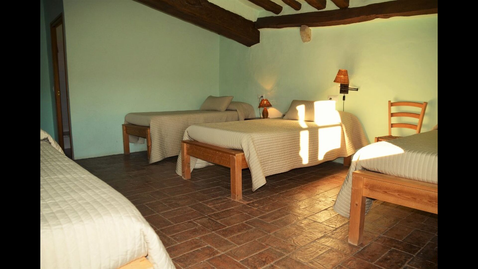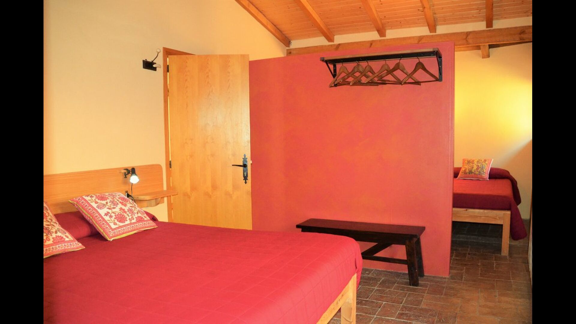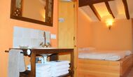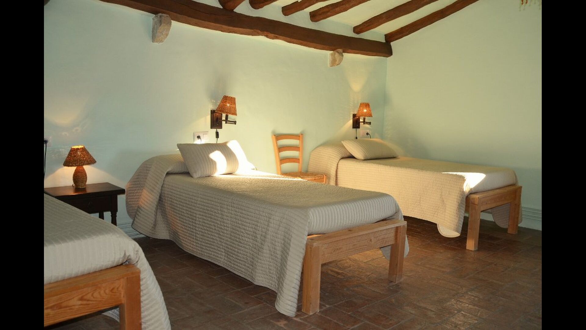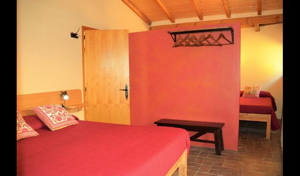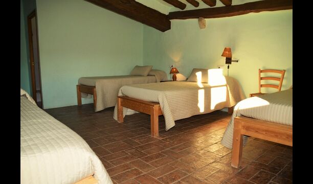 En el primer piso, se encuentran las habitaciones. En primer lugar, hay un dormitorio con dos camas individuales (que se pueden mover juntas) y una litera. A continuación, hay una habitación con cuatro camas individuales, que es perfecta para los niños en un grupo de vacaciones, y finalmente una habitación doble (con posibilidad de camas adicionales) con baño privado y acceso directo a una terraza. Las dos habitaciones dobles restantes están conectadas y ubicadas en una pequeña casa separada en el jardín. Aquí hay, por supuesto, también un baño con ducha.