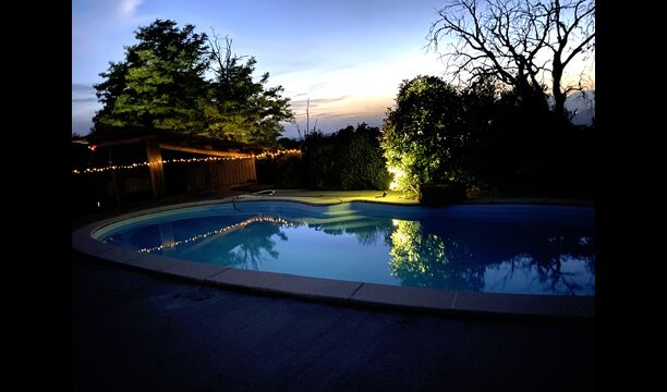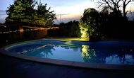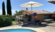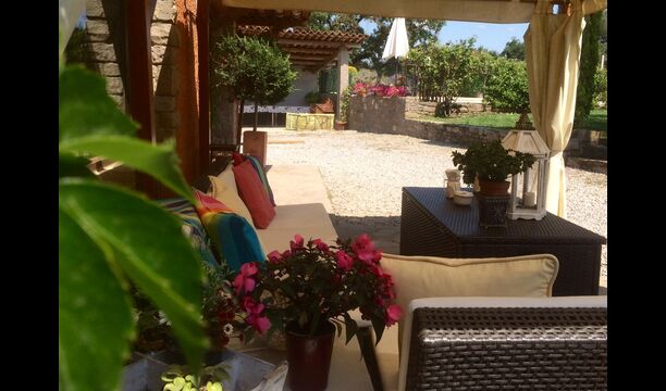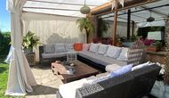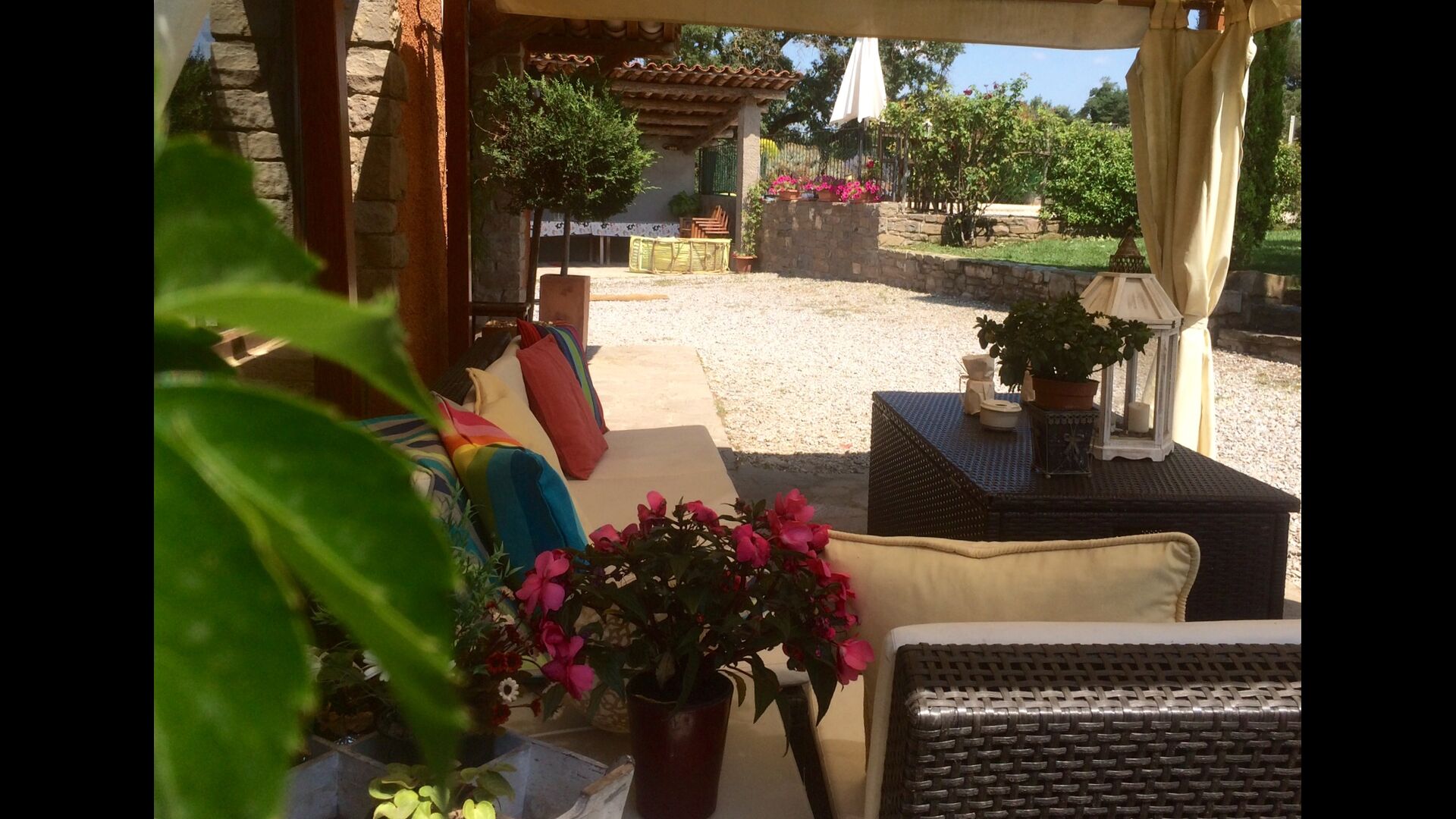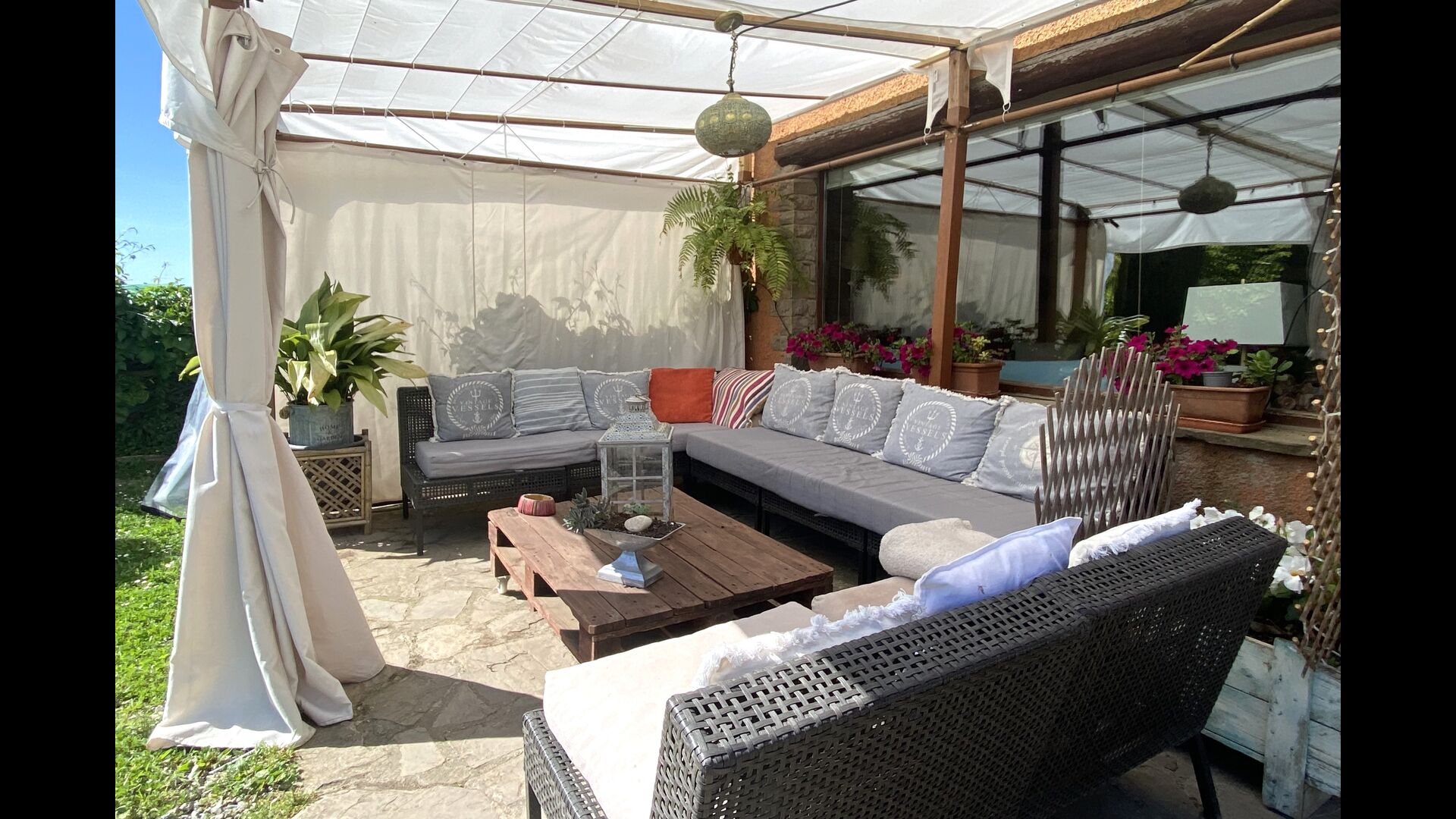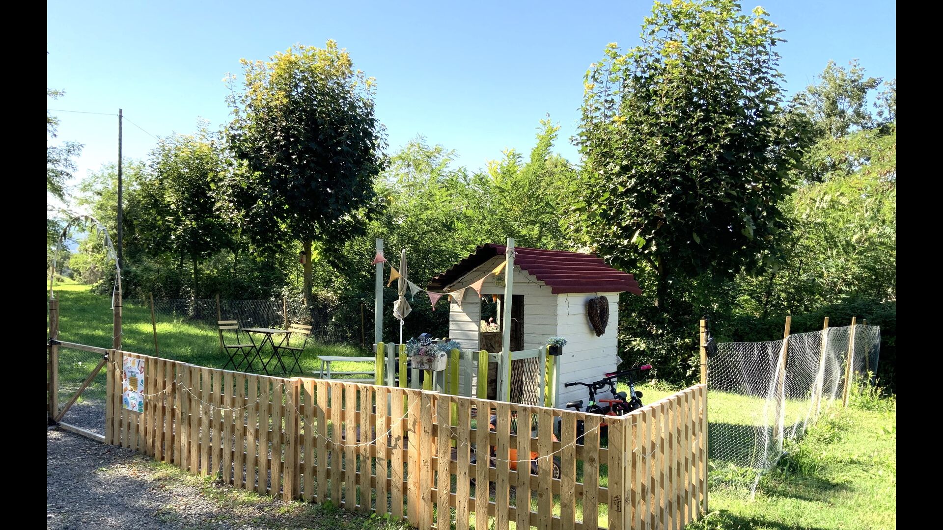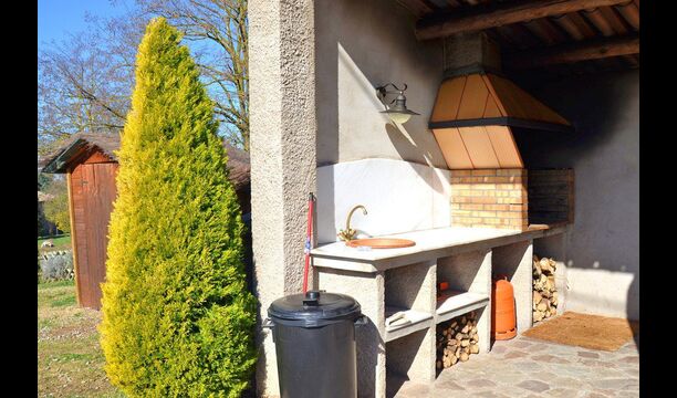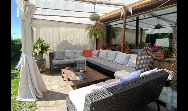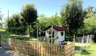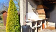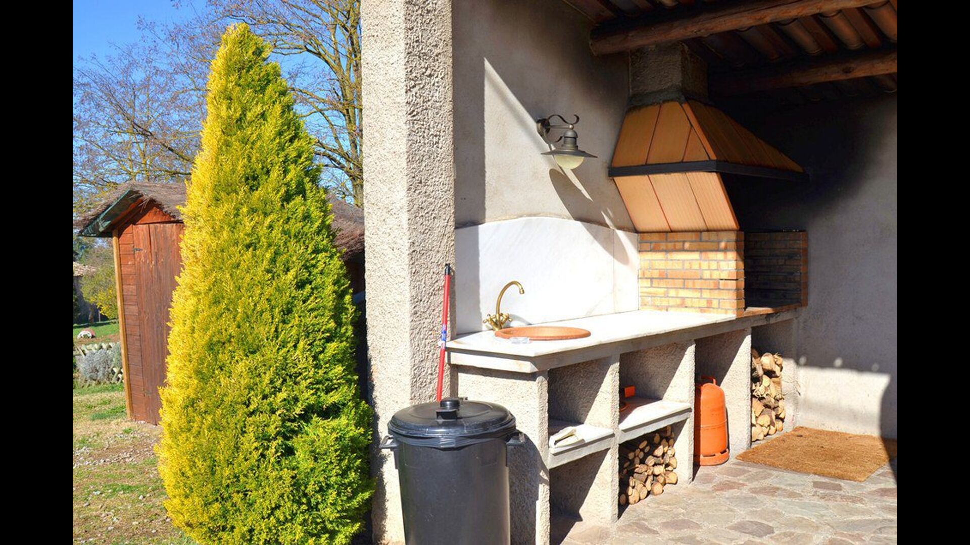 En el jardín hay una piscina privada vallada (cada una de las dos casas tiene su propia piscina) y al final de la piscina hay una terraza cubierta con barbacoa y cocina al aire libre. También hay una pequeña terraza en frente de la casa y en el césped hay un pequeño pabellón, donde también puedes encontrar sombra en los calurosos días de verano.