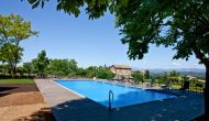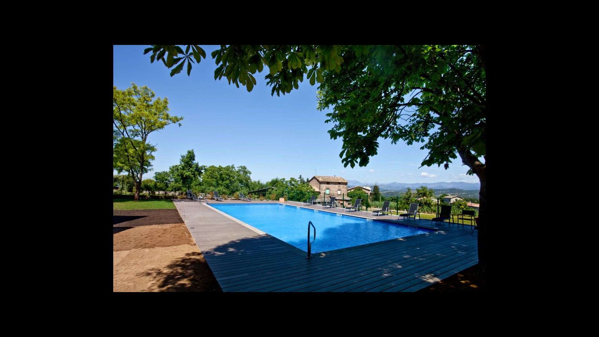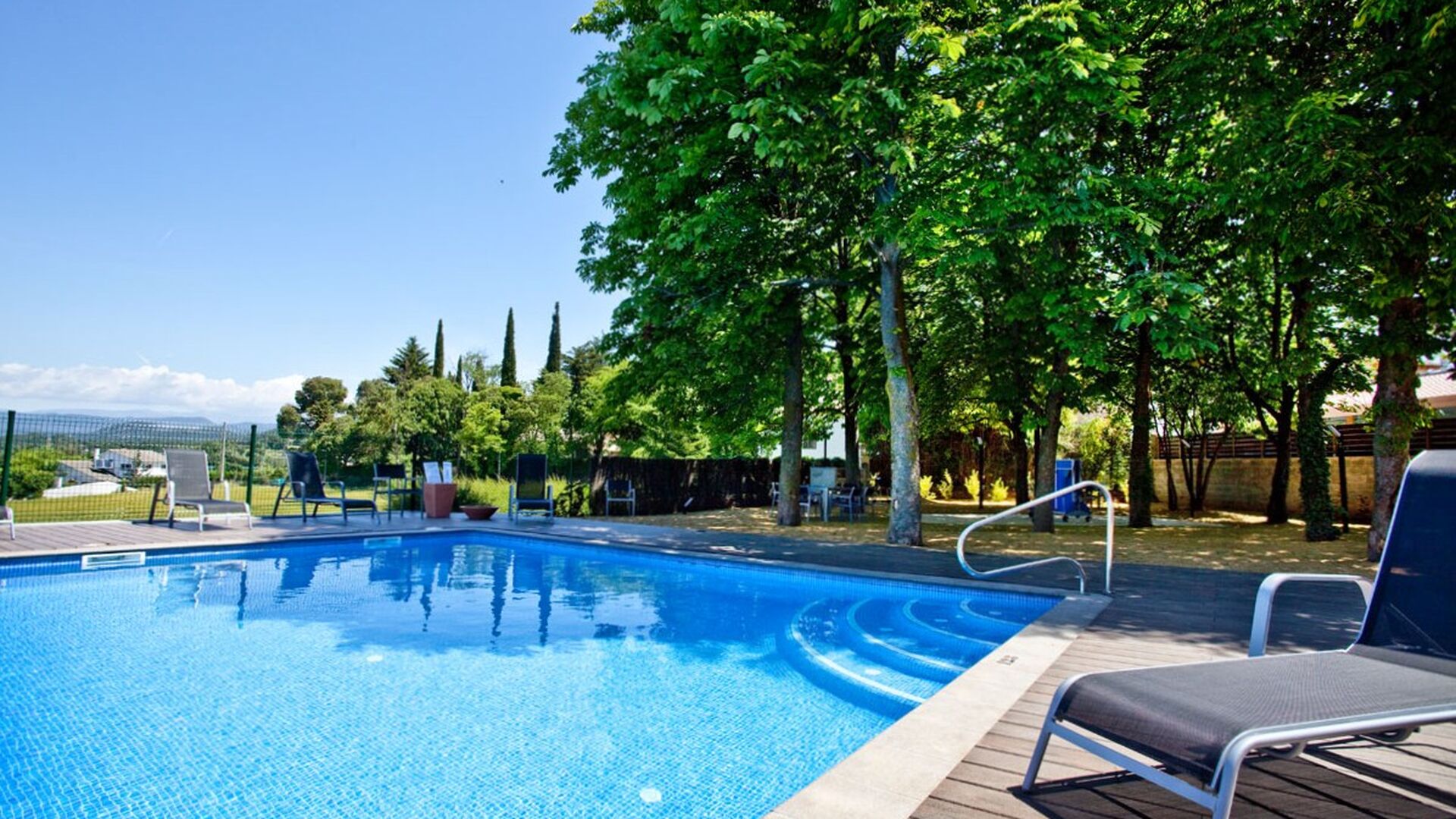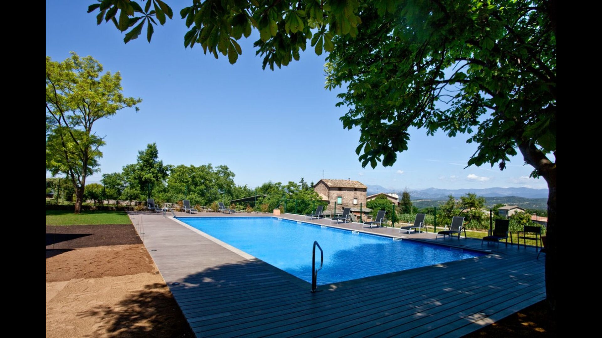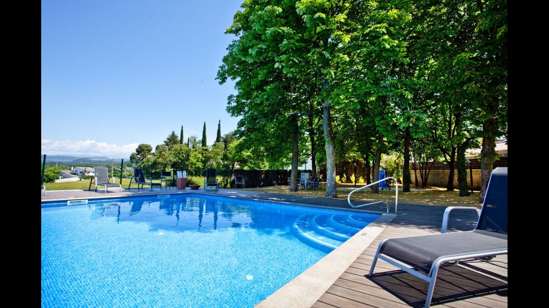 Además, la parte trasera de la casa se convirtió en la fantástica zona de la piscina con la gran piscina (17 x 5 metros), cafetería y cafetería. mesas, aseos y vestuarios, y rincones con sombra y lugares soleados. La vista es impresionante, directamente a los Pirineos.