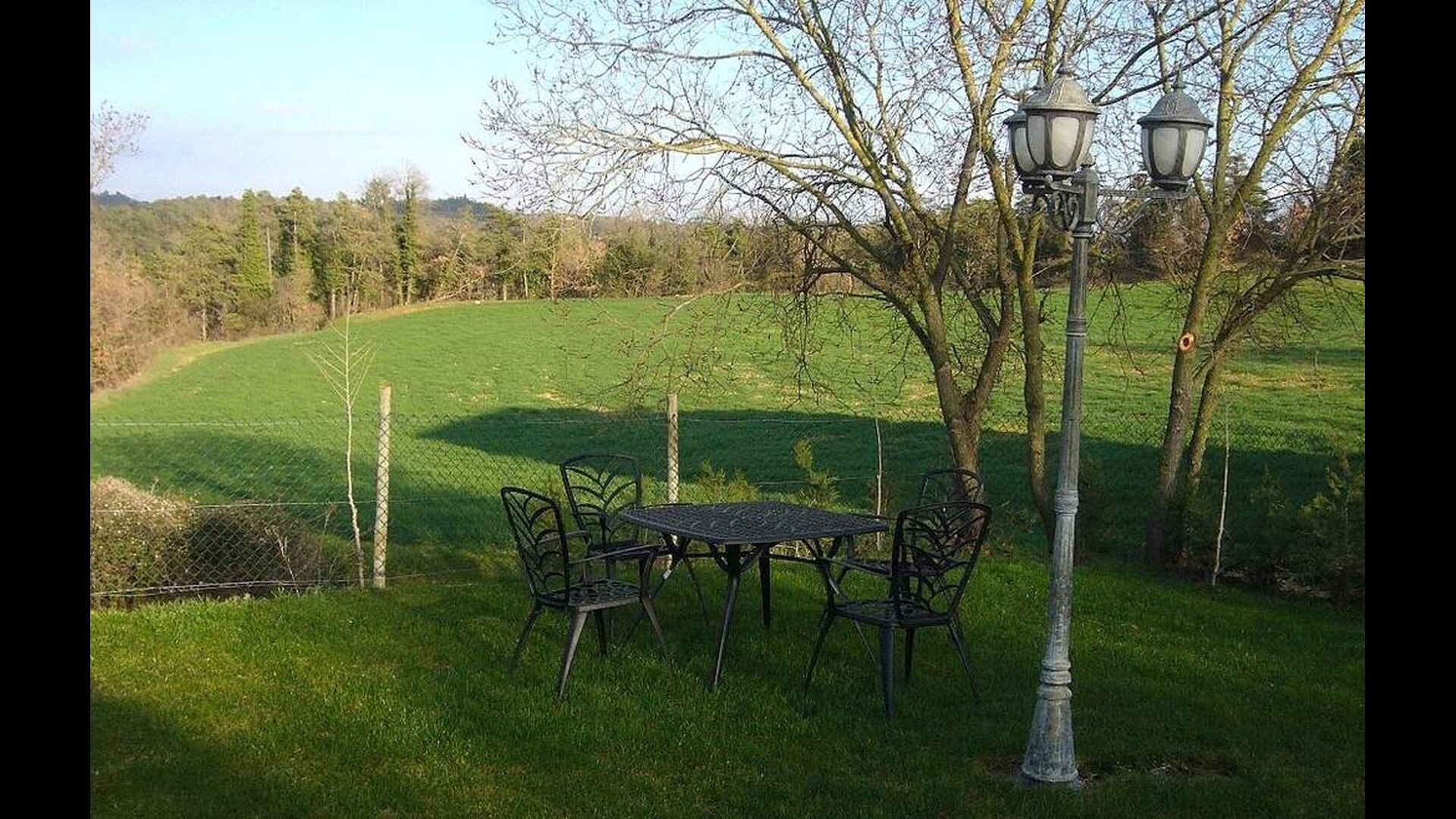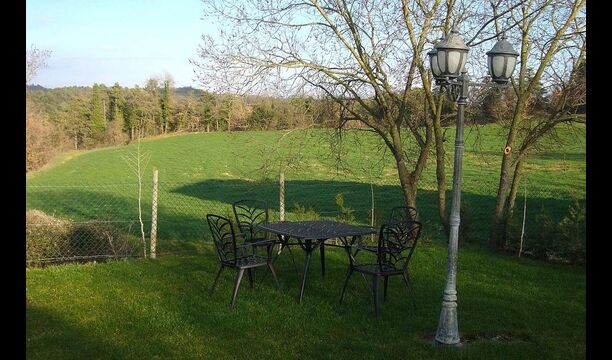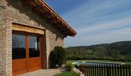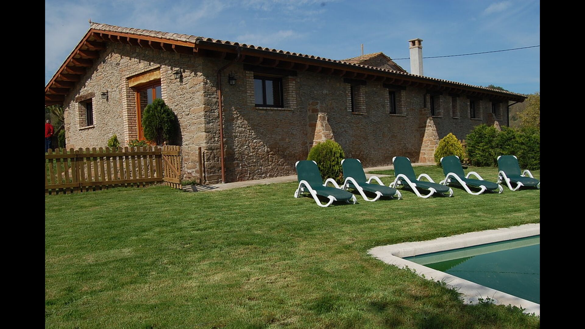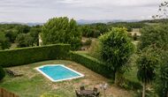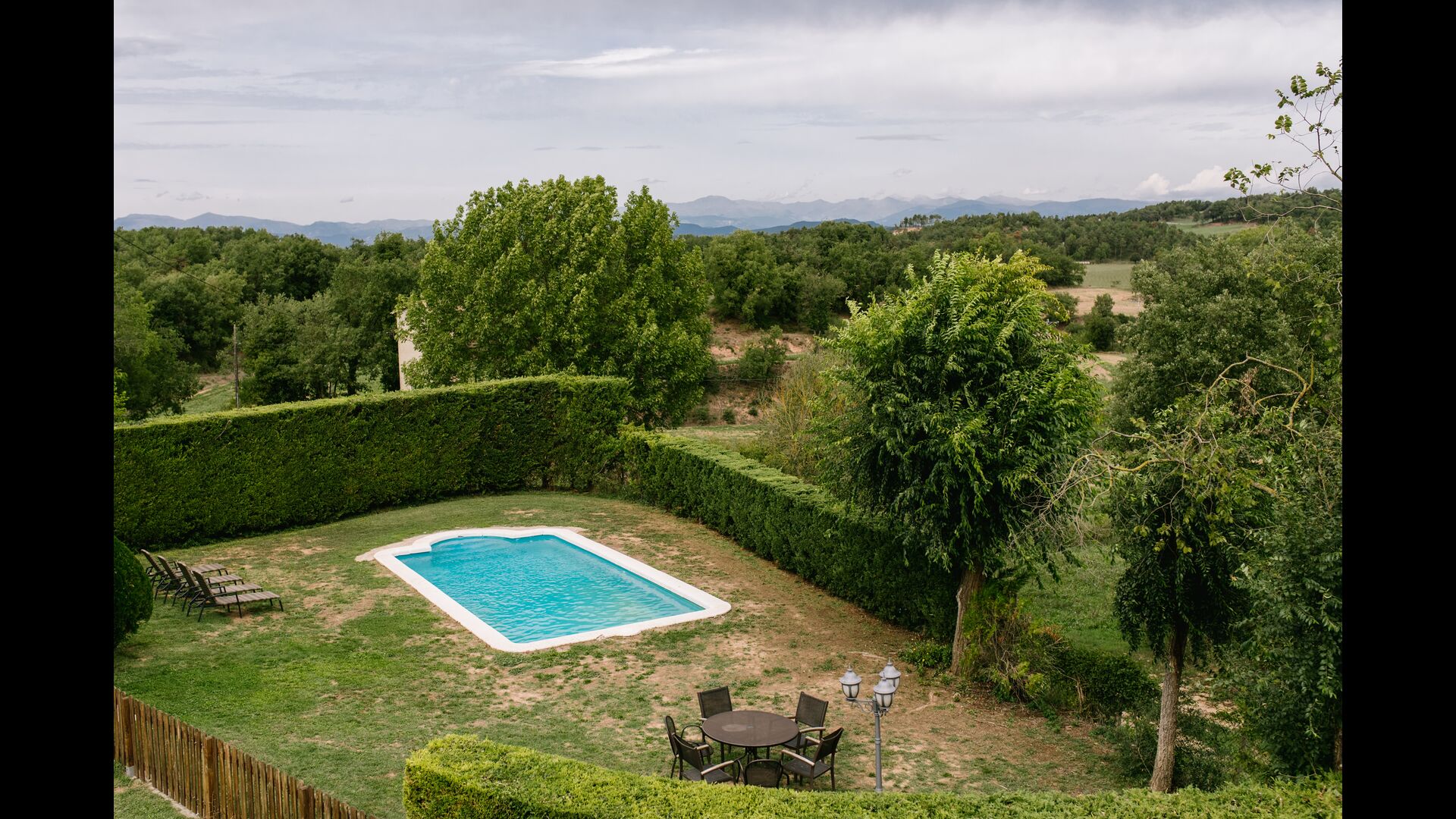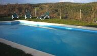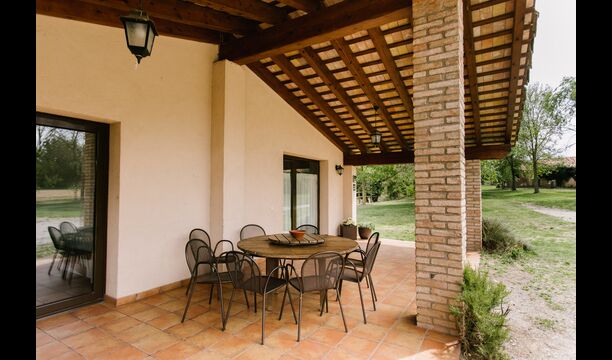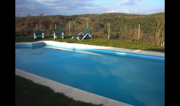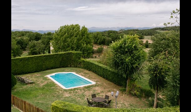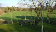 Debajo de la casa, hay un jardín vallado con piscina y sillas de playa. El jardín y la piscina se comparten actualmente entre las dos casas de vacaciones. Hay una vista impresionante sobre los campos de abajo, y en el horizonte los Pirineos. La casa está rodeada de naturaleza, una granja y con larga distancia al vecino más cercano.