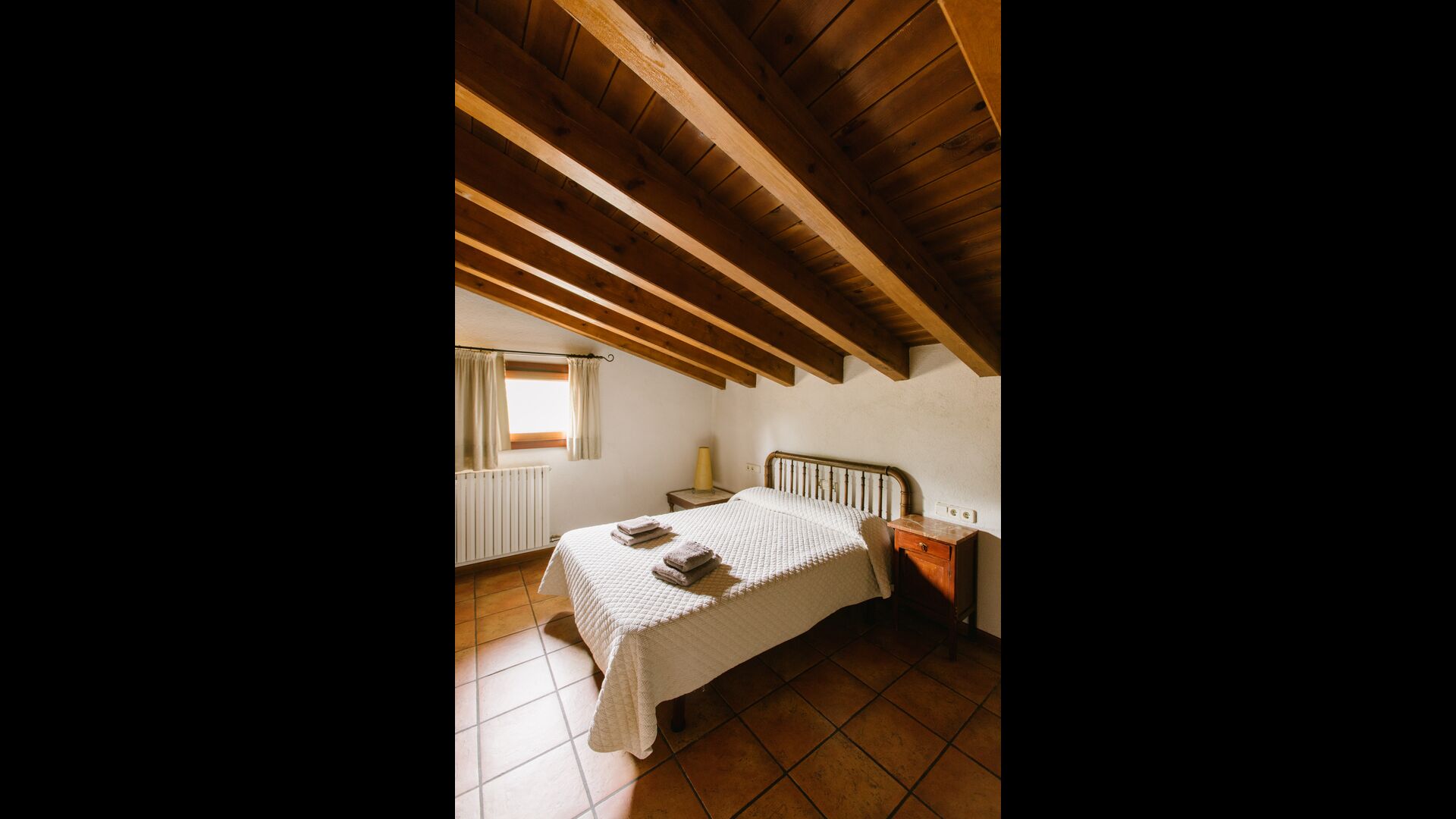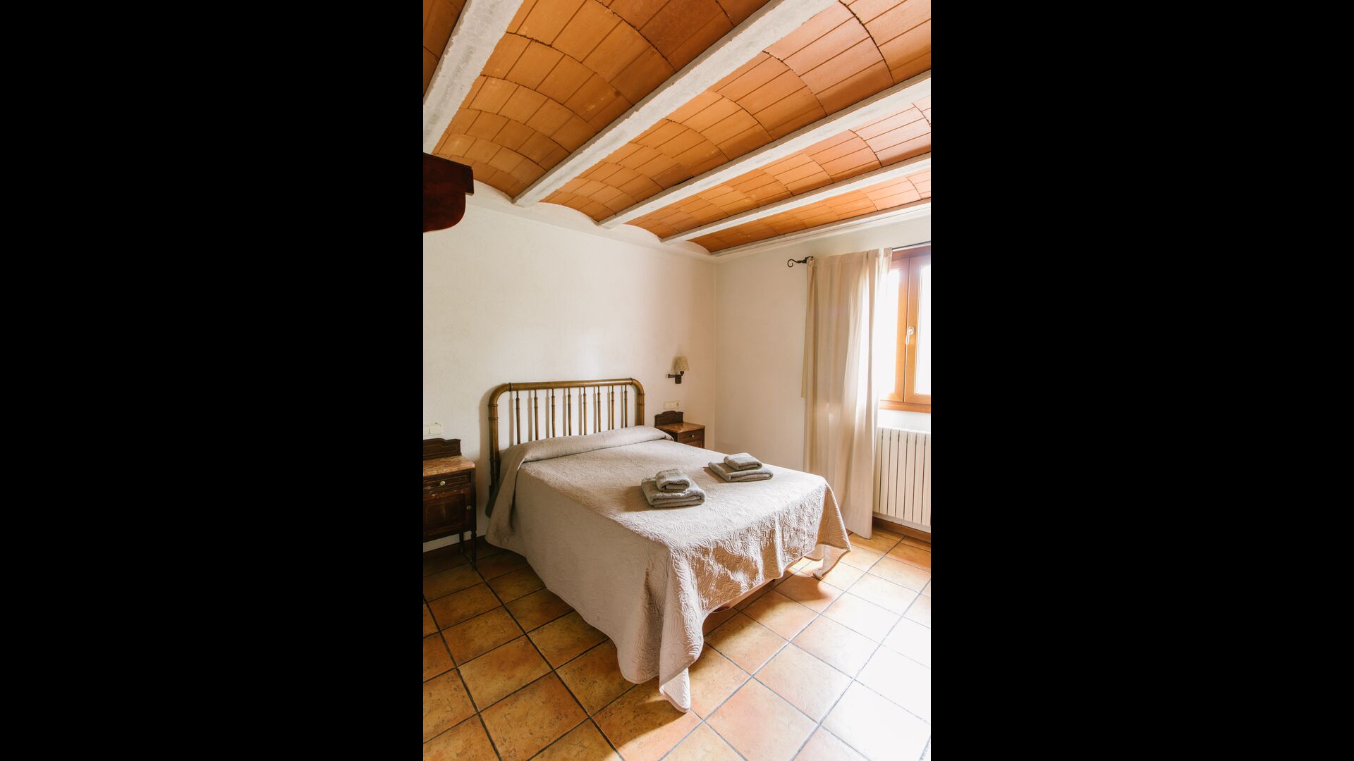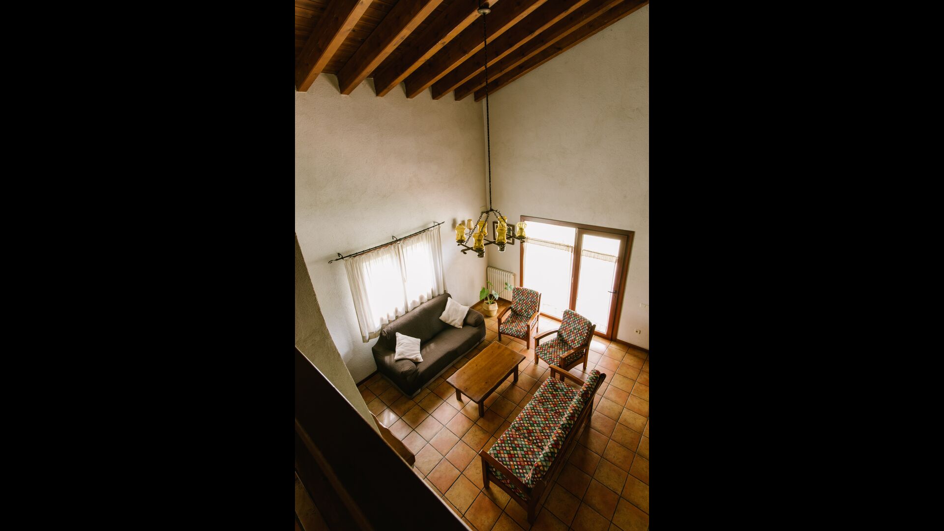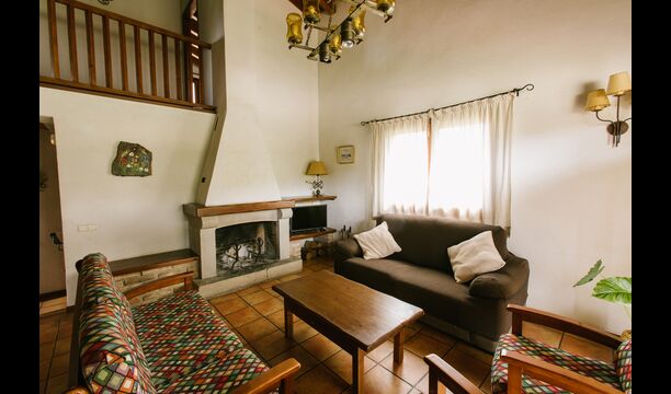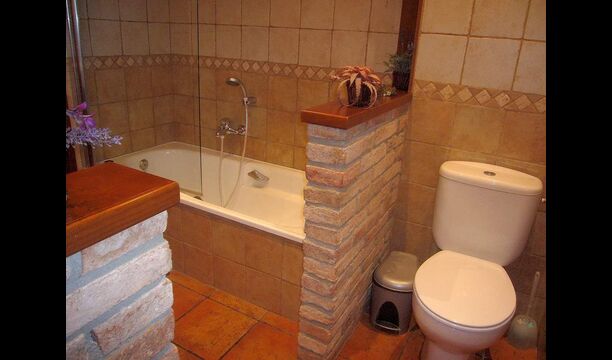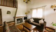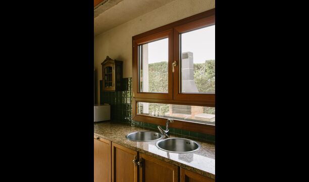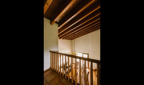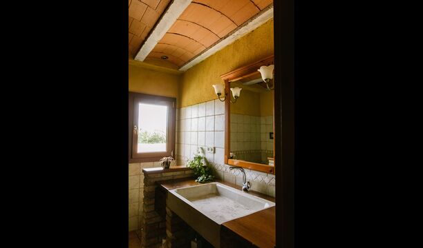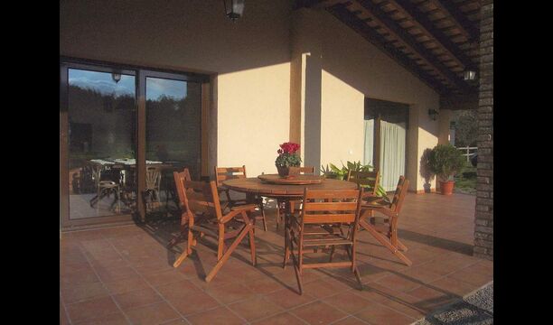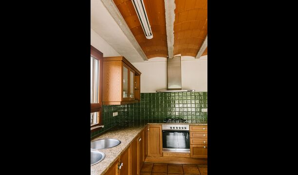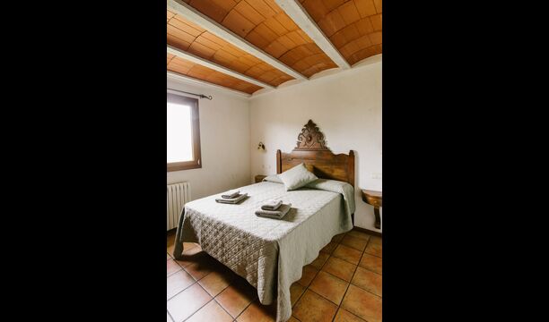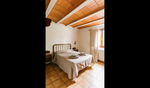La casa es perfecta para un grupo o familia numerosa, ya que cuenta con 5 habitaciones dobles y dos baños distribuidos en las dos plantas. En la planta baja, hay una sala de estar con comedor y acceso a la cocina. En los cálidos veranos catalanes, a menudo se prefiere comer en la terraza con acceso directo desde la cocina, equipada con hermosos muebles de maderas oscuras.