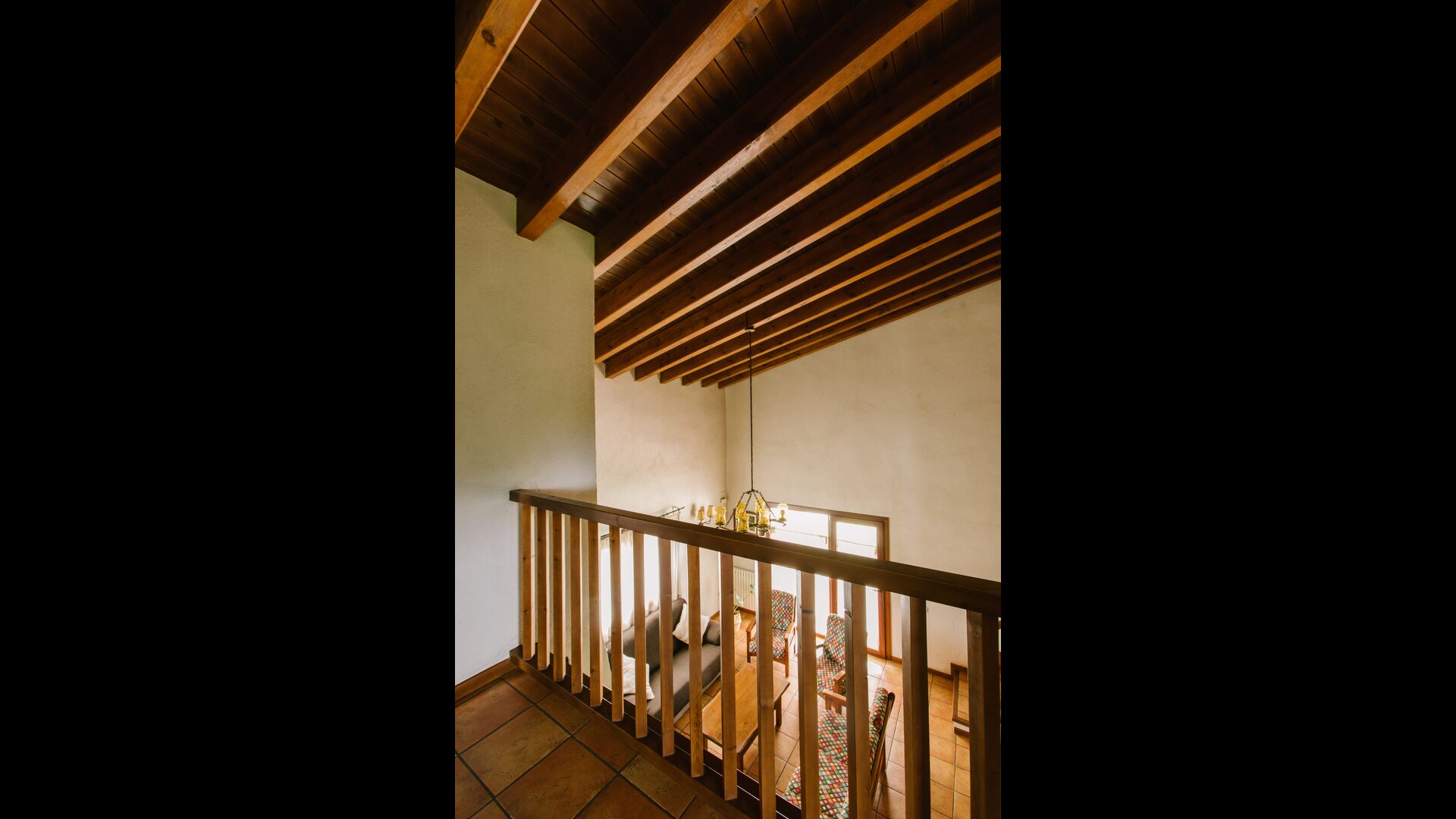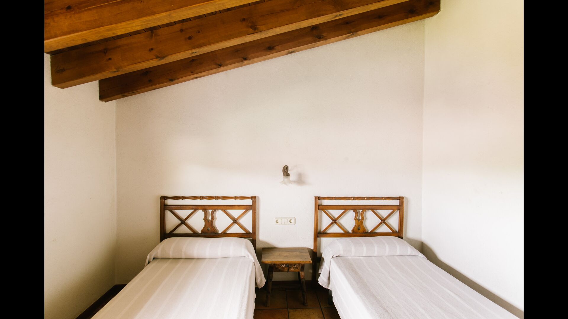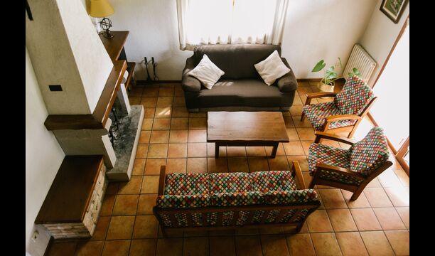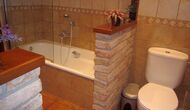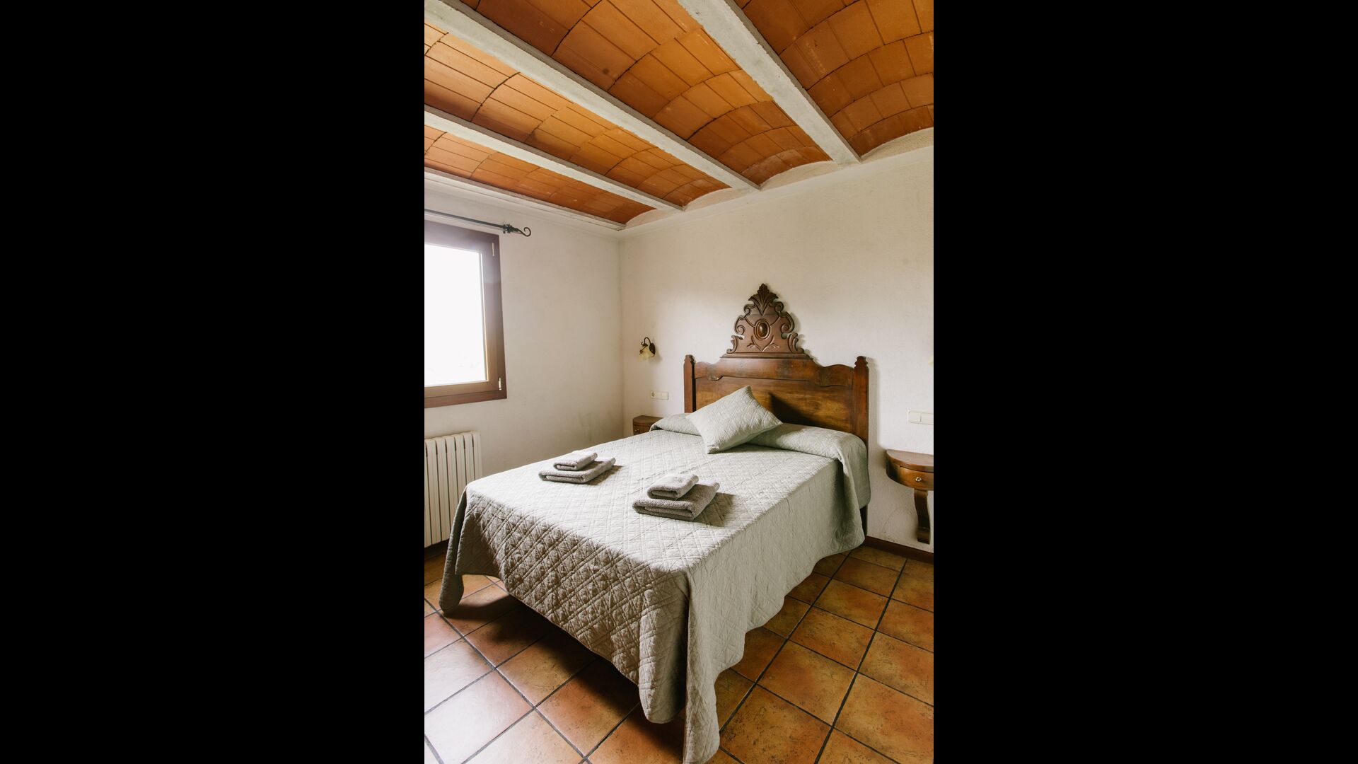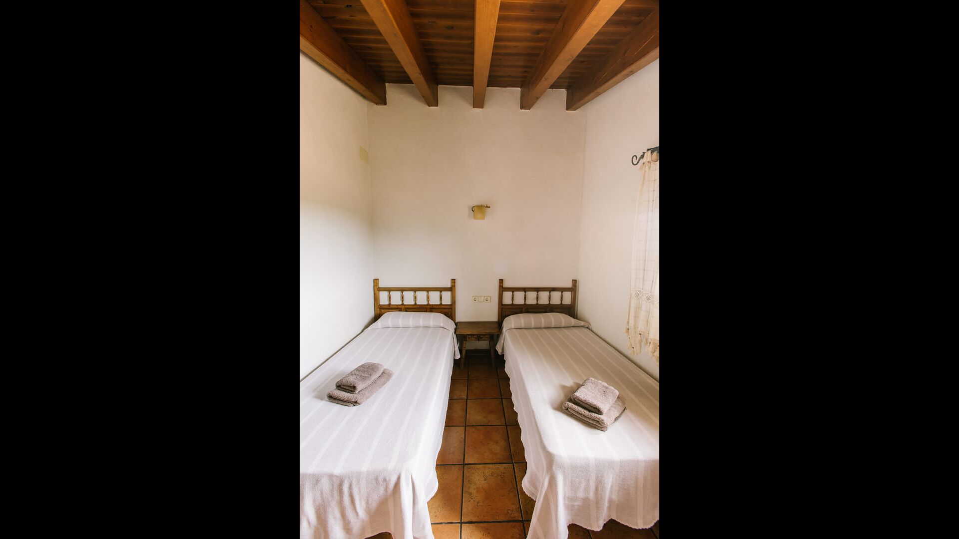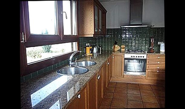 La casa es perfecta para un grupo o familia numerosa, ya que cuenta con 5 habitaciones dobles y dos baños distribuidos en las dos plantas. En la planta baja, hay una sala de estar con comedor y acceso a la cocina. En los cálidos veranos catalanes, a menudo se prefiere comer en la terraza con acceso directo desde la cocina, equipada con hermosos muebles de maderas oscuras.