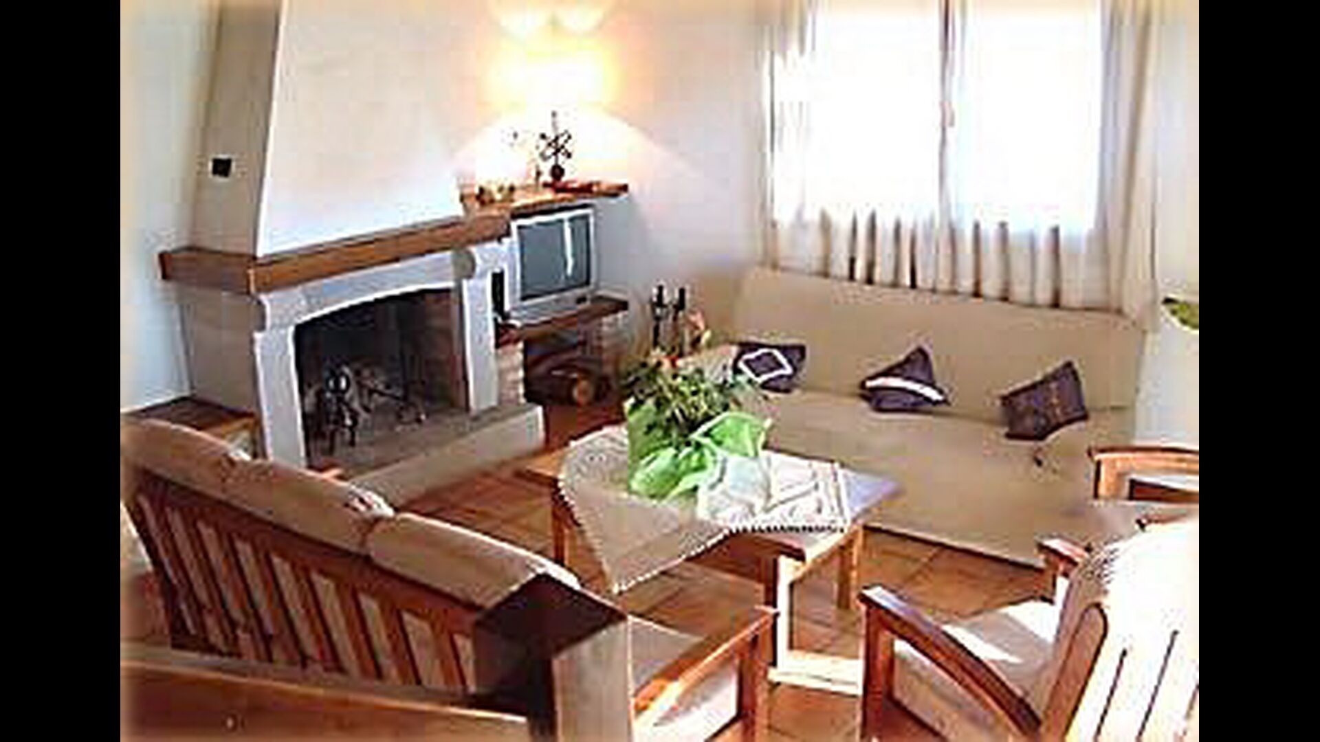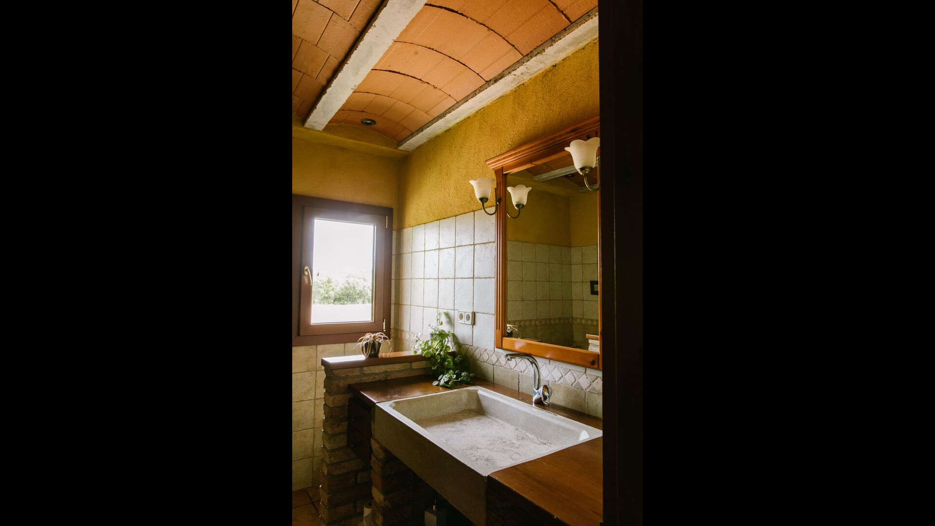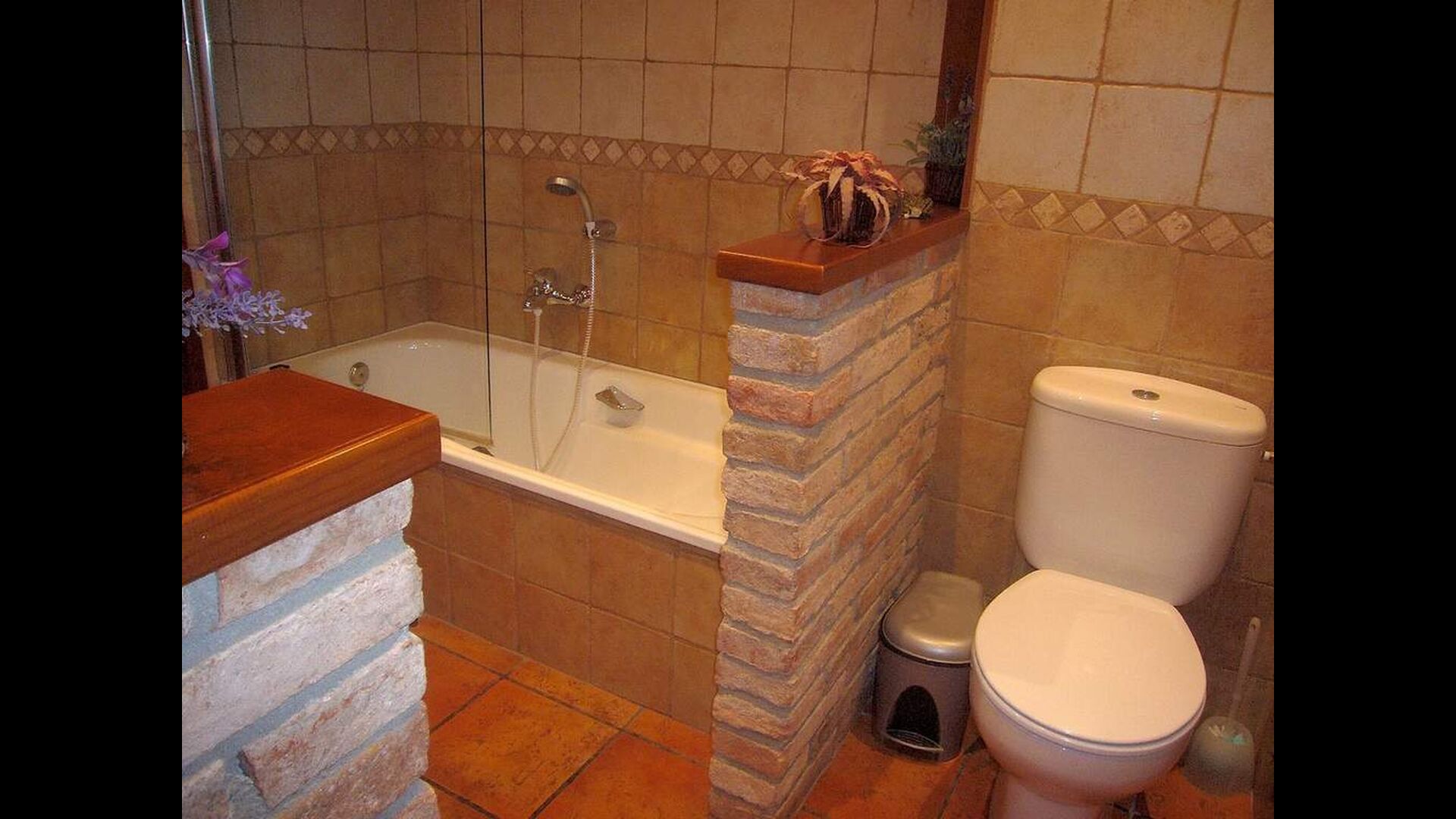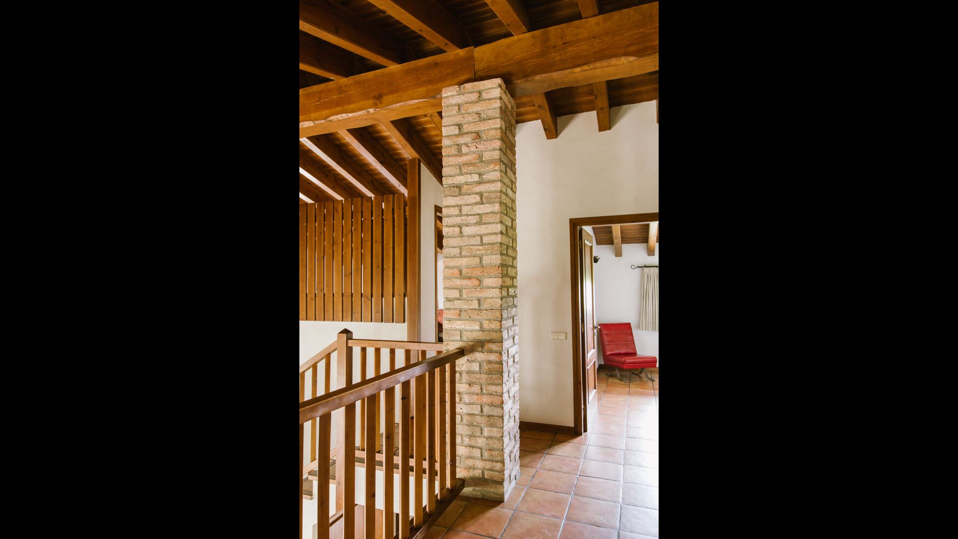 La casa es perfecta para un grupo o familia numerosa, ya que cuenta con 5 habitaciones dobles y dos baños distribuidos en las dos plantas. En la planta baja, hay una sala de estar con comedor y acceso a la cocina. En los cálidos veranos catalanes, a menudo se prefiere comer en la terraza con acceso directo desde la cocina, equipada con hermosos muebles de maderas oscuras.
