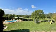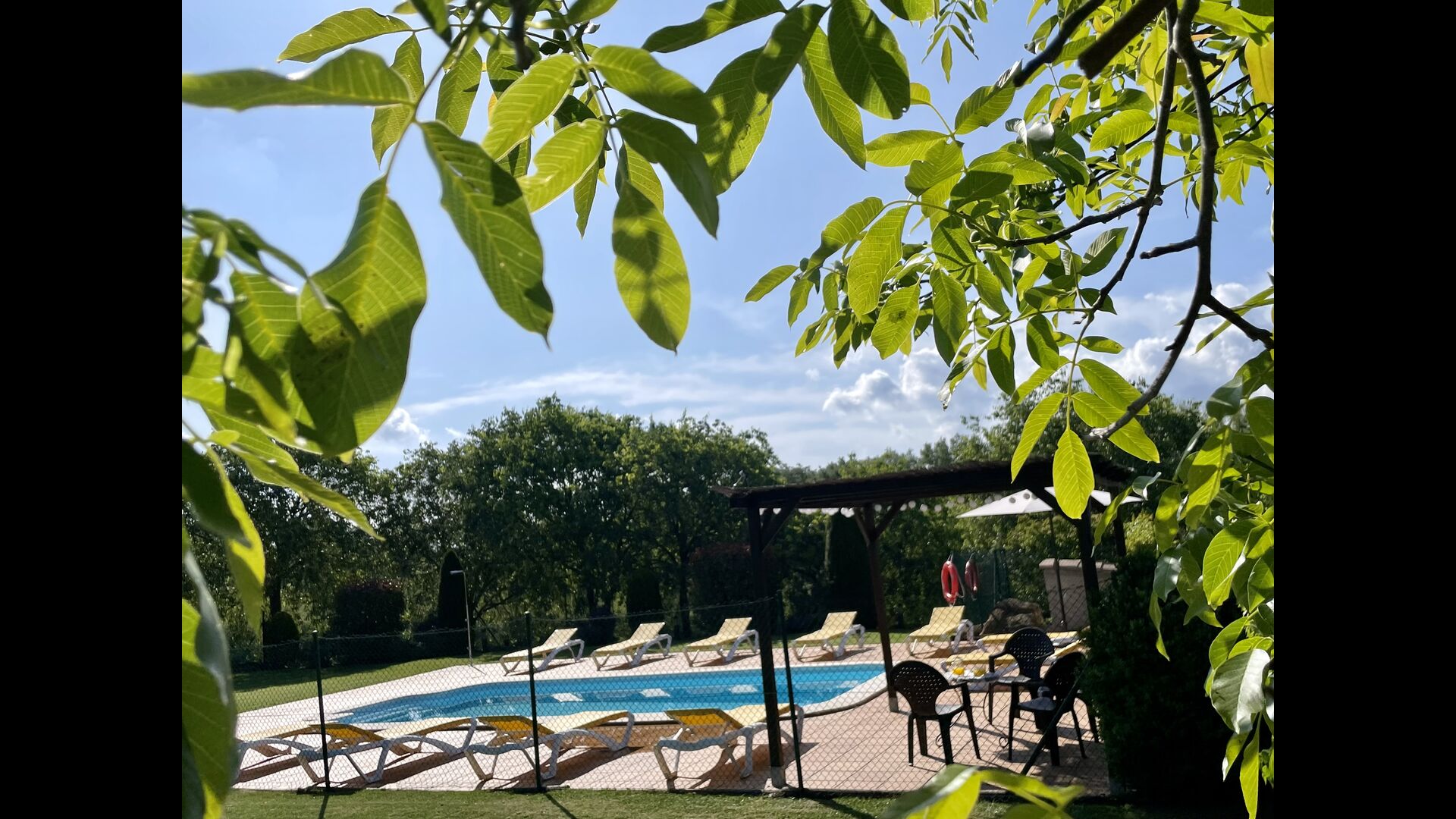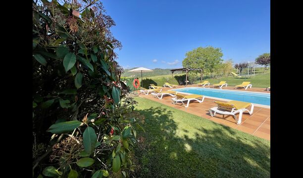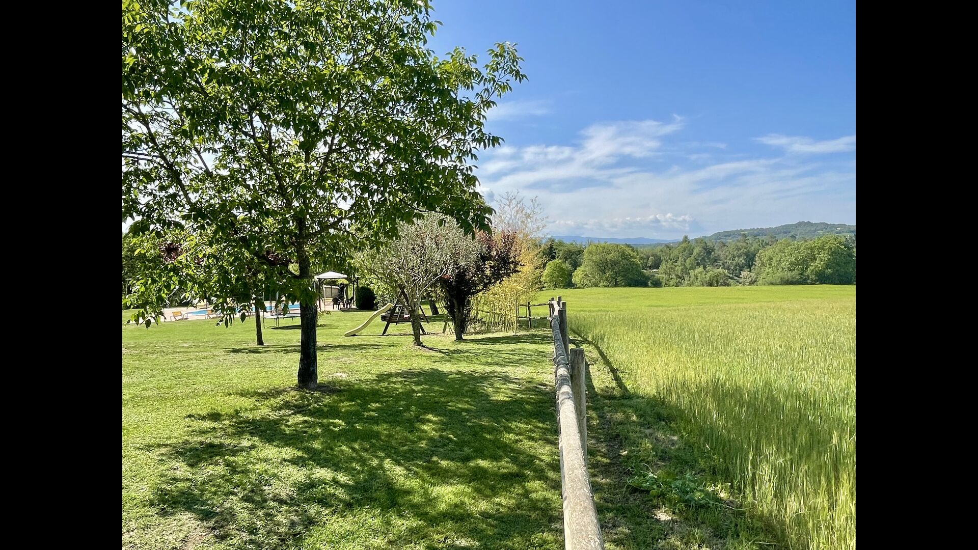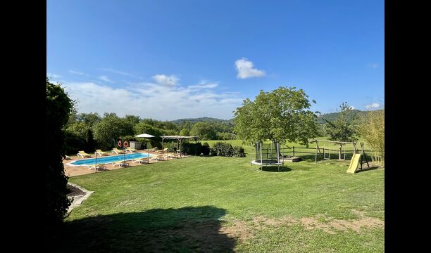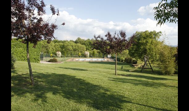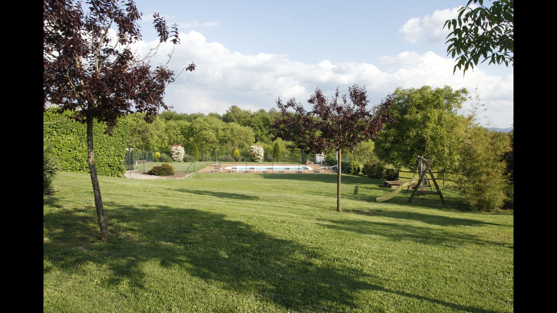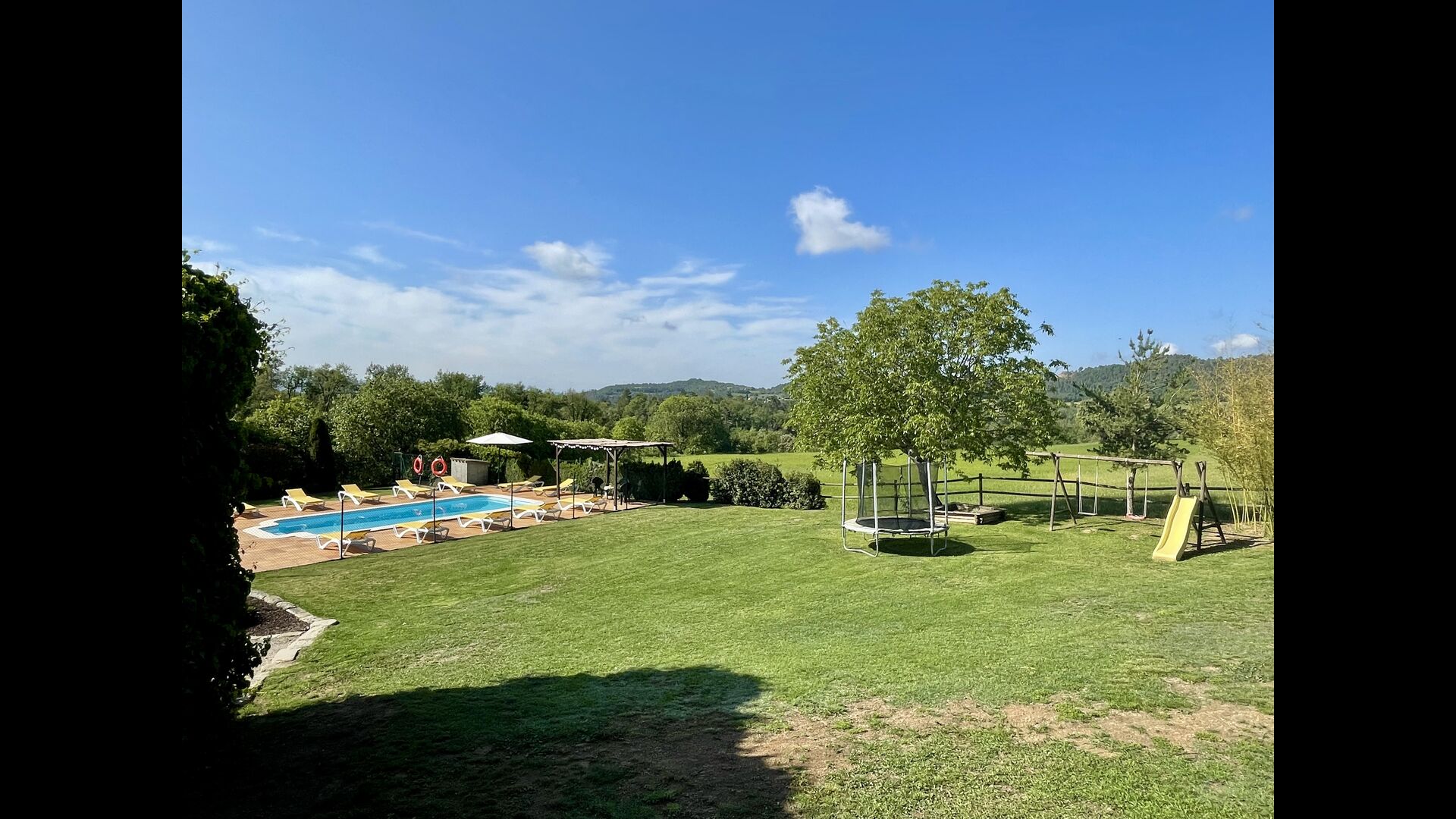 La impresionante puerta, lo suficientemente grande en la antigüedad para que entraran los coches de caballos, da acceso a la hermosa zona ajardinada y de piscina. En un extremo, el césped con algunos árboles que dan sombra. Además, hay un cajón de arena y columpios para los más pequeños, y algunas mesas, para comidas ligeras. En el otro extremo, la piscina con escalones romanos, esto es realmente muy agradable, cuando tienes niños pequeños en tu grupo. Con una bebida fría y un libro y con la hermosa vista sobre el paisaje montañoso con campos y bosques, la tranquilidad y los sonidos hacen desaparecer los últimos restos de la estresante vida diaria.