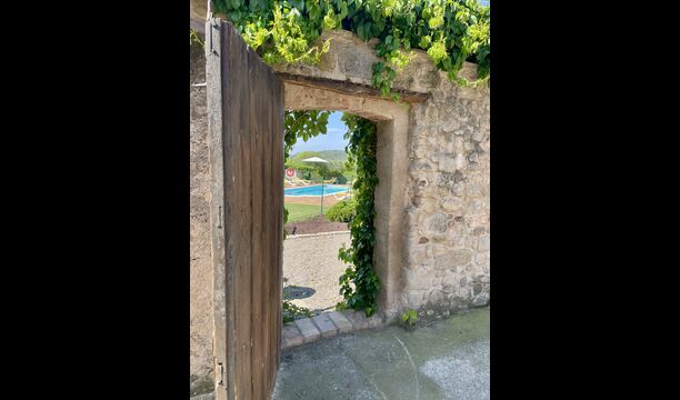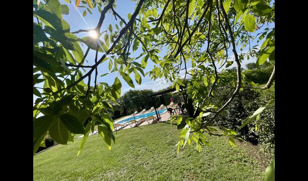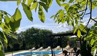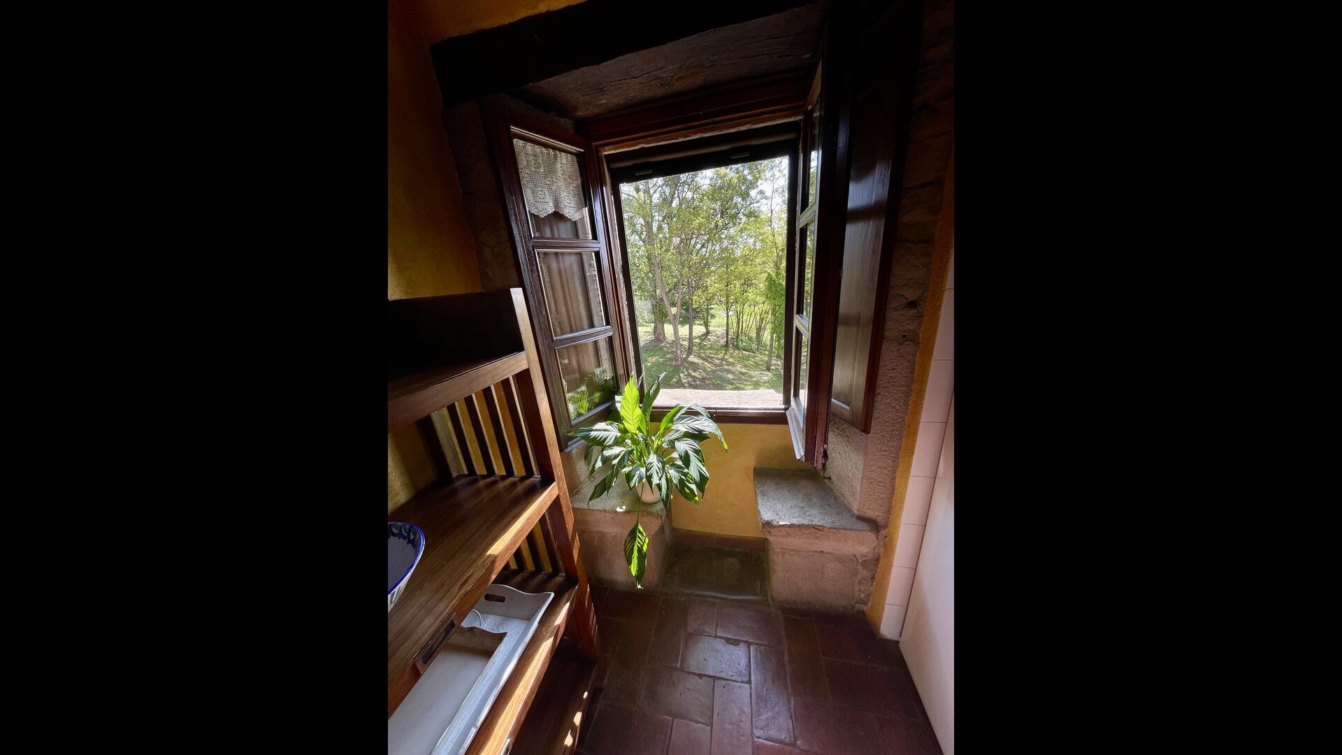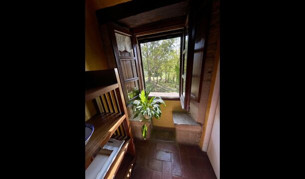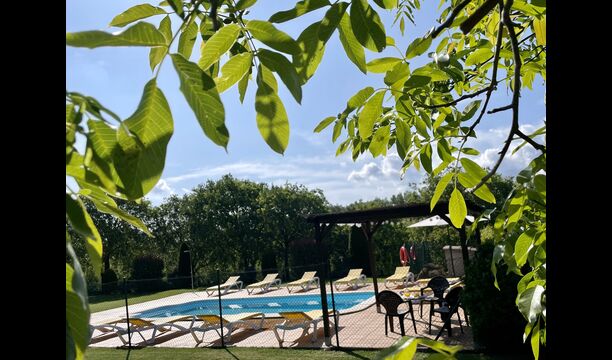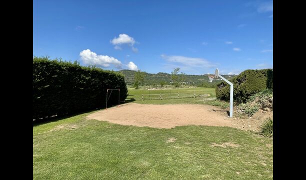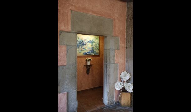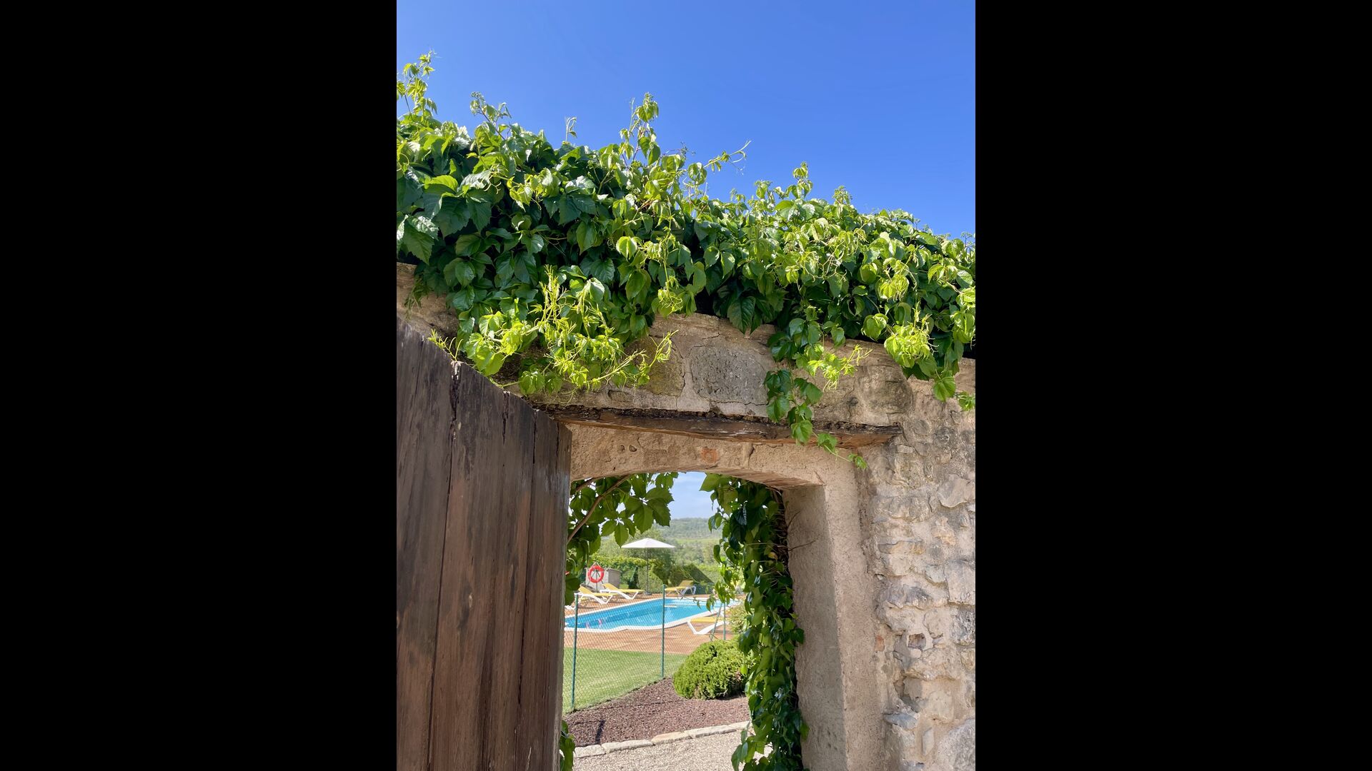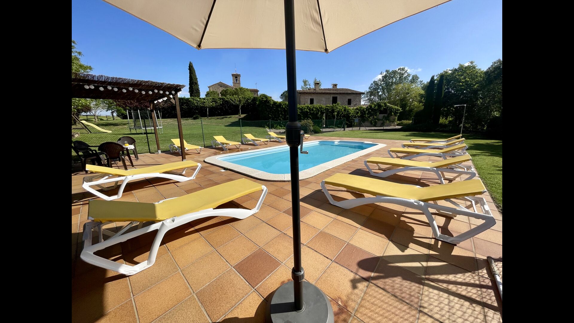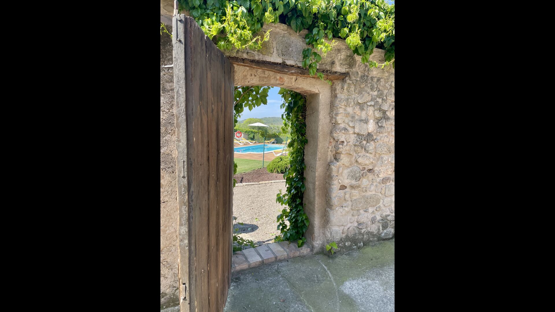 La impresionante puerta, lo suficientemente grande en la antigüedad para que entraran los coches de caballos, da acceso a la hermosa zona ajardinada y de piscina. En un extremo, el césped con algunos árboles que dan sombra. Además, hay un cajón de arena y columpios para los más pequeños, y algunas mesas, para comidas ligeras. En el otro extremo, la piscina con escalones romanos, esto es realmente muy agradable, cuando tienes niños pequeños en tu grupo. Con una bebida fría y un libro y con la hermosa vista sobre el paisaje montañoso con campos y bosques, la tranquilidad y los sonidos hacen desaparecer los últimos restos de la estresante vida diaria.