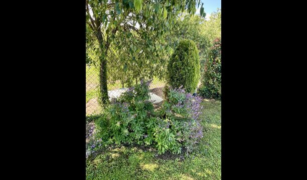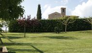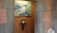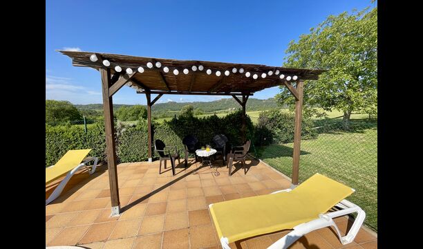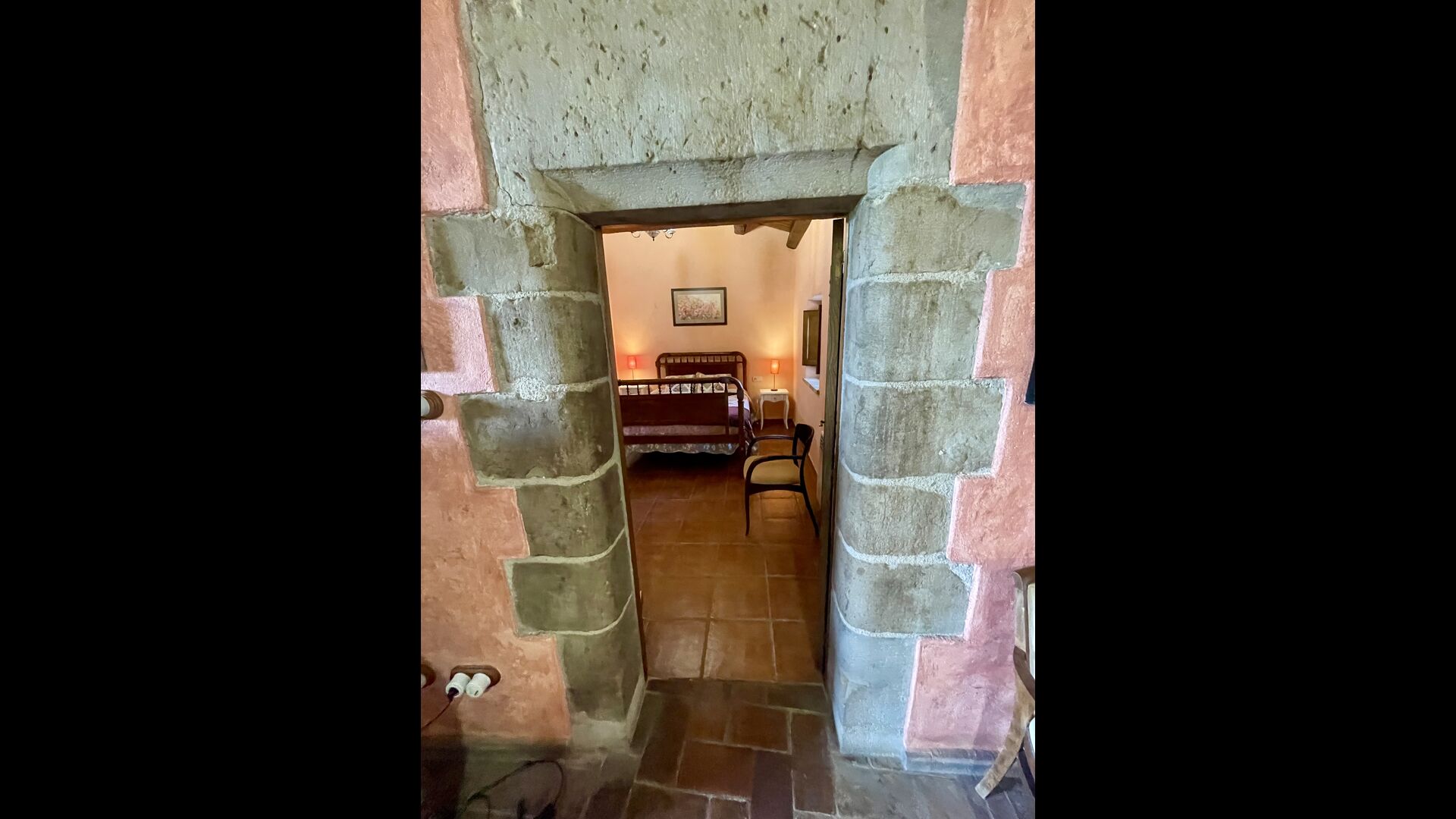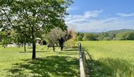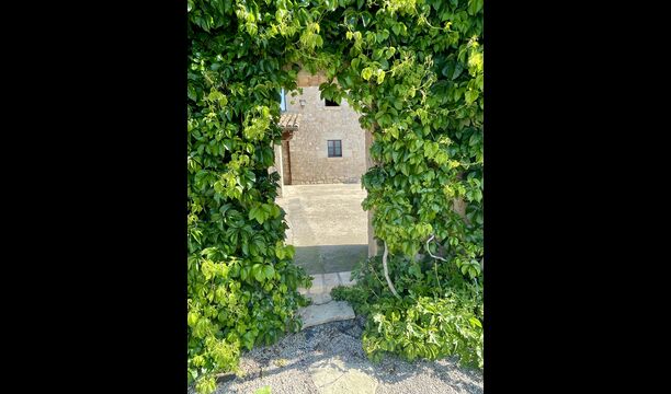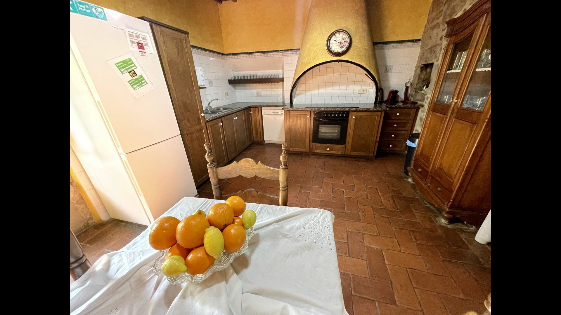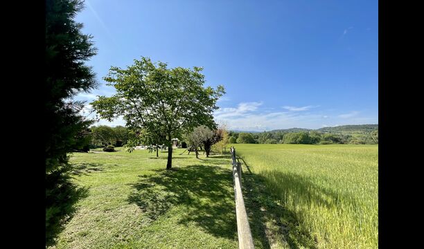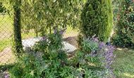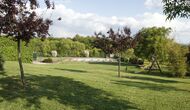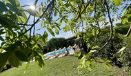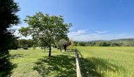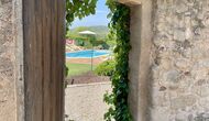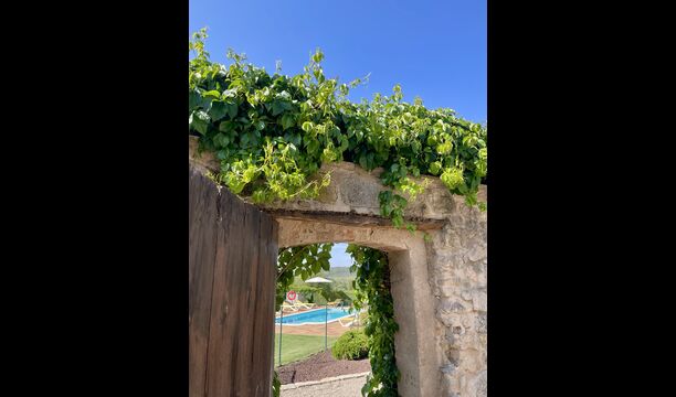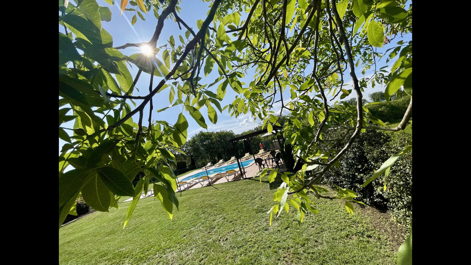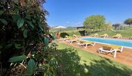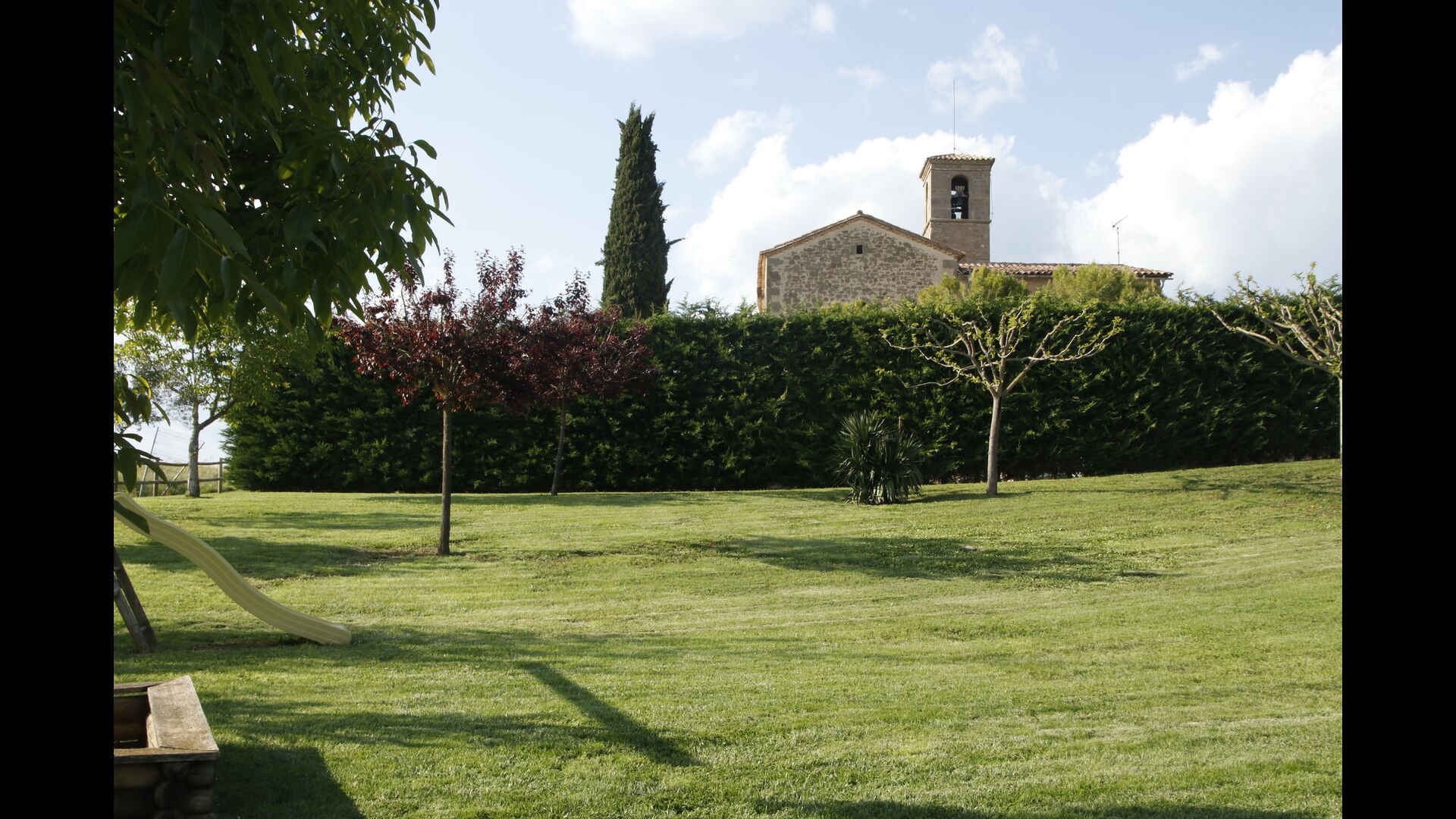 La impresionante puerta, lo suficientemente grande en la antigüedad para que entraran los coches de caballos, da acceso a la hermosa zona ajardinada y de piscina. En un extremo, el césped con algunos árboles que dan sombra. Además, hay un cajón de arena y columpios para los más pequeños, y algunas mesas, para comidas ligeras. En el otro extremo, la piscina con escalones romanos, esto es realmente muy agradable, cuando tienes niños pequeños en tu grupo. Con una bebida fría y un libro y con la hermosa vista sobre el paisaje montañoso con campos y bosques, la tranquilidad y los sonidos hacen desaparecer los últimos restos de la estresante vida diaria.