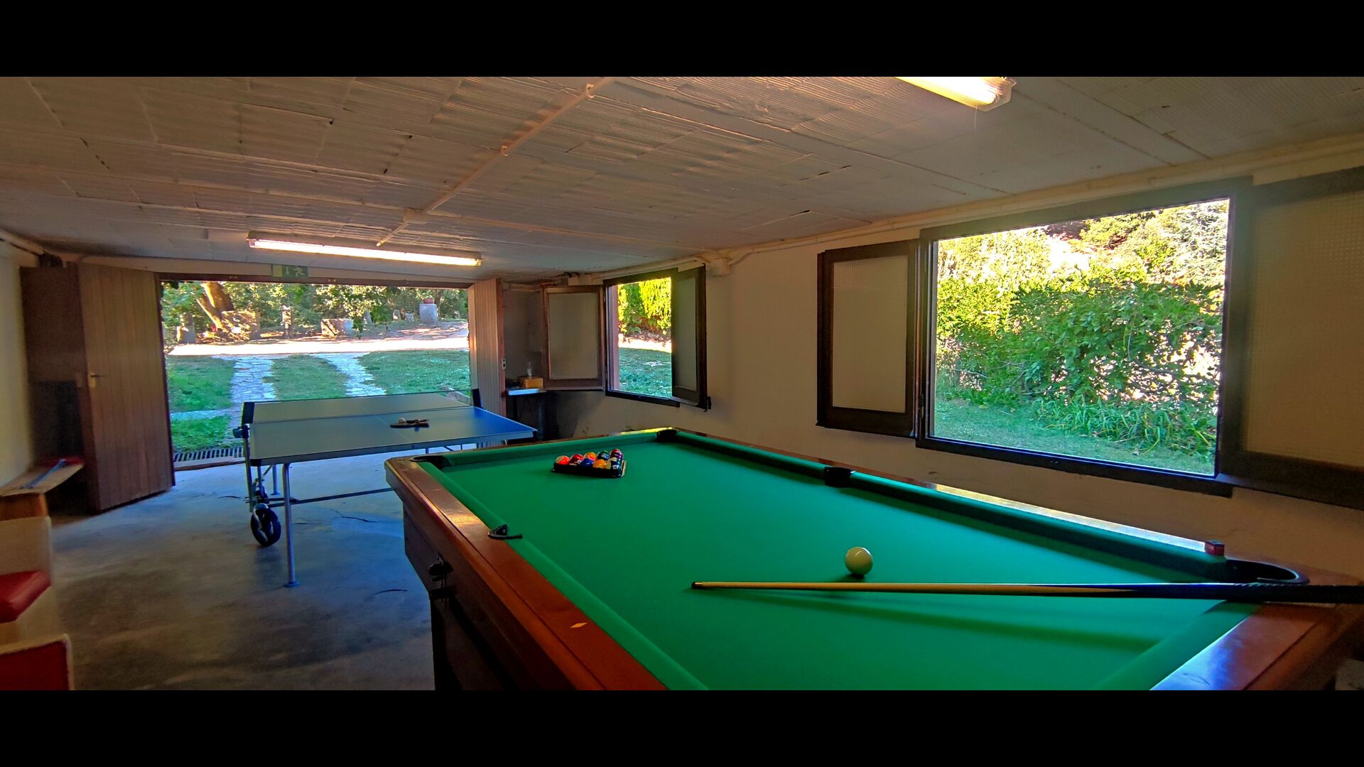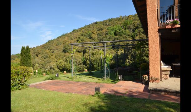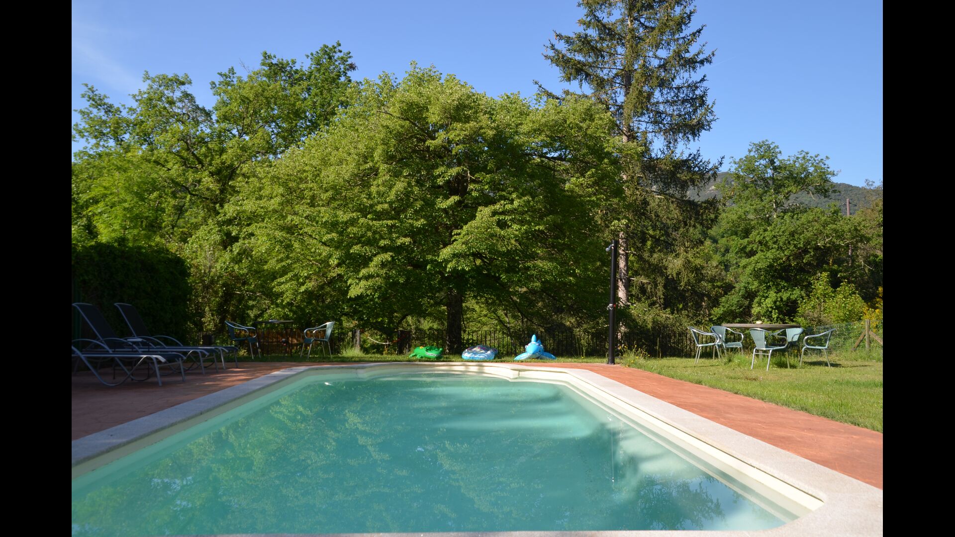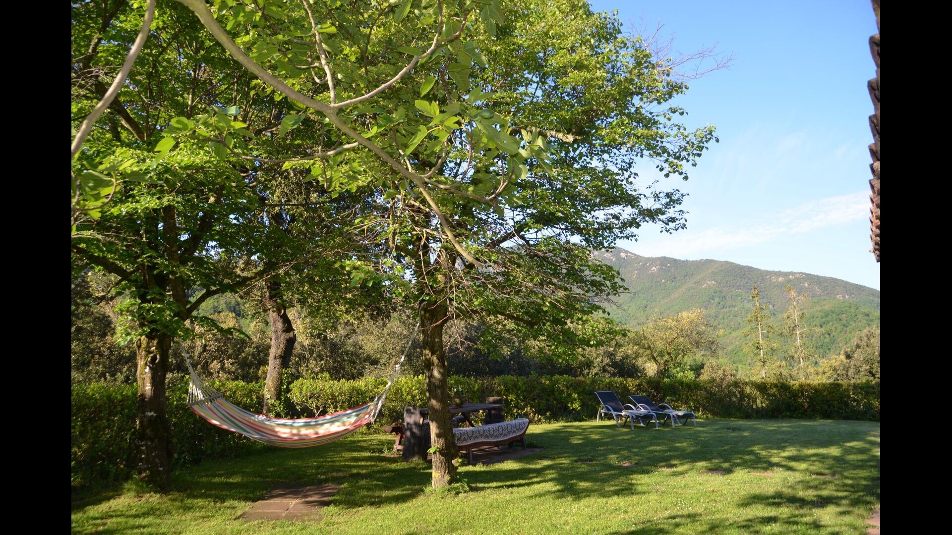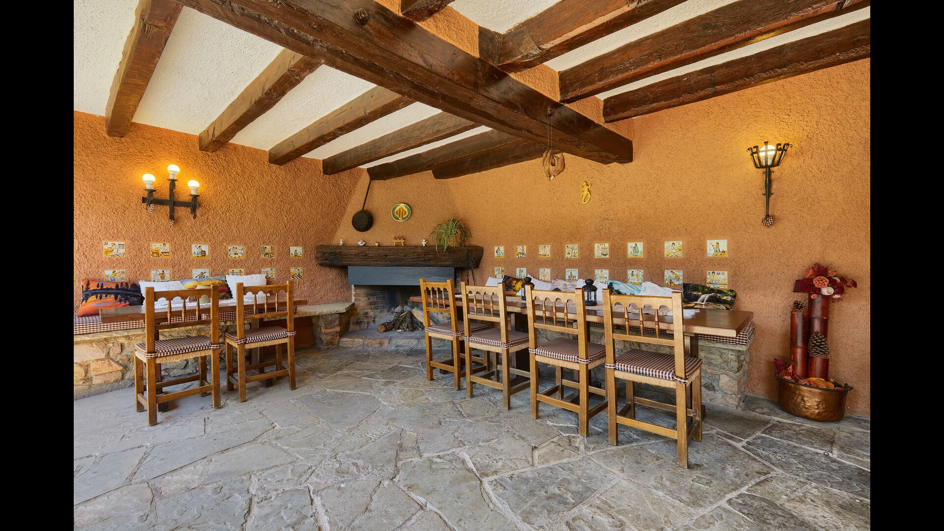A la izquierda de la casa, tienes un gran césped y un estanque cercado con patos y otras aves. Al otro lado de la casa, se encuentra la entrada. A la derecha de la entrada tiene una terraza cubierta al aire libre para cenar al aire libre. También hay otra zona de terraza al sol. Además, hay un césped con muchos árboles, que proporciona sombra en los cálidos días de verano catalanes. También hay una mesa de ping pong.