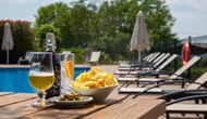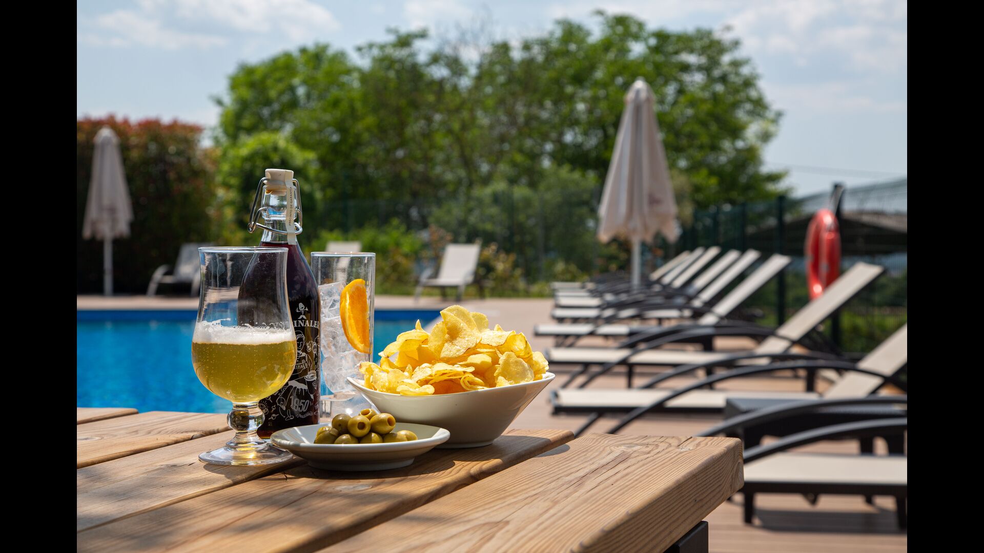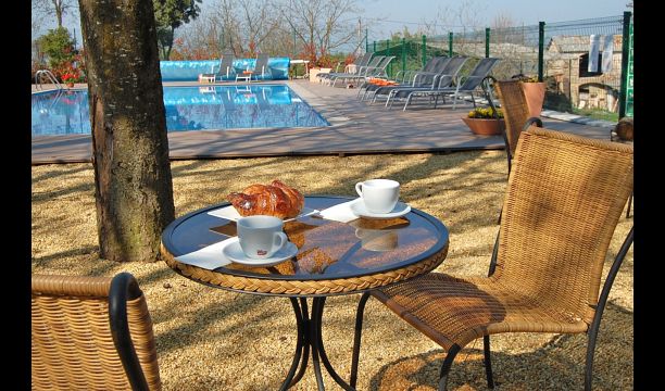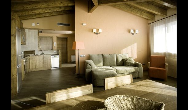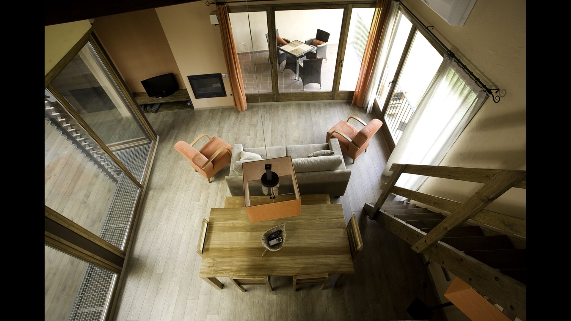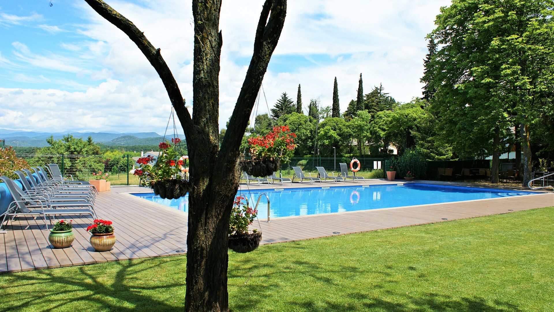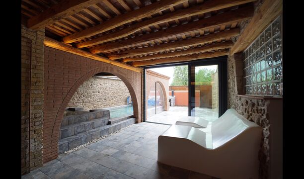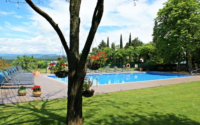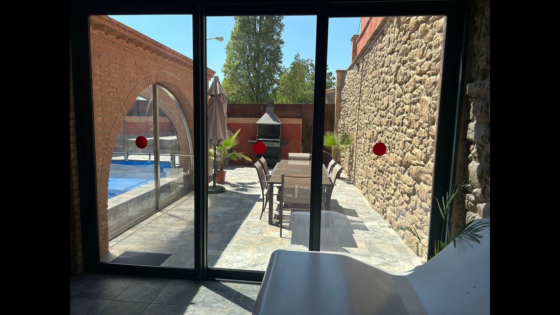 Además, la parte trasera de la casa se convirtió en la fantástica zona de la piscina con una gran piscina (17 x 5 metros), cafetería y salón compartido. mesas, aseos y vestuarios, y rincones con sombra y lugares soleados. La vista es impresionante, directamente a los Pirineos. Al reservar todos los apartamentos, esta área, por supuesto, será únicamente para su uso privado.