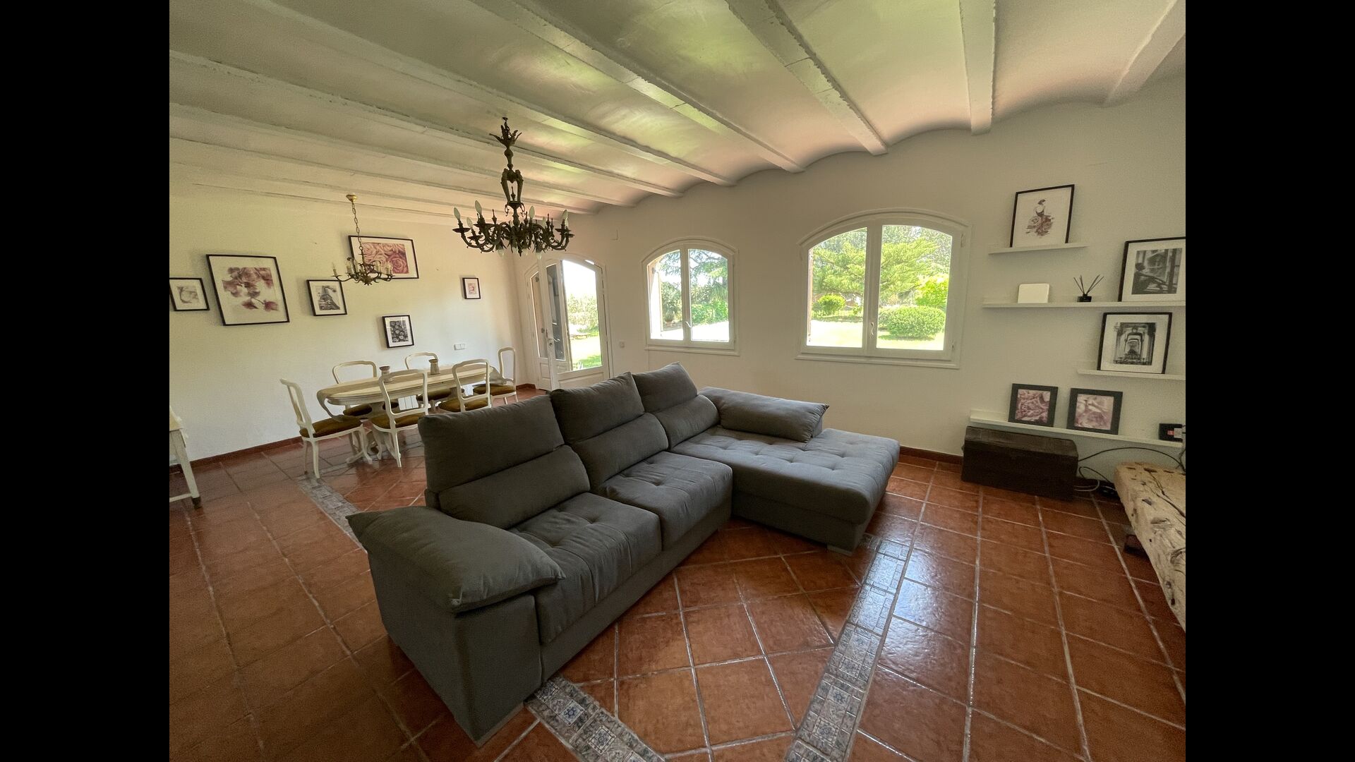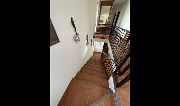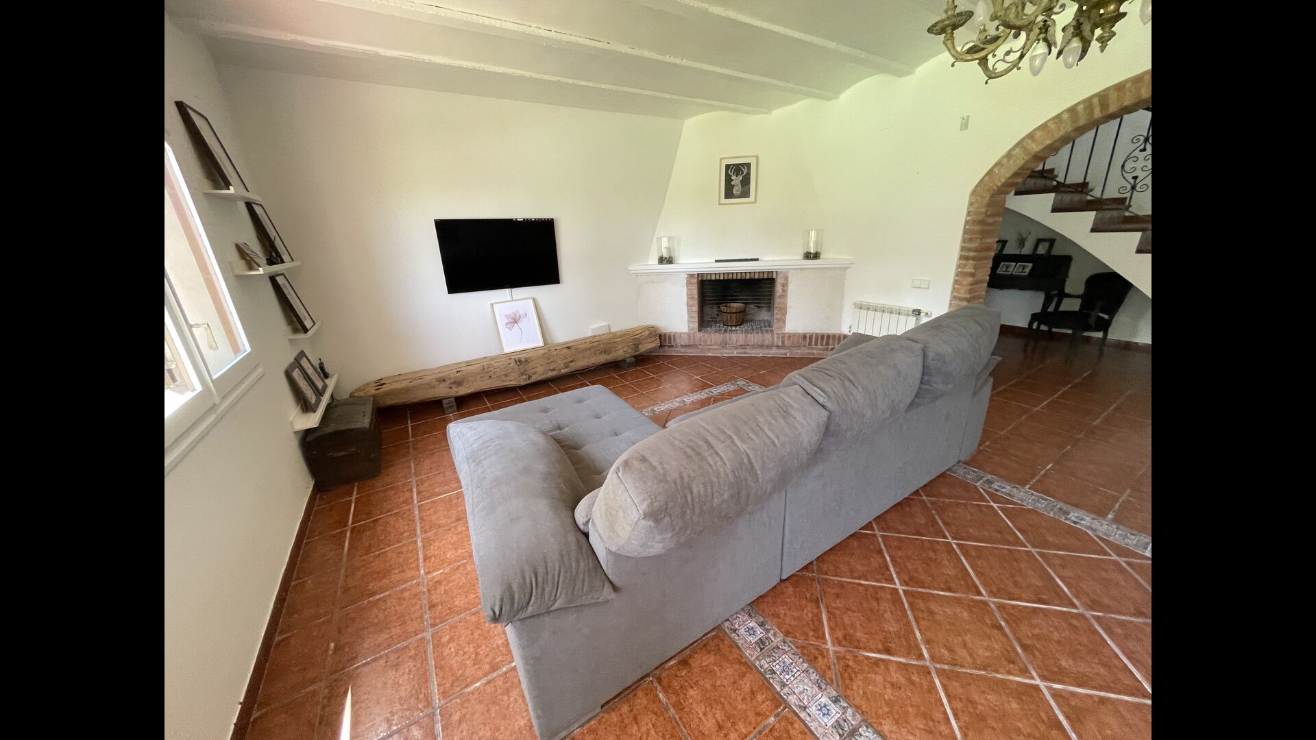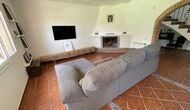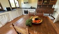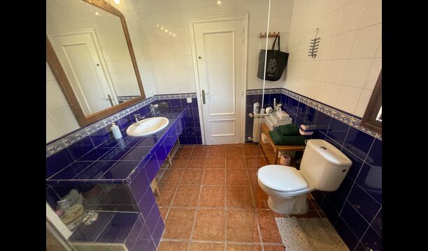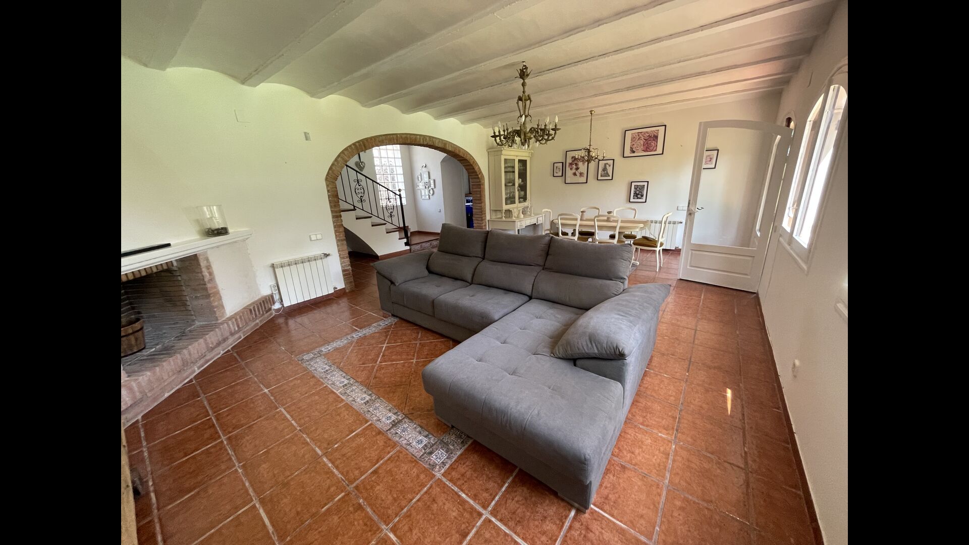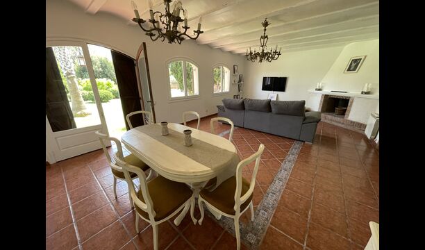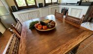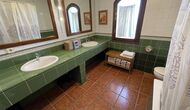 También hay una sala de estar con sofás y rincón de TV, así como un comedor más grande. También en la planta baja se encuentra un dormitorio y el primero de los dos amplios baños rústicos.