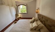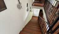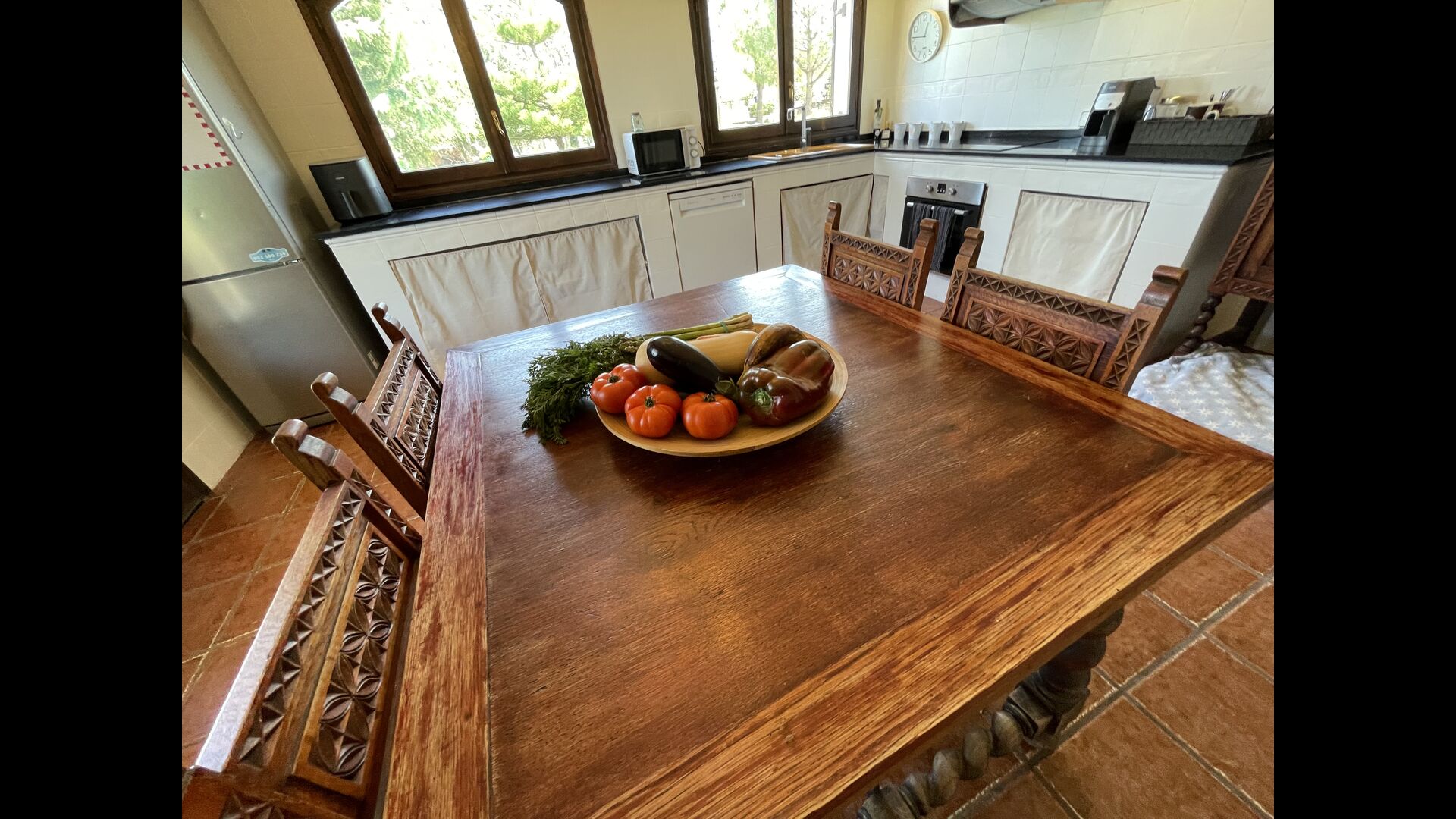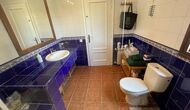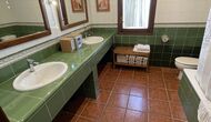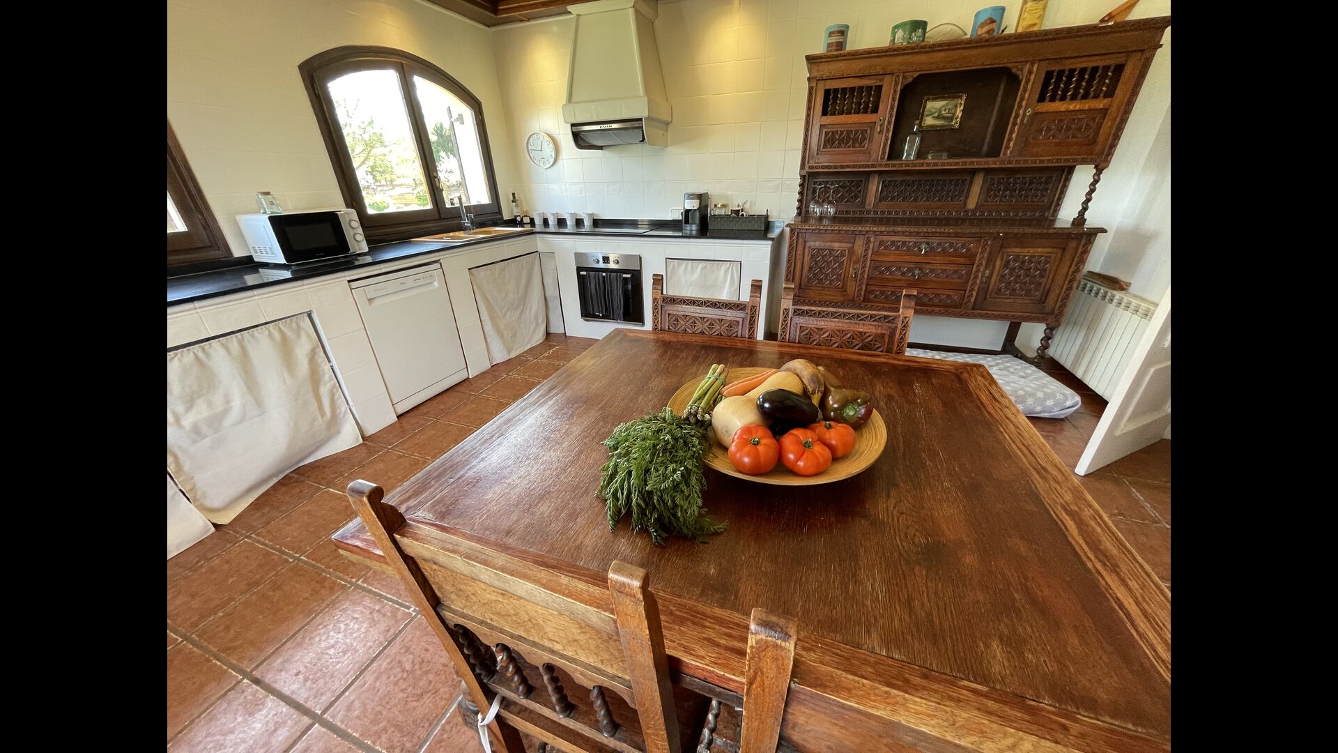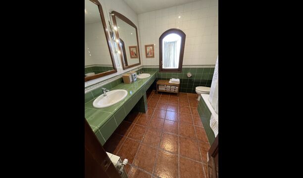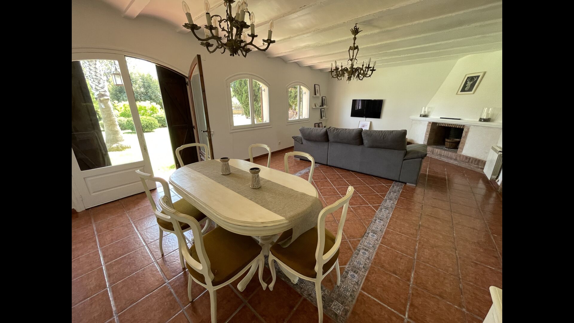 También hay una sala de estar con sofás y rincón de TV, así como un comedor más grande. También en la planta baja se encuentra un dormitorio y el primero de los dos amplios baños rústicos.