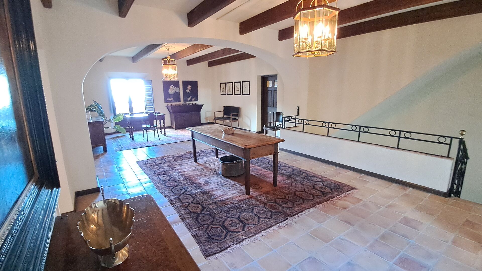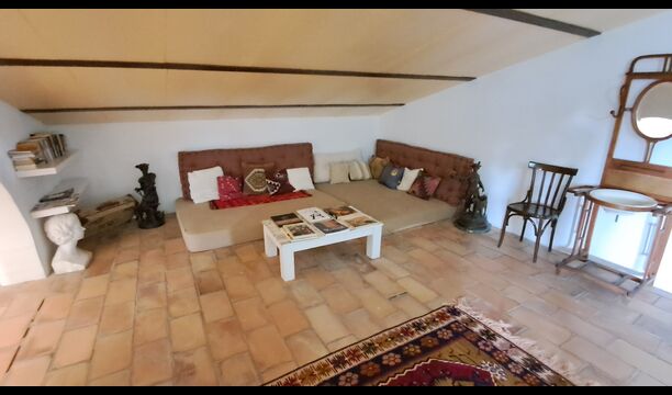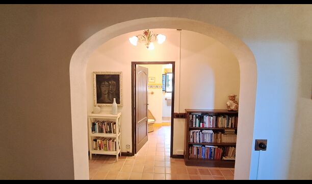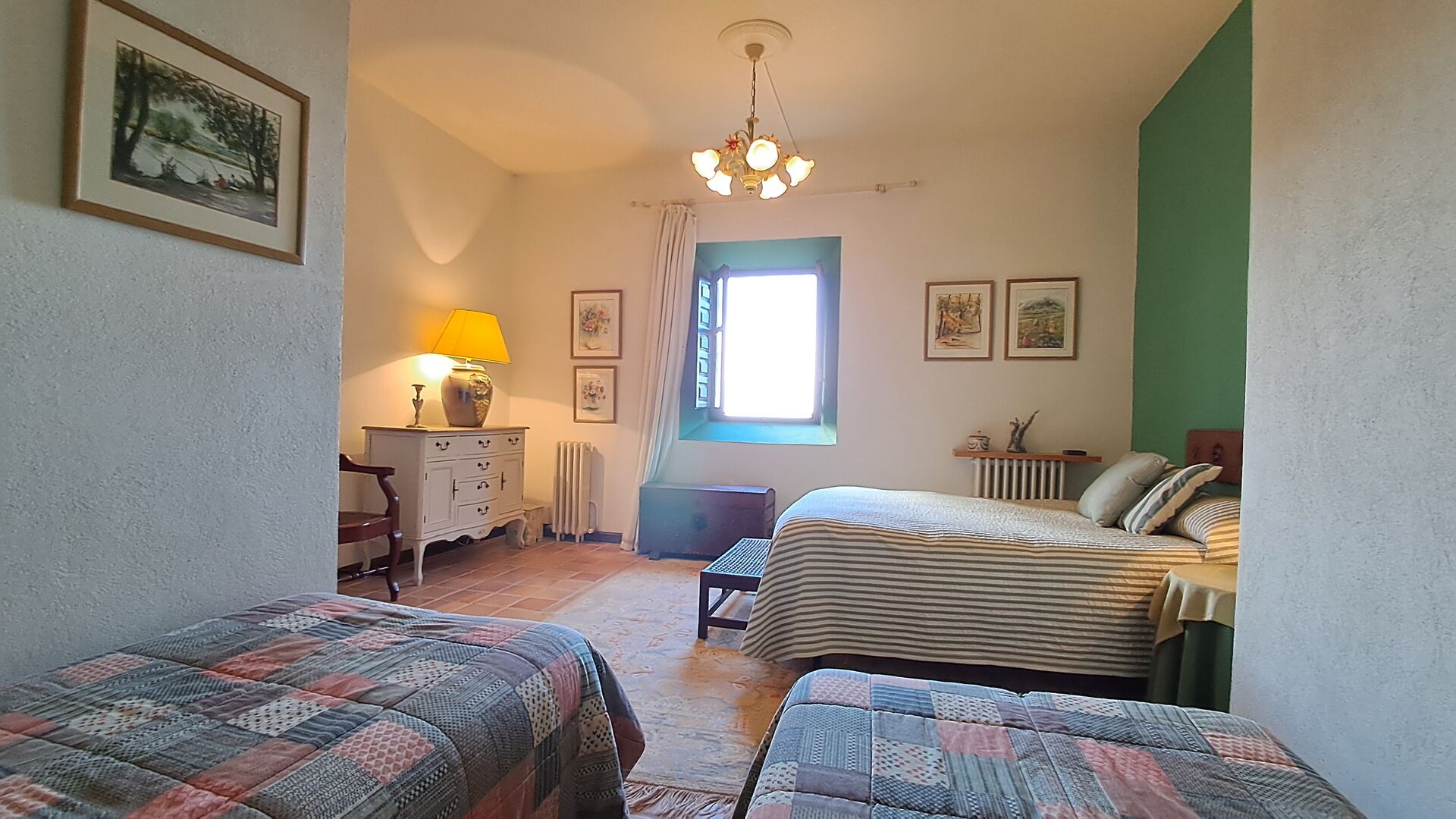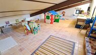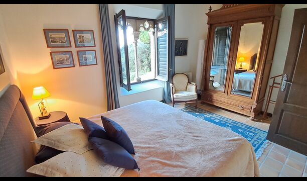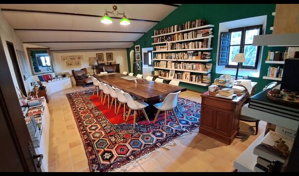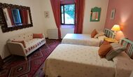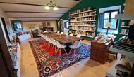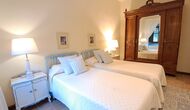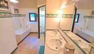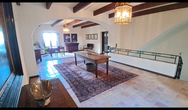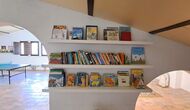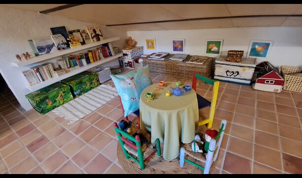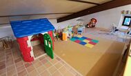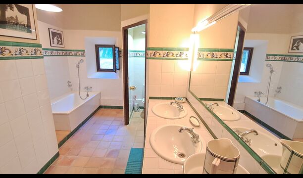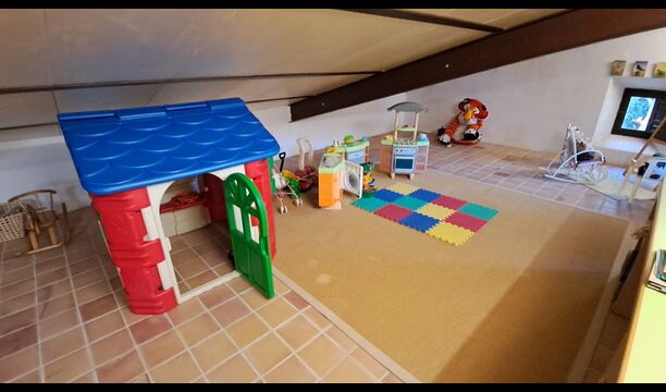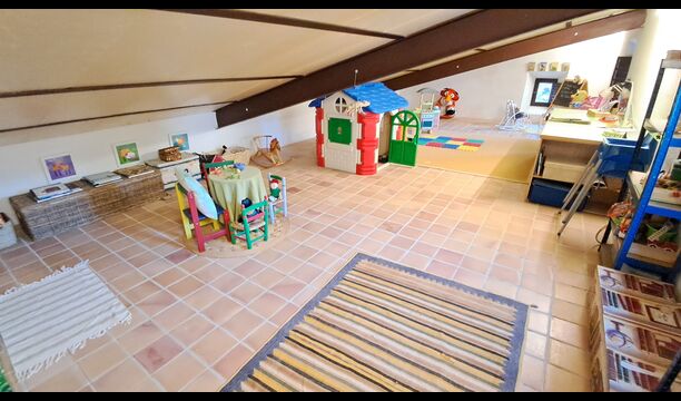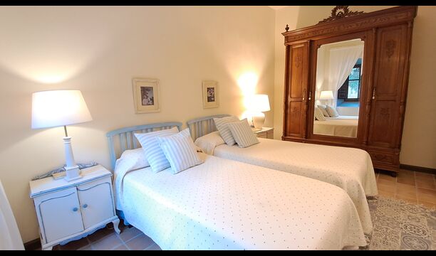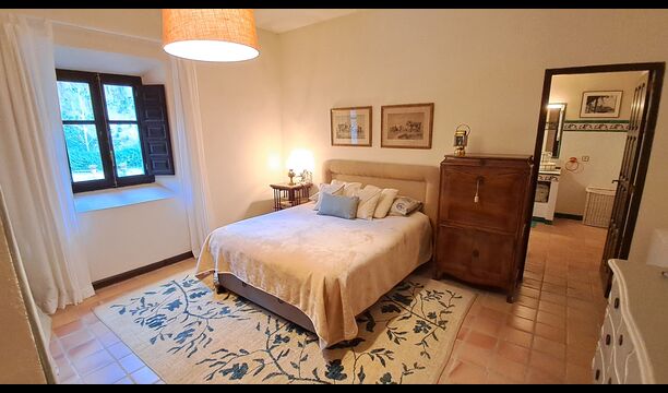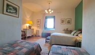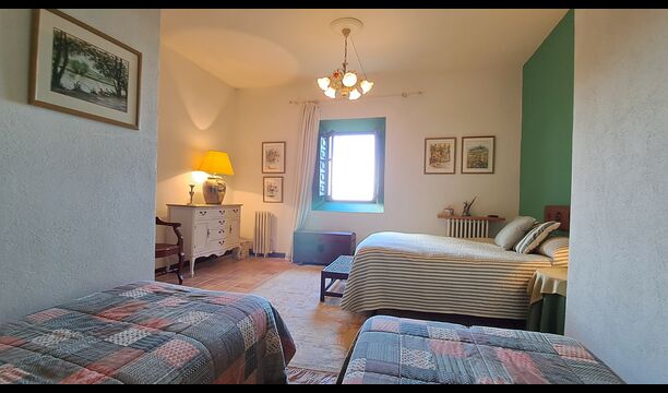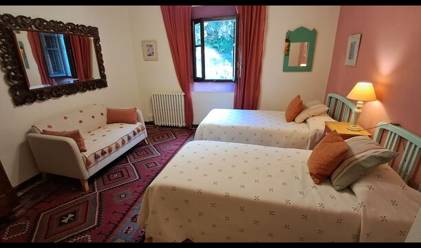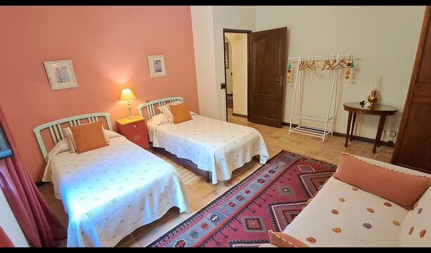 Desde el elegante vestíbulo se accede a la primera planta y a un amplio recibidor. A un lado, encontrará una habitación doble muy amplia con baño privado, también muy amplio y con bañera. A continuación, hay una sala de reuniones muy grande, utilizada principalmente cuando la casa alberga reuniones de empresa. También hay muchos libros, y su segunda función es la de biblioteca. Por supuesto, puede leer los libros si lo desea. Junto a la sala principal, hay una habitación grande con muchos juguetes y libros para niños pequeños. Al otro lado del pasillo, un largo pasillo da acceso a cuatro habitaciones más. Con vistas al valle, hay una acogedora habitación doble y una habitación familiar con una cama doble y dos camas individuales, ambas con hermosas vistas y que comparten un baño con bañera. Al otro lado, hay dos habitaciones dobles más. Como toda la casa, está decorada con gusto y respetando cuidadosamente la historia del lugar. Dos dormitorios comparten un baño grande con ducha.