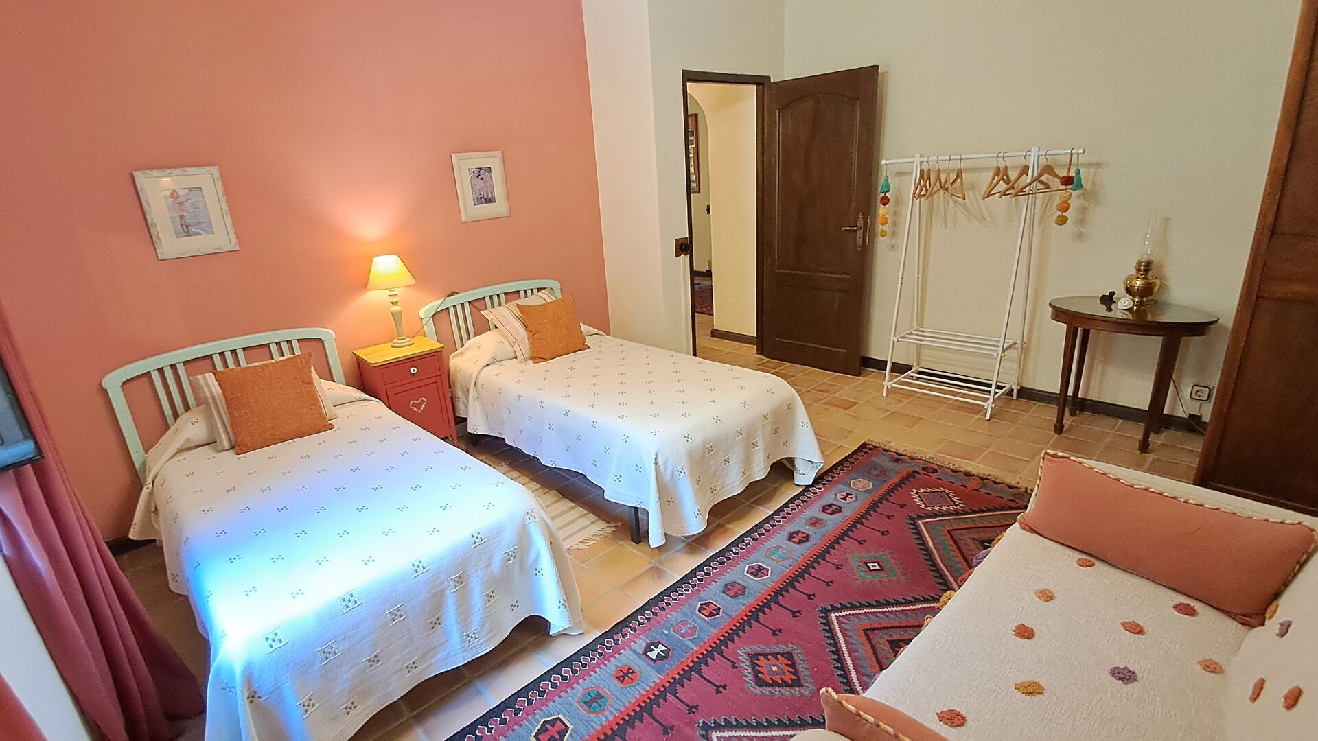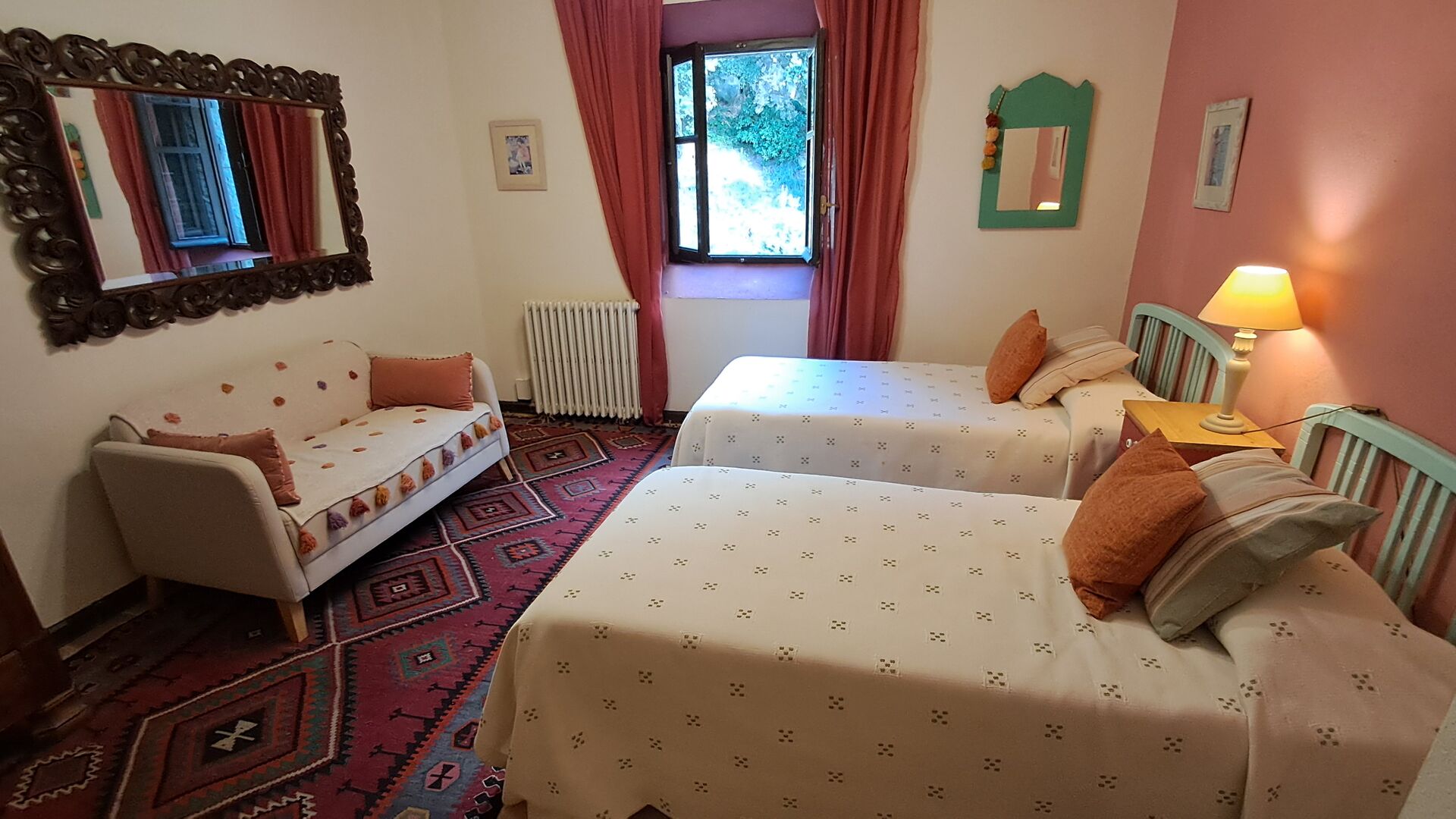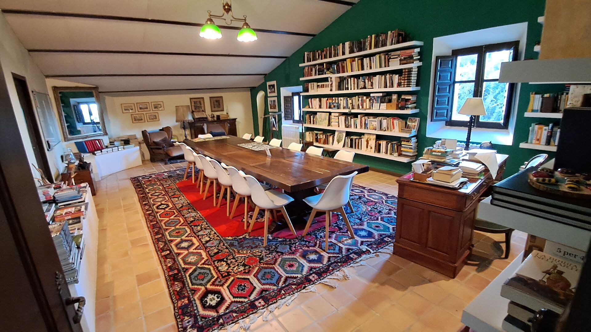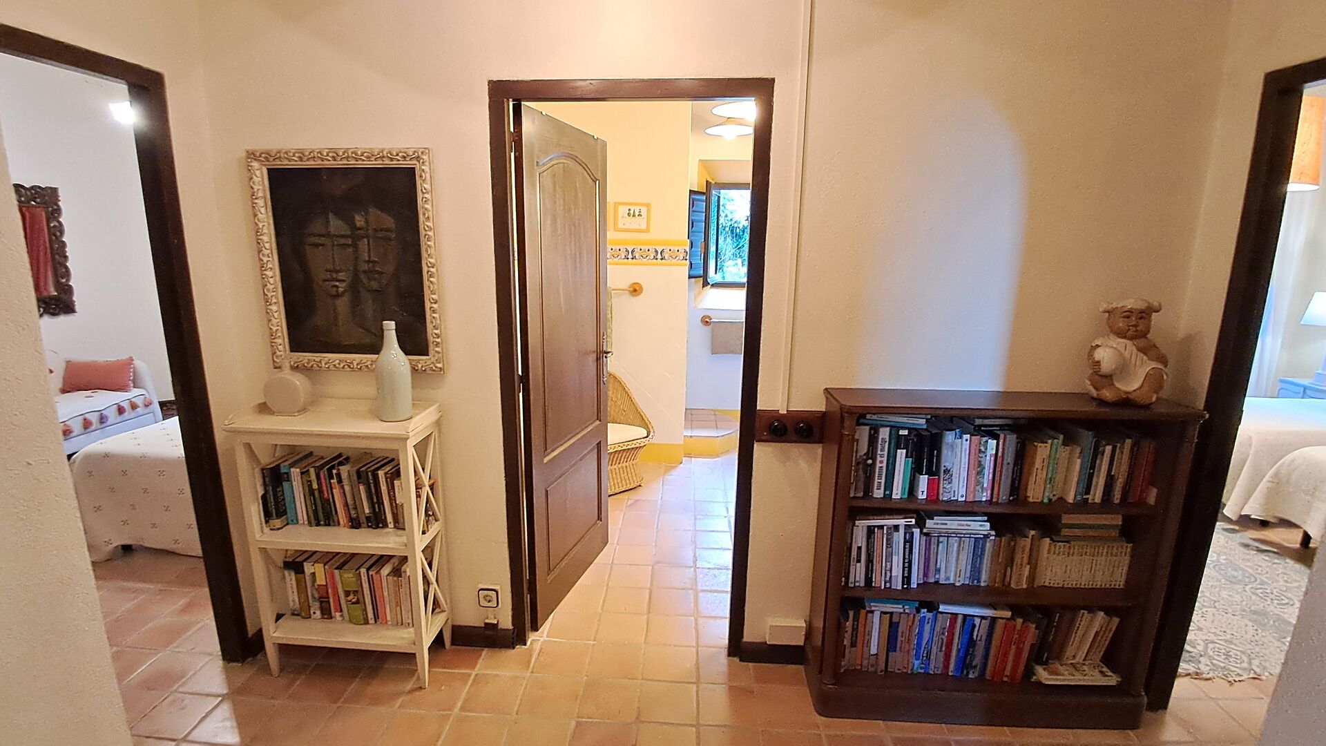 Desde el elegante vestíbulo se accede a la primera planta y a un amplio recibidor. A un lado, encontrará una habitación doble muy amplia con baño privado, también muy amplio y con bañera. A continuación, hay una sala de reuniones muy grande, utilizada principalmente cuando la casa alberga reuniones de empresa. También hay muchos libros, y su segunda función es la de biblioteca. Por supuesto, puede leer los libros si lo desea. Junto a la sala principal, hay una habitación grande con muchos juguetes y libros para niños pequeños. Al otro lado del pasillo, un largo pasillo da acceso a cuatro habitaciones más. Con vistas al valle, hay una acogedora habitación doble y una habitación familiar con una cama doble y dos camas individuales, ambas con hermosas vistas y que comparten un baño con bañera. Al otro lado, hay dos habitaciones dobles más. Como toda la casa, está decorada con gusto y respetando cuidadosamente la historia del lugar. Dos dormitorios comparten un baño grande con ducha.