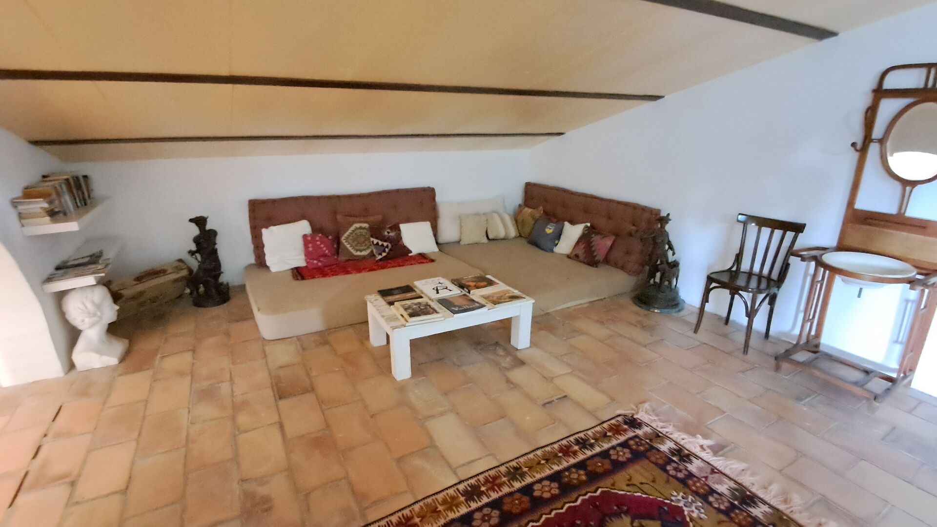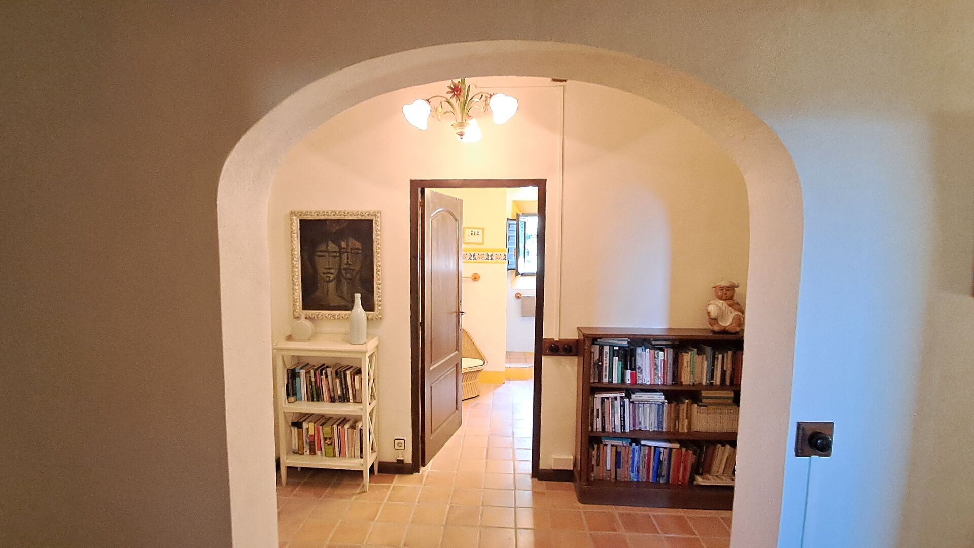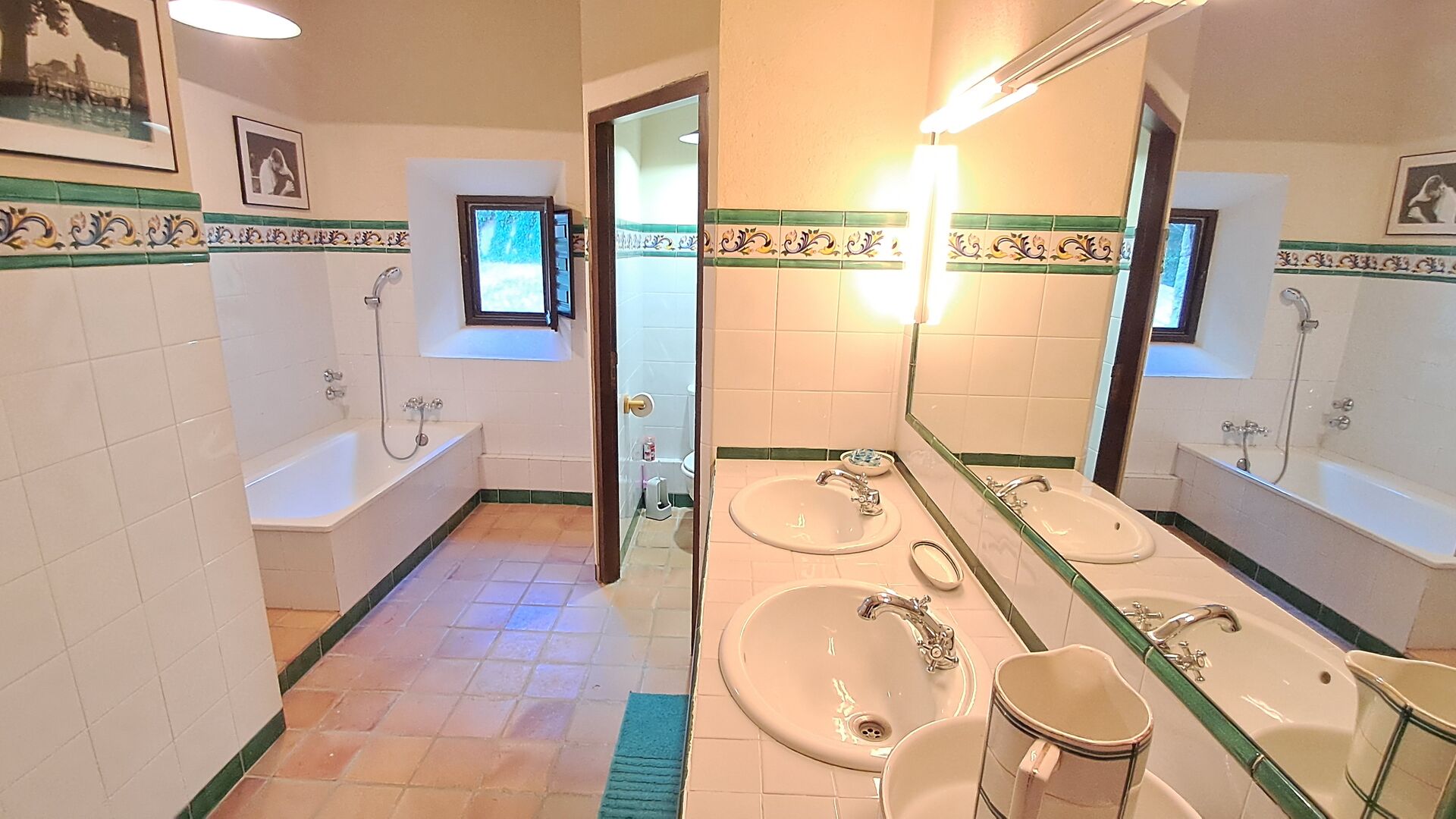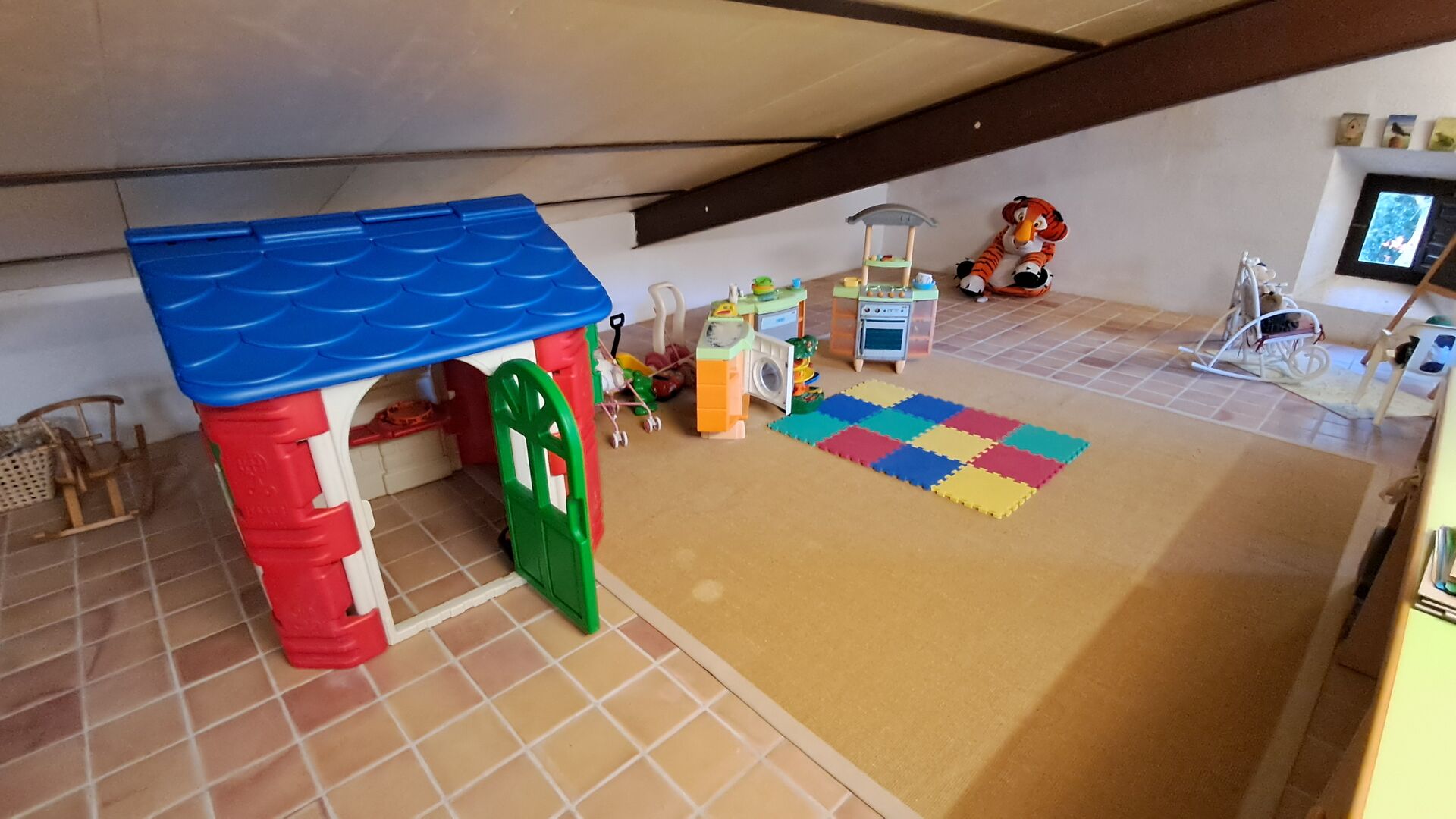 Desde el elegante vestíbulo se accede a la primera planta y a un amplio recibidor. A un lado, encontrará una habitación doble muy amplia con baño privado, también muy amplio y con bañera. A continuación, hay una sala de reuniones muy grande, utilizada principalmente cuando la casa alberga reuniones de empresa. También hay muchos libros, y su segunda función es la de biblioteca. Por supuesto, puede leer los libros si lo desea. Junto a la sala principal, hay una habitación grande con muchos juguetes y libros para niños pequeños. Al otro lado del pasillo, un largo pasillo da acceso a cuatro habitaciones más. Con vistas al valle, hay una acogedora habitación doble y una habitación familiar con una cama doble y dos camas individuales, ambas con hermosas vistas y que comparten un baño con bañera. Al otro lado, hay dos habitaciones dobles más. Como toda la casa, está decorada con gusto y respetando cuidadosamente la historia del lugar. Dos dormitorios comparten un baño grande con ducha.