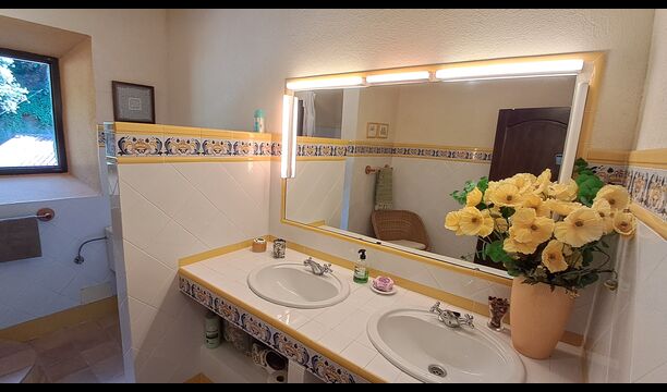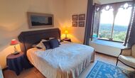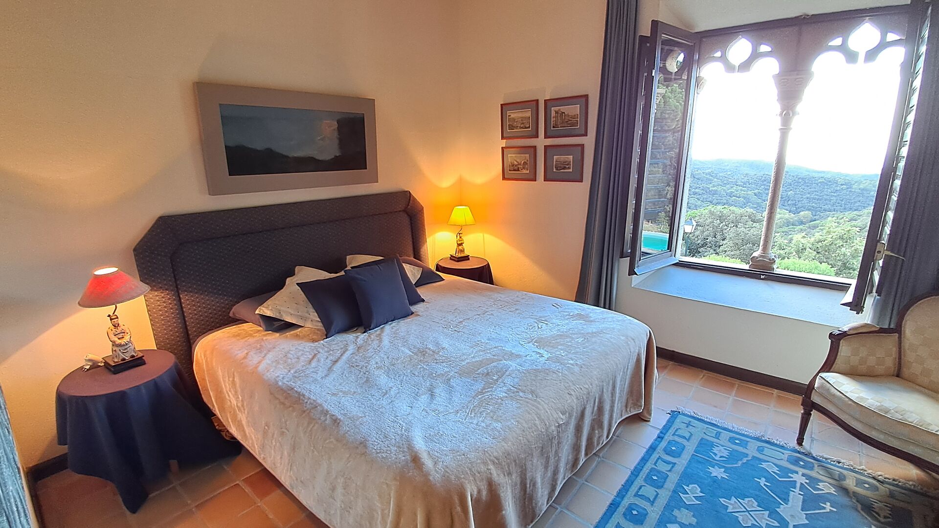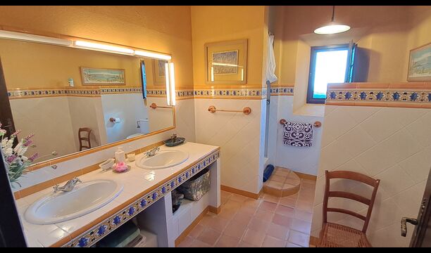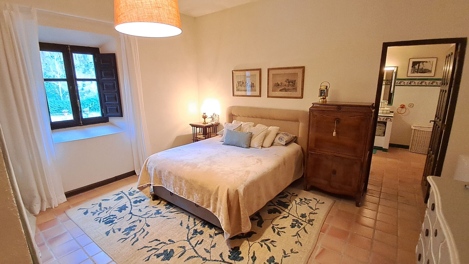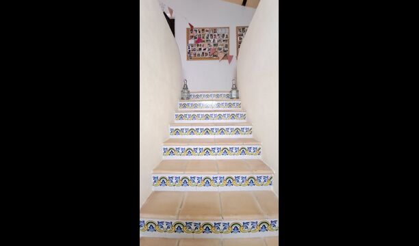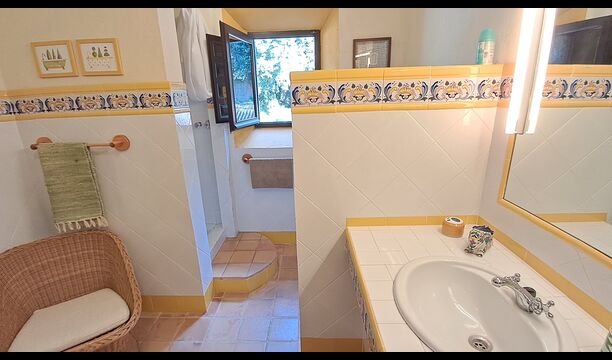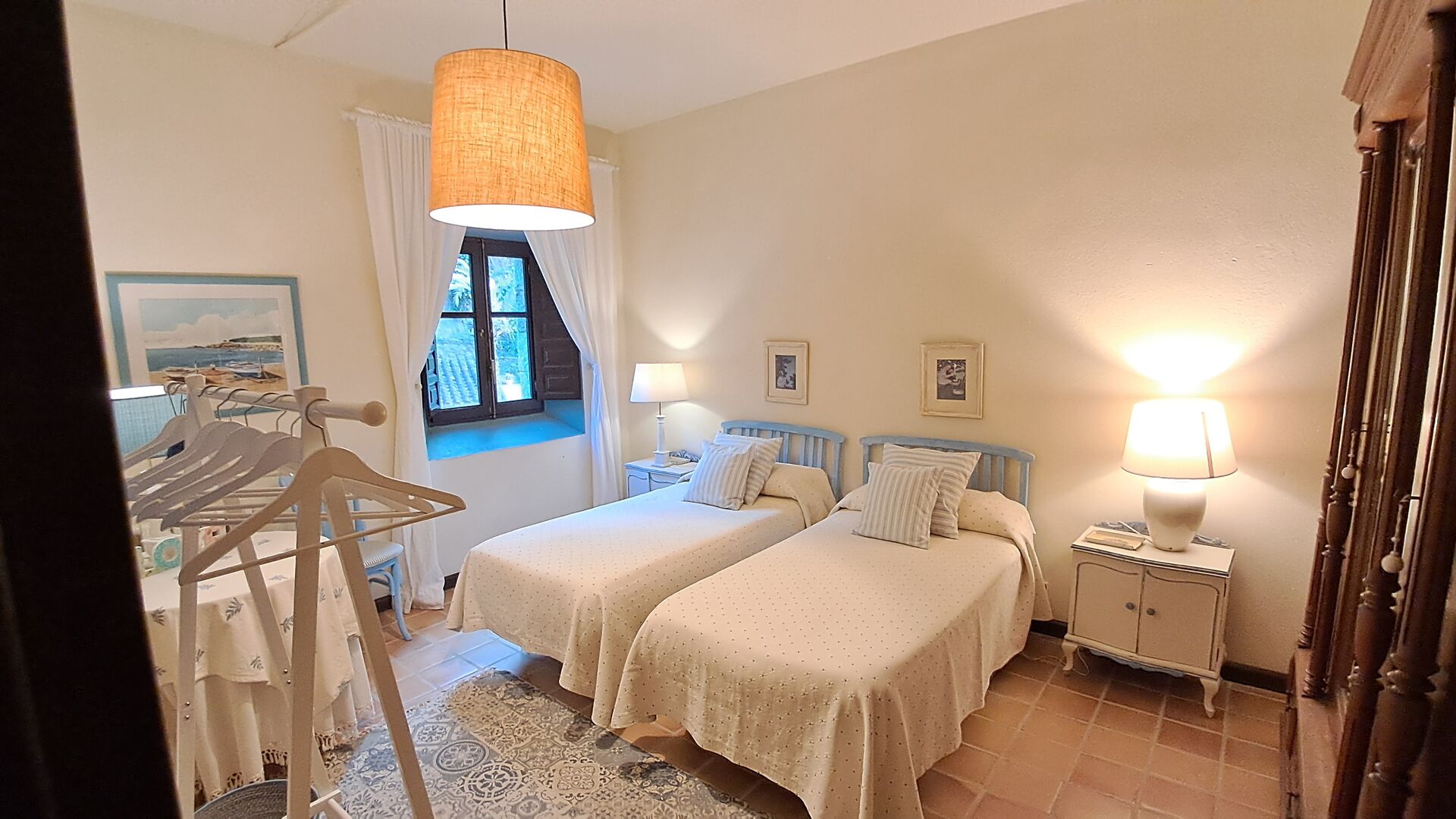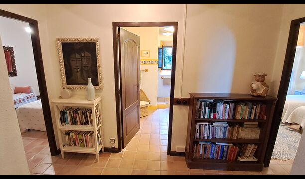 El esposo de Patricia es diseñador de cocinas, por lo que la estufa fue hecha a medida para la casa y, en general, la cocina es fantástica si te gusta cocinar. También hay un comedor muy agradable con acceso directo al jardín, donde hay una gran terraza cubierta, ideal para comer al aire libre, y cómodos sofás para tomar una copa o un café mientras disfrutas de las increíbles vistas. En la planta baja también encontrarás una amplia sala de estar con sofás, televisión e incluso una pantalla enrollable, si traes un proyector. Desde la sala de estar se accede a un pasillo con dos dormitorios grandes y bonitos que comparten un baño con bañera y ducha.